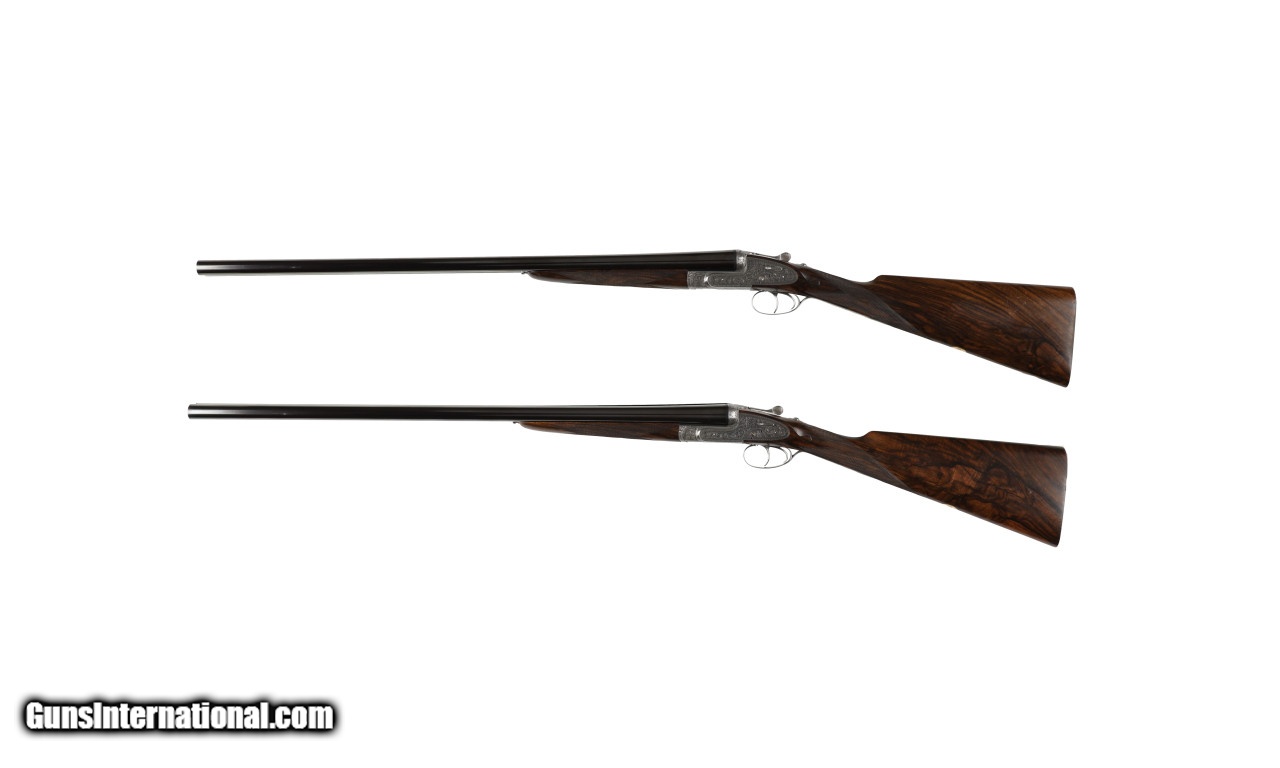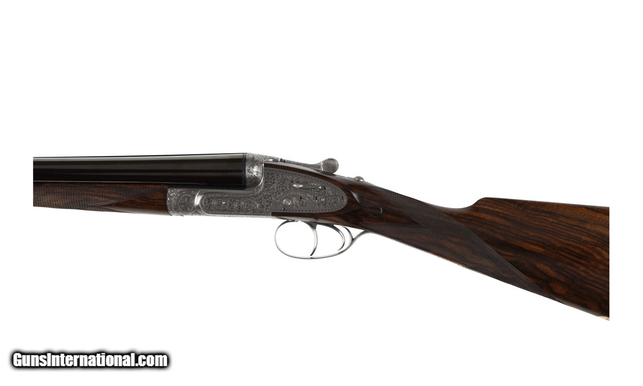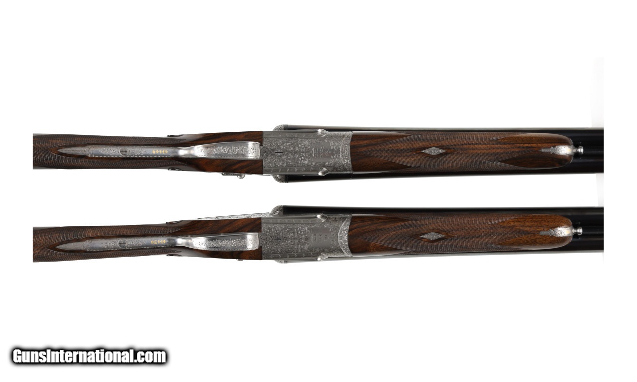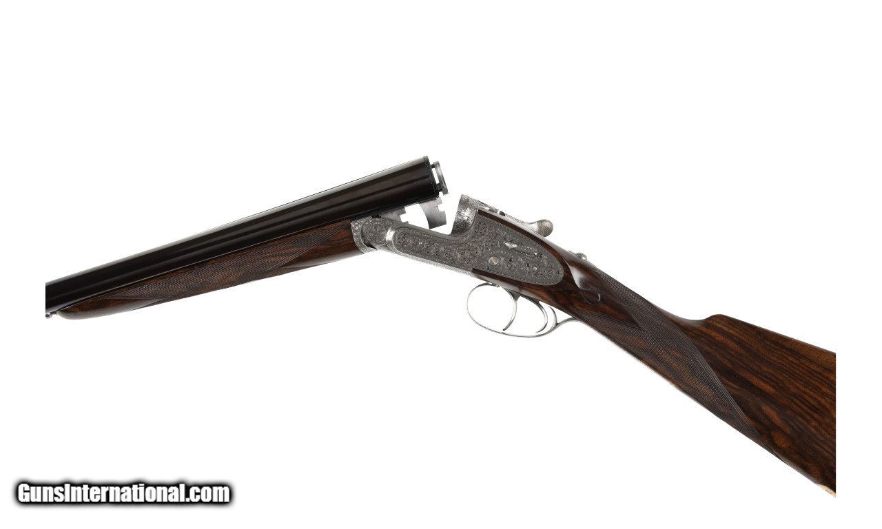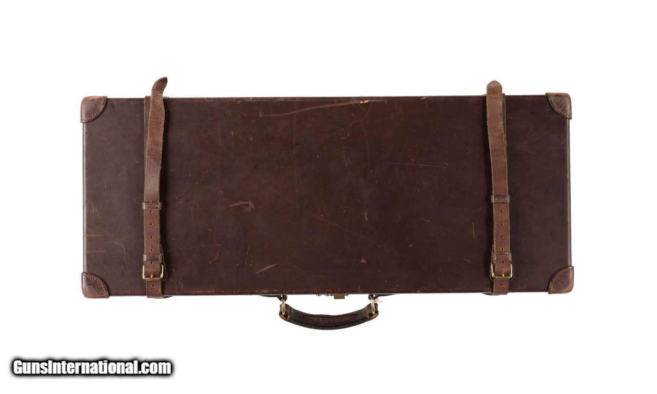 Description: Assisted opening. Right hand beaded trigger guards. Engraved gold ovals. SOLD Manufacturer: Holland & Holland Model: Royal Pair Caliber Info: 12 Gauge Chambers: 2 3/4 Ejectors: Yes Condition: Preowned Metal Condition: Very Good Barrels: 28 Action: Sidelock Triggers: Double Gauge Info: 12 Gauge Stock Comb: 1 1/2 Stock Heel: 2 3/8 Stock Cast: Off Fore End: Splinter LOP: 15 1/2 Rib: Game Chokes: 1/4 & 1/2 Case: Leather Luggage |