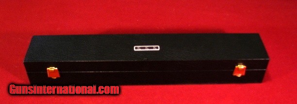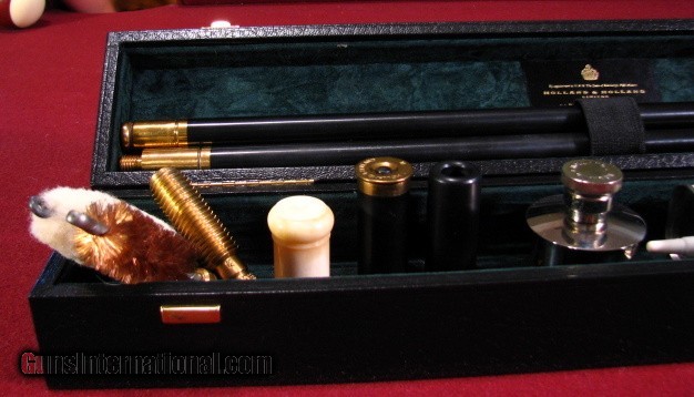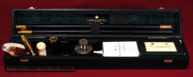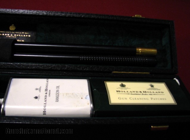 Description: 12 Gauge Holland & Holland cleaning kit in leather covered wood box lined with green felt baize. Original owners initials [KKK] on lid. Complete with two piece ebony cleaning rod, brush, mop, and jag, H&H ebony snap caps, bone striker bottle, H&H oil bottle, oil, and patches. Appears new and unused. A great accessory for that special Holland side by side. SOLD |