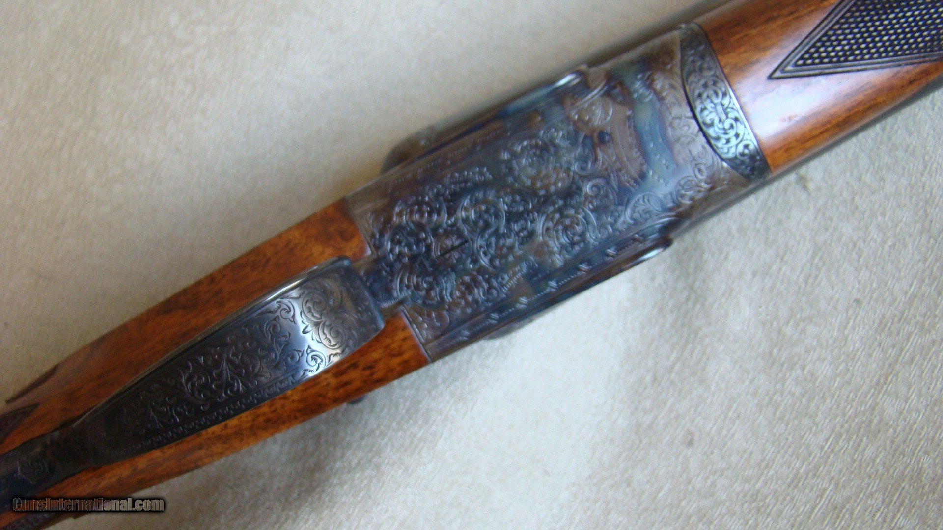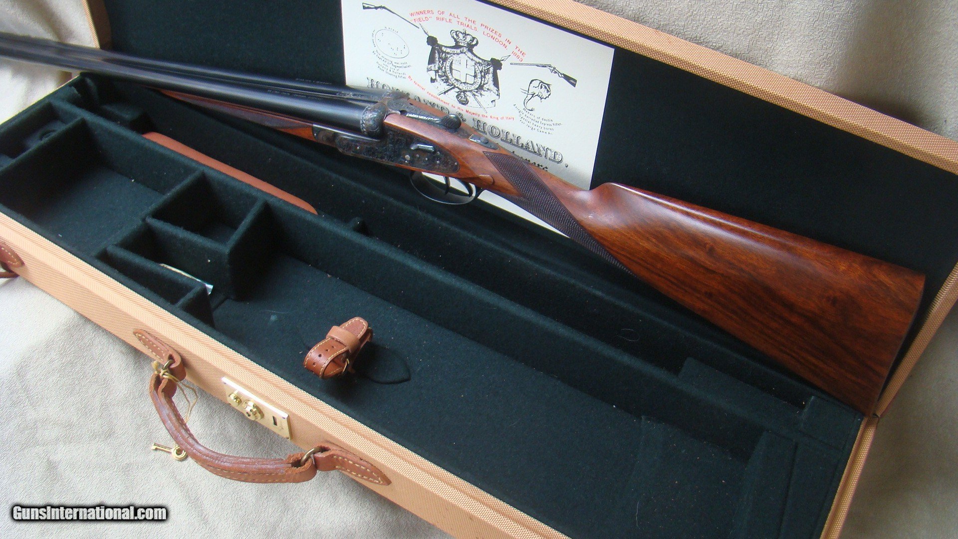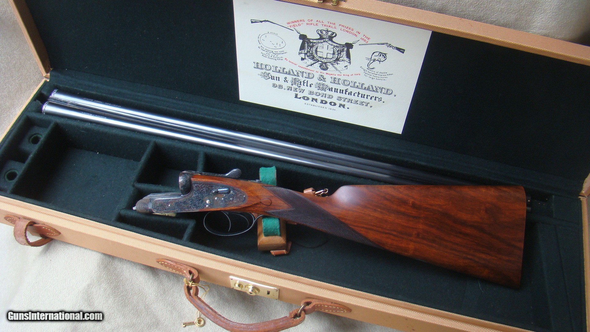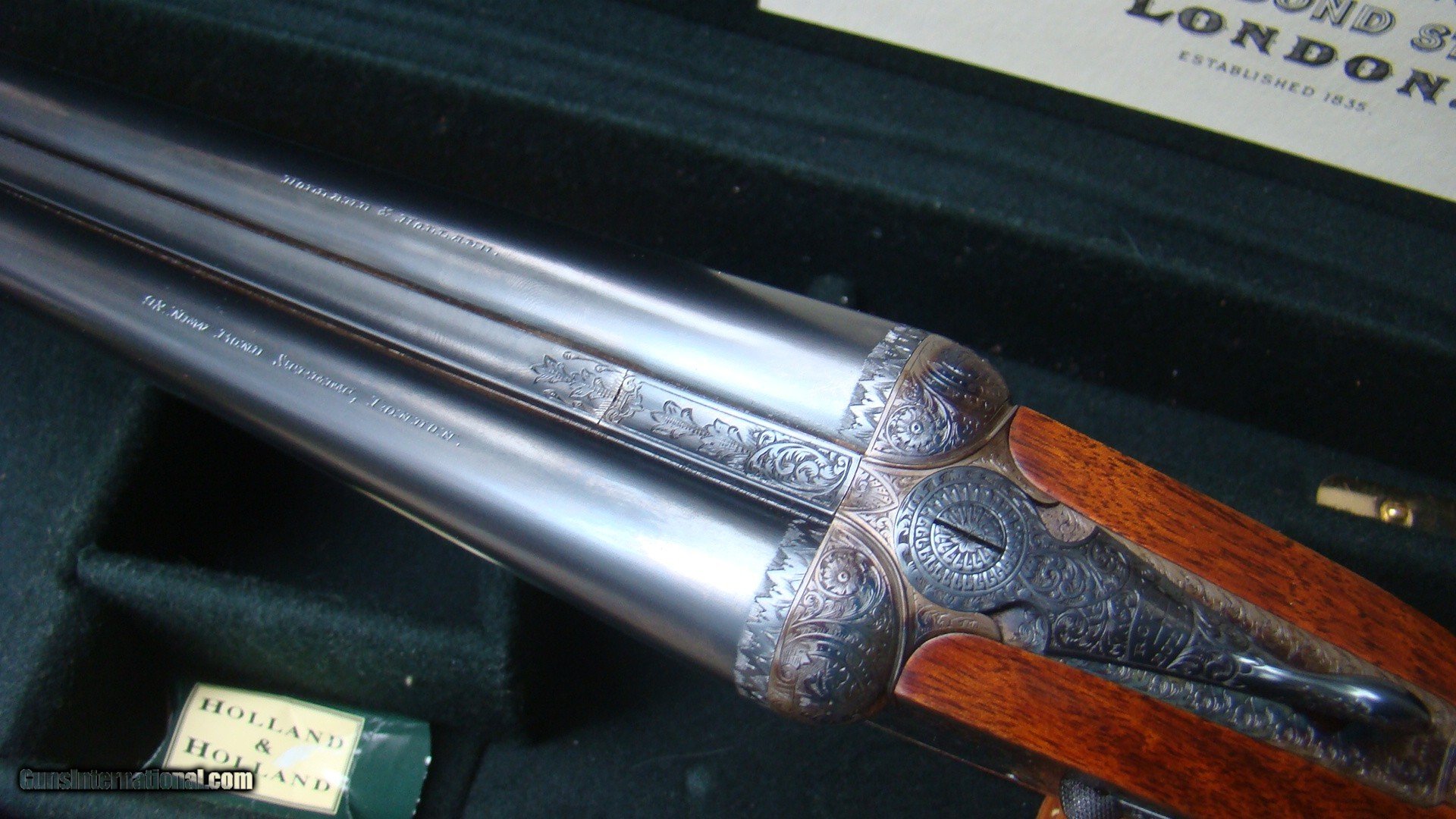 Description: Rare Holland & Holland 16 bore, 28" chopperlump barrels, original 2-3/4 chambers, choked modified and full (.014/.025), bores measure as new .668/.668. Finished in 1927, per the Holland & Holland factory ledger, this vintage self-opener features automatic ejectors and hand-detachable locks. Engraved in the H&H Royal pattern, the underside of the action is inscribed "Royal Self Opener". The gun has been completely restored to as new condition, fabulous case colors, flat top checkering as one would expect on a Best London Gun. Double triggers. Stock measures 1-1/2", 2-3/8" heel, 14-5/8" LOP to a checkered butt. Hard to find gun, built as an original 2-3/4. Weighs in at 6 lbs, 2 oz. A true scaled 16 bore top-of-the-line Holland & Holland. Cased. SOLD |