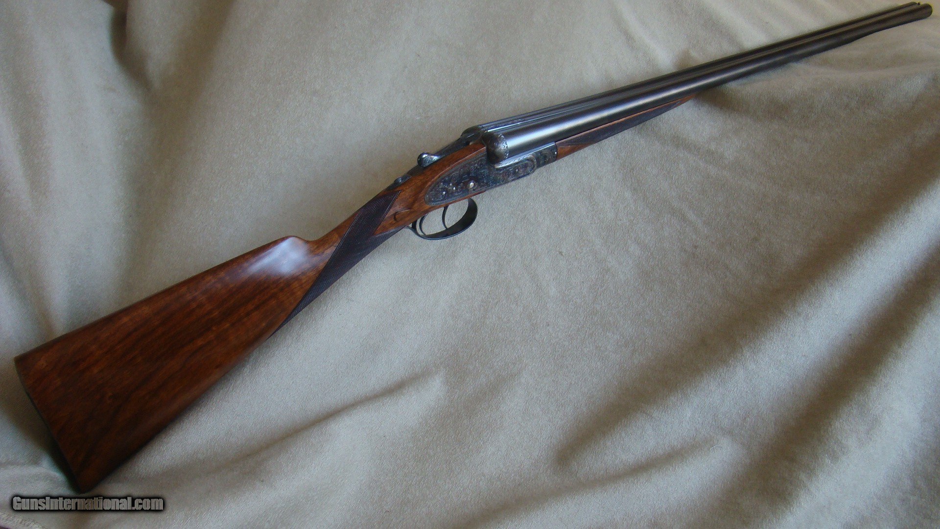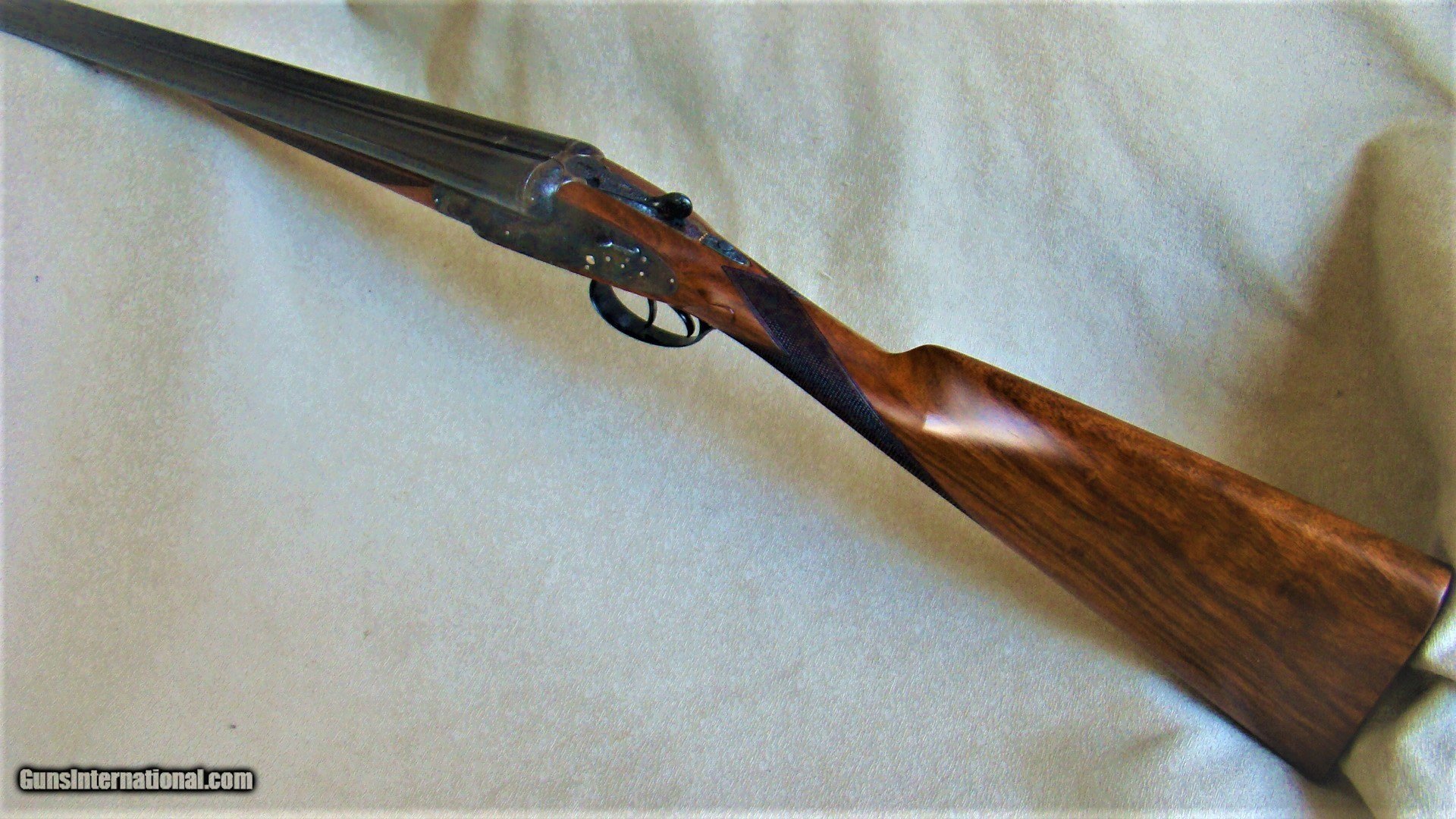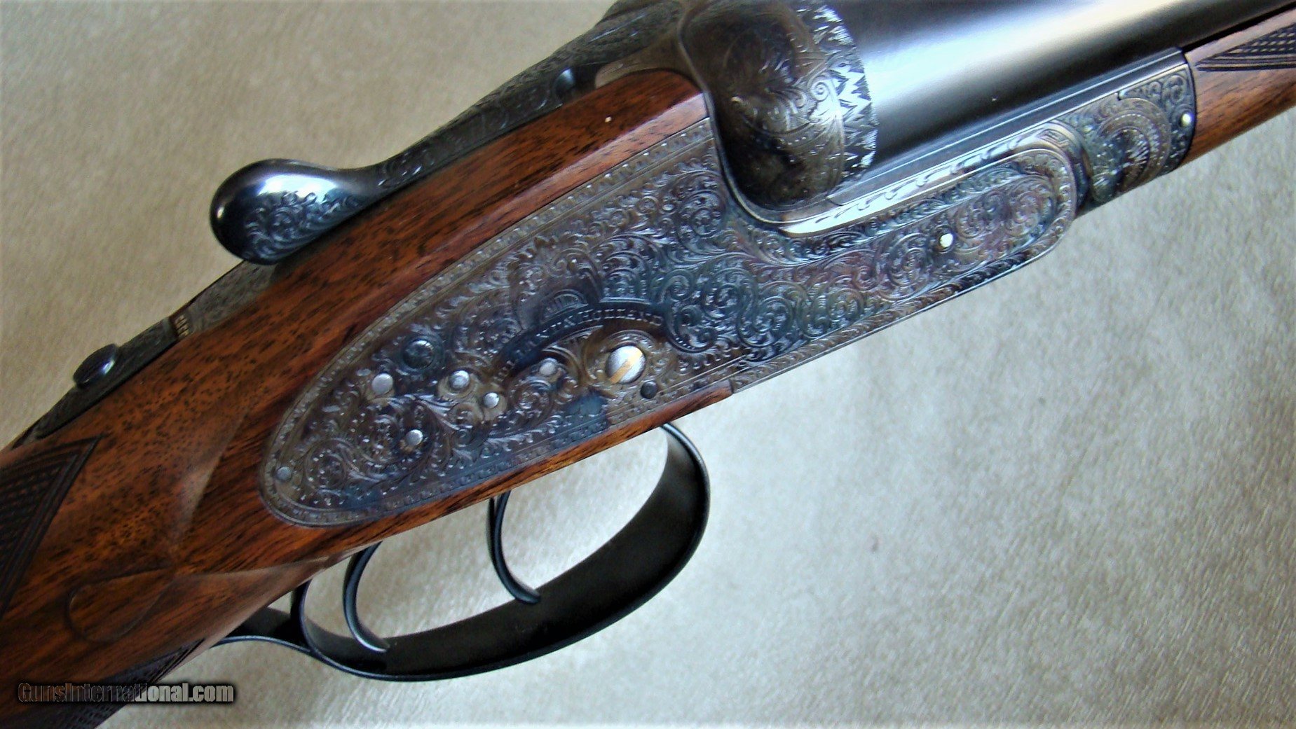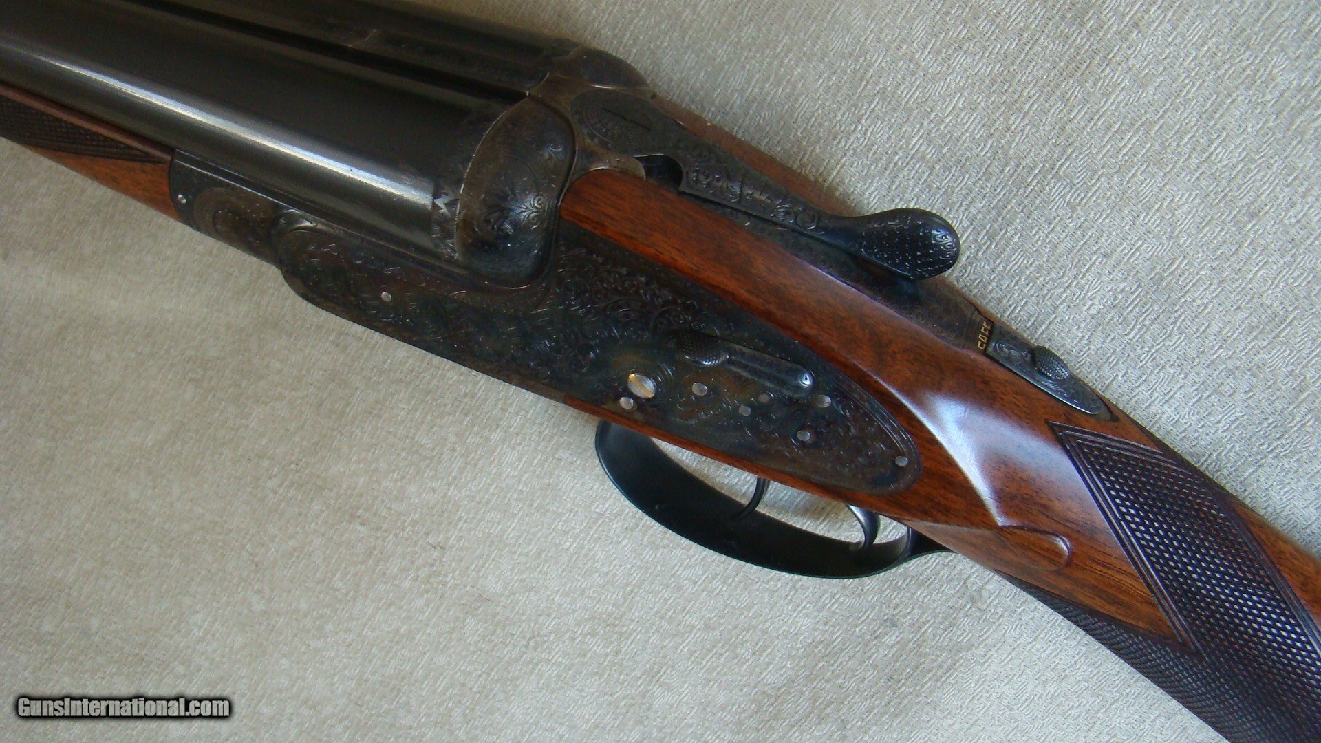 Description: Rare Holland & Holland 16 bore, 28" chopperlump barrels, original 2-3/4 chambers, choked modified and full (.014/.025), bores measure as new .668/.668. Finished in 1927, per the Holland & Holland factory ledger, this vintage self-opener features automatic ejectors and hand-detachable locks. Engraved in the H&H Royal pattern, the underside of the action is inscribed "Royal Self Opener". The gun has been completely restored to as new condition, fabulous case colors, flat top checkering as one would expect on a Best London Gun. Double triggers. Stock measures 1-1/2", 2-3/8" heel, 14-5/8" LOP to a checkered butt. Hard to find gun, built as an original 2-3/4. Weighs in at 6 lbs, 2 oz. A true scaled 16 bore top-of-the-line Holland & Holland. Cased. SOLD |