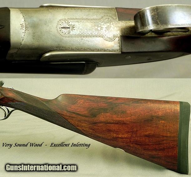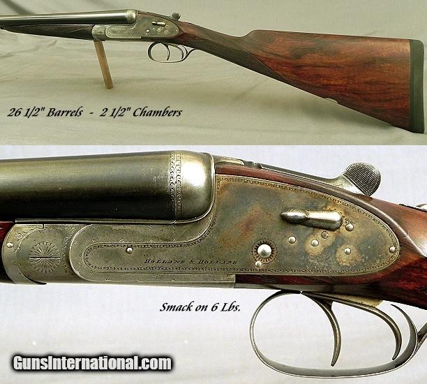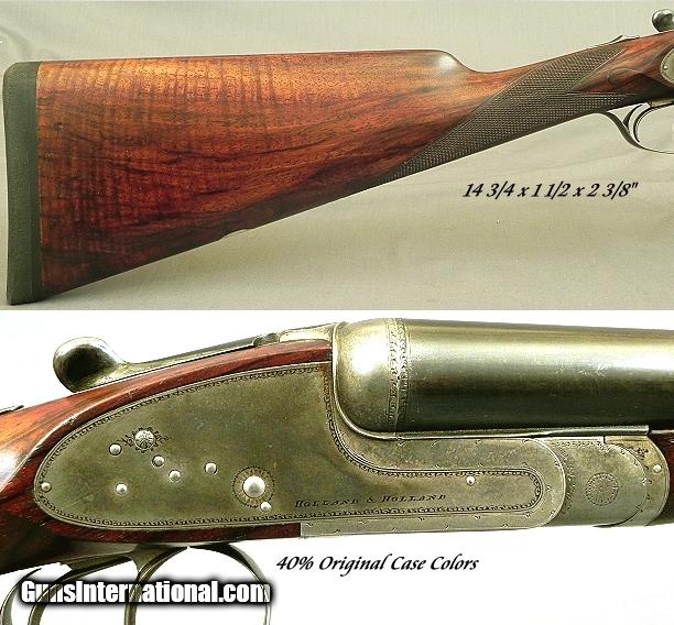 Description: #30204, Holland & Holland, 98 New Bond Street, London: A Bar Action Hand Detachable Sidelock Ejector Badminton Grade 16 Bore Made 1935 with 26 1/2" Dovetail Lump Barrels at .668 .017 & .022" (Mod. & Imp.Mod), 2 1/2" chambers, The wall thickness on the right and left at .025", London Nitro Proof at 1 ounce, Double triggers with the front articulated, Splinter forend with an Anson release, Straight hand stock at 14 3/4 x 1 1/2 x 2 3/8" over a 3/4" pad, Neutral stock, 6 lbs. even, Nice wood with nice color, Border engraving, This gun retains 92-93% barrel blue, It retains 40% original case colors, The butt and forend wood remains at 90%, The checkering still at 92%, The barrels inside and out are in excellent plus condition and totally free of any pits, dings or dents, The barrels ring with a nice chime, John Stanton & Son locks (John Stanton was the inventor & patentee of the Stanton rebounding gunlock), Cased in the original factory brass cornered leather trunk with all the proper trade labels including the serial number. This is a very nice Badminton Sidelock Game Gun with excellent barrels, game gun weight at 6 lbs., made in the Golden Era, great dimensions and points like a dream. SOLD Curio/Relic: Yes |