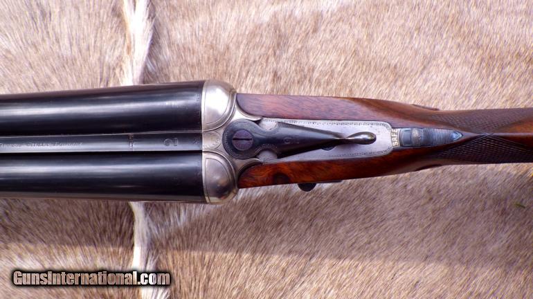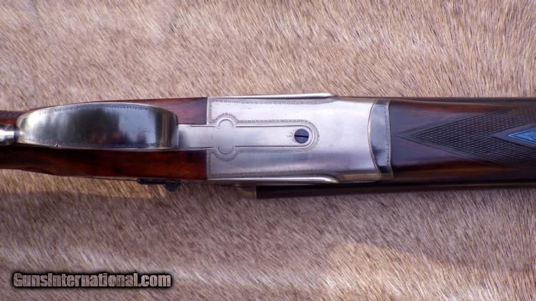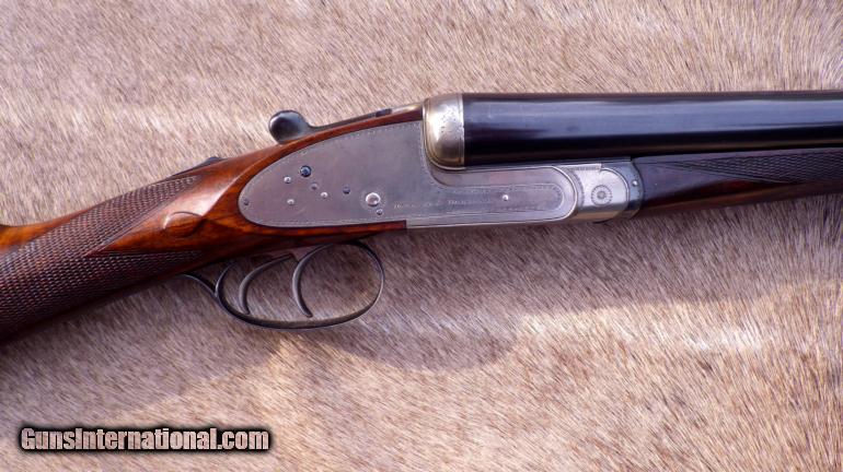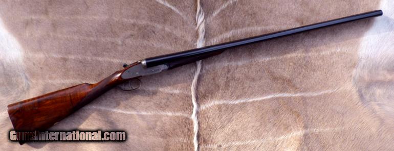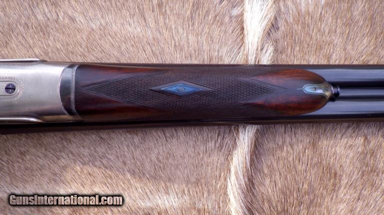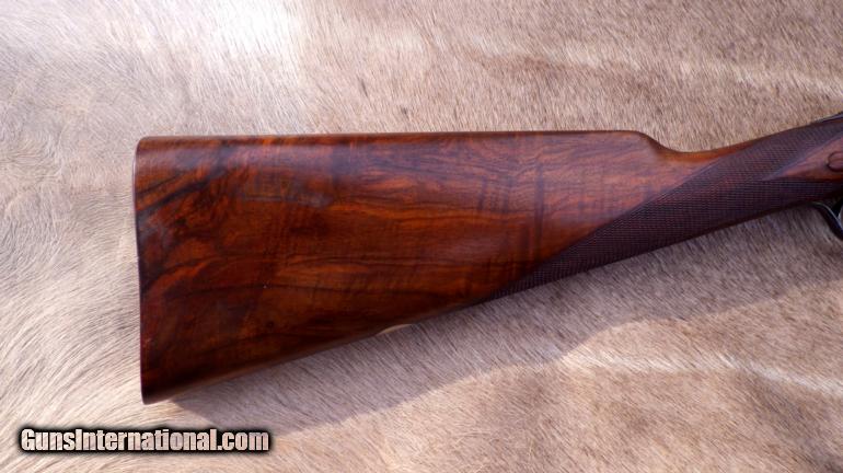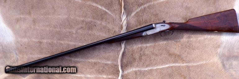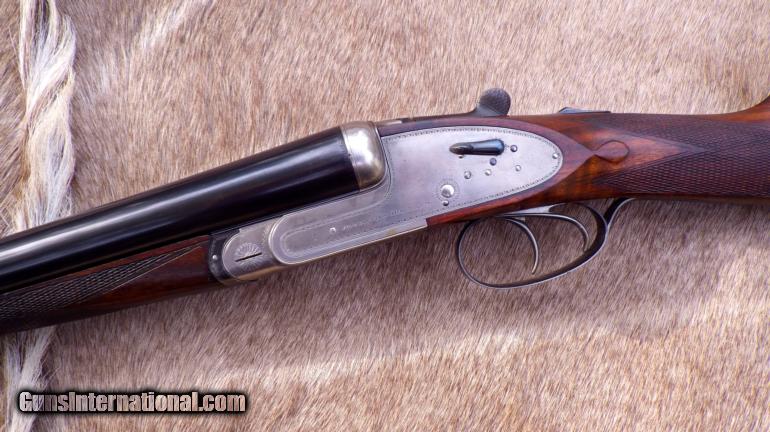 Description: Serial 30308 as made in 1926. Refitted (at Holland & Holland) with steel barrels (30-inch, 2 3/4 chambers, game rib, IC/IC, Nitro-proof without BP marks). Features: Gas-ported breech, hand-detachable locks, checkered butt. Measurements: LOP - 14 5/8, DAC - 1 3/8, DAH - 2 1/4, Cast off - 1/8, Weight 7 pounds (even). Condition: Barrels are straight with no evidence of dents or pitting. Receiver has thinning coin finish with dime-size area of pitting on right side near fence. Stock checkering is good and stock itself remains in very good condition with some thinning of finish. Forend wood has areas of impressions. Engraving: Fine scroll outline accents on receiver, guard, forend metal and lever. Gold "SAFE". Numeral "2" on lever, barrels and forend tip. ALSO have a spectacular Badminton 20 made in 1961 (full coverage, single trigger, beavertail, 15 LOP, 2 3/4, cased for $33K. Over 100 additional fine rifles, shotguns and pistols are also available. List provided by request. SOLD |