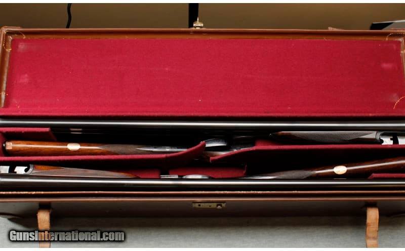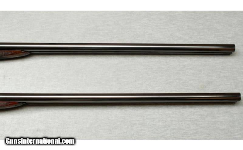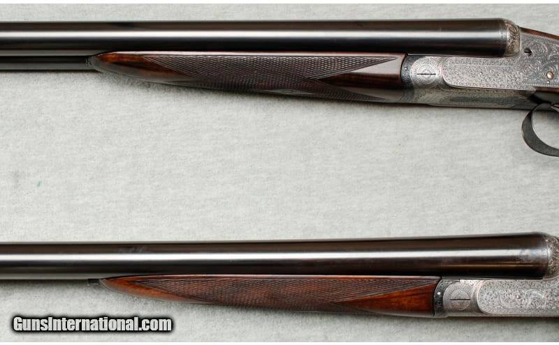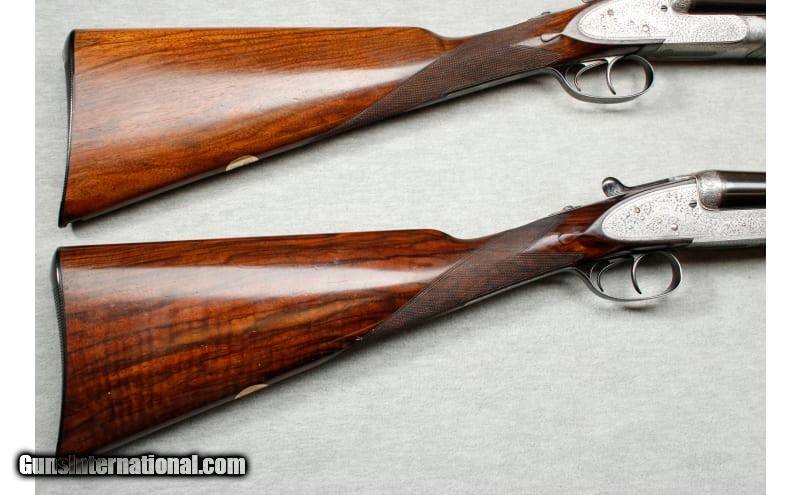 Description: This is a pre-owned 1901 Mfg. Holland & Holland Royal sidelock matched pair in 12 gauge with consecutively serialized shotguns, serial no. 22609/10. Both weigh in at 6 lbs. 6 oz. and are in excellent condition with appealing patina from years of well-serviced use. The concave ribbed barrels of 30 inches are chambered for 2 1/2 inch shells, bored approx. true cyl. in all. Top levers gold-inlaid '1' and '2', automatic safeties with gold-inlaid 'SAFE' details, gold-inlaid cocking-indicators, best 'Royal' scroll engraving, brushed bright and renewed finish overall, 14 3/4 inch figured stocks including butt plates. These Royals have double triggers, straight grips and splinter fore-ends. The engraving is beautiful and practical Holland scroll. Still standard embellishment today – and known as 'Royal Scroll' in house. Mechanically, these guns are slightly different to modern Royals. They are not 'self-opening', a feature that arrived only in the 1920s on Holland's bests. Nor do they have hand-detachable locks (introduced in 1908). Nevertheless, still the epitome of the London gun at the pre-First World War period of the British trade. Provenance: The makers have kindly confirmed that this pair was completed in 1901. The name is not recorded. Sold as a pair including a vintage double motor case. 12 Gauge SOLD Chambers: Both: 2 1/2 Metal Condition: Both: Very good overall with a few small scratches and light wear to the blue on the sides of the barrels near the breech and the muzzle. No. 2: Small scrape on the right barrel Wood Condition: Both: Good overall condition with some handling wear. No. 1: A small chip at the front of the fore end and a repaired chip at the toe that has fallen out. No. 2: Two small scrapes on the fore end Bore Condition: Both: Clean and bright Barrels: 30 Triggers: Both: Double triggers Stock Dimensions: Both: 14 3/4" LOP ~ 1 1/2" DAC ~ 1 7/8" DAH Fore End: Both: Splinter fore end Butt Pad: Both: Grooved Ebonite plate Weight: 6 lbs. 6 oz. Sights: Both: Metal bead Chokes: Fixed chokes; No. 1: Left .006" ~ Right .001"; No. 2: Left .003" ~ Right .002 Item Location: La Vista, NE |
