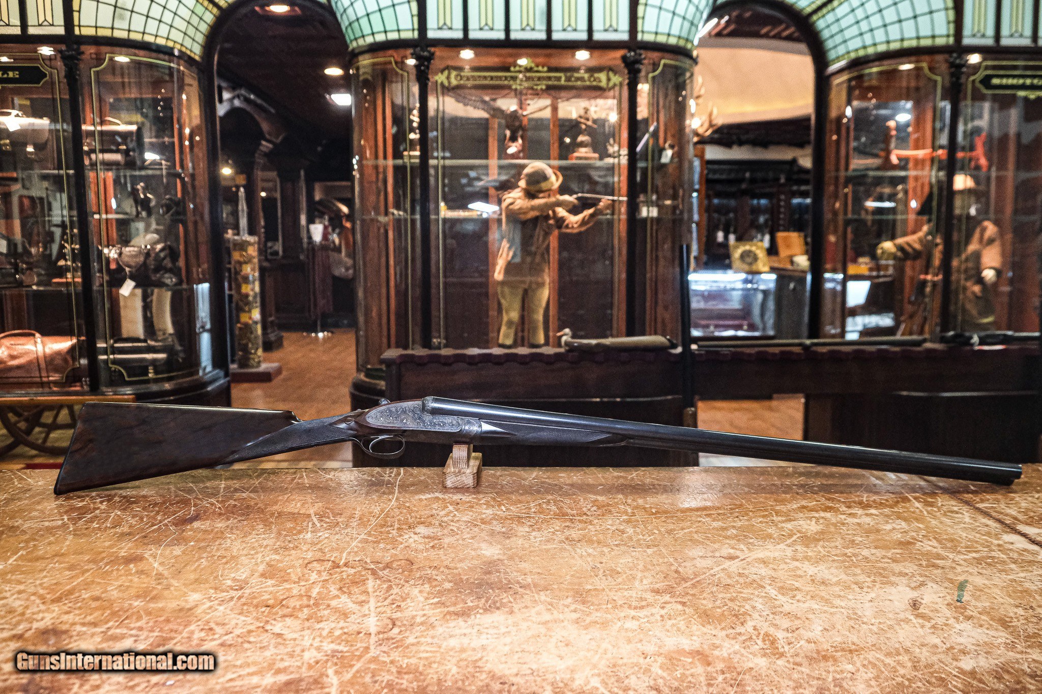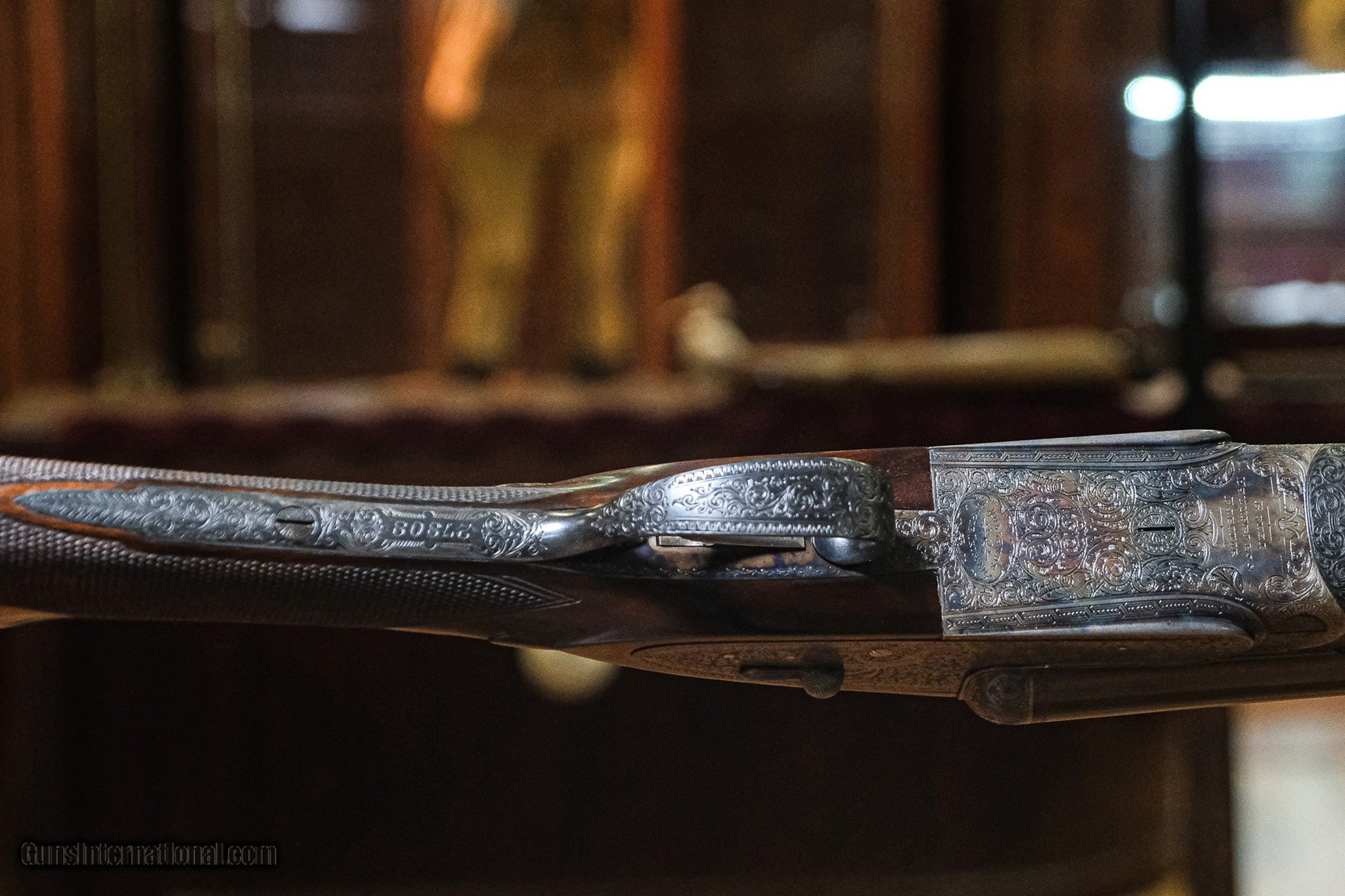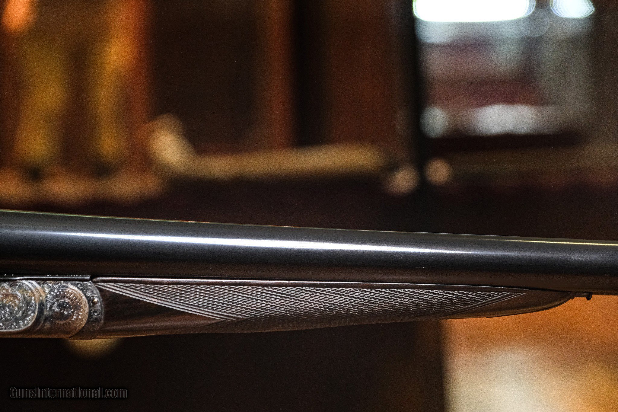 Description: Holland & Holland - Matched Pair, SxS, Royal Hammerless Ejector, Consecutive Serial Numbers, 12ga. 30" Barrels. Gun #1 choked CYL/IC. Gun #2 choked IC/IC. Consecutive serial number, gold #1 and #2 on barrels, top lever and forend. Holland single trigger, royal hammerless ejector, straight grip, horned butt, swamped rib, highly figured French walnut, perfect engraving, perfect screws, splinter forend, drop point stocks, hand detachable locks with original fixed screw and lever. The engraving is perfect, the barrel lettering is perfect. These guns have gone through a 100% English style refurbishing with 100% case color, barrel blue, and wood finish. They look like guns that were made today. Built at the height in craftsmanship. These guns have it all, the best finish, best bluing, and perfect checkering. Inv: 86035 - 86036 6 lbs. 12 oz. 15 1/8" x 1 ½" x 2 ½" $31,000.00 SOLD |