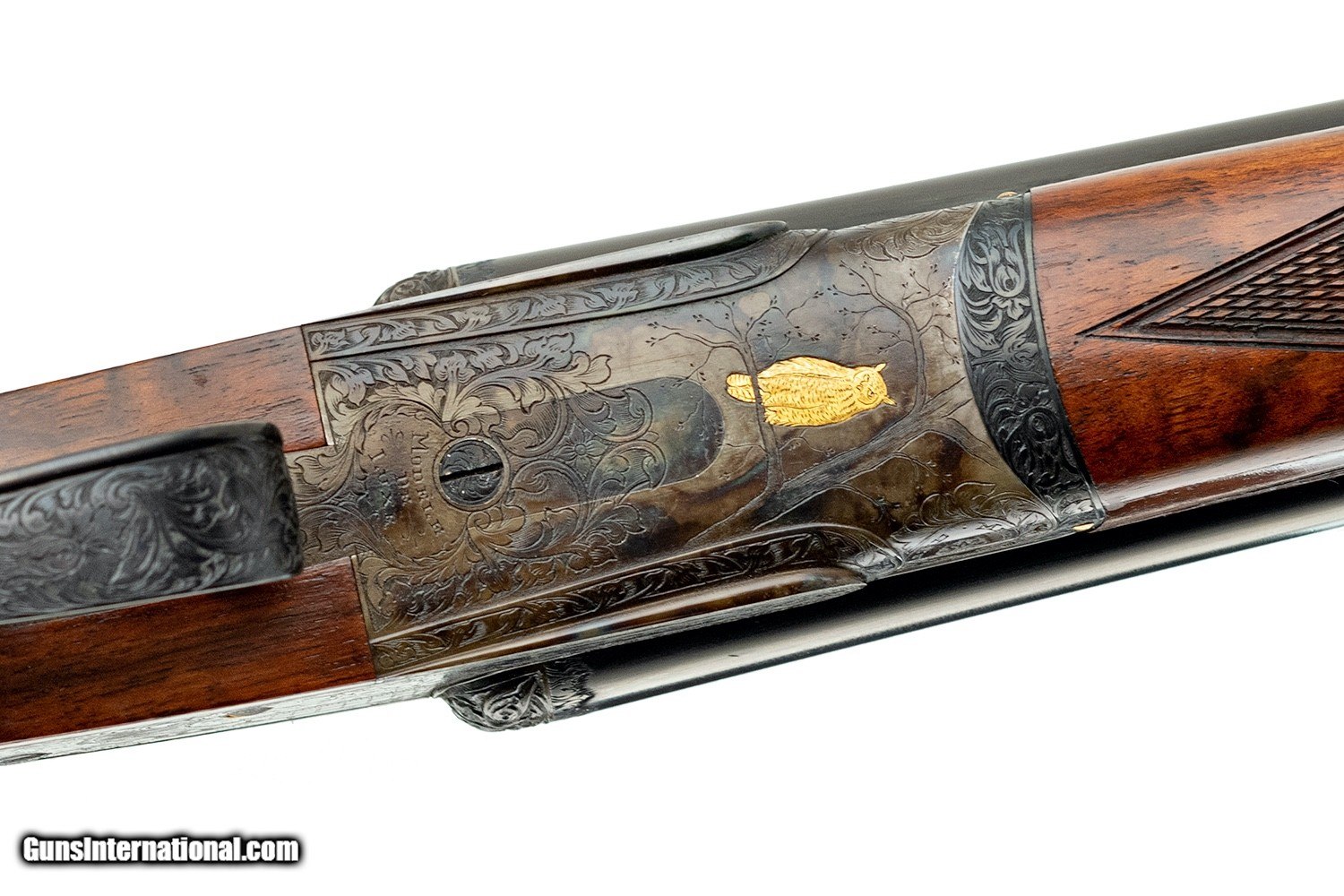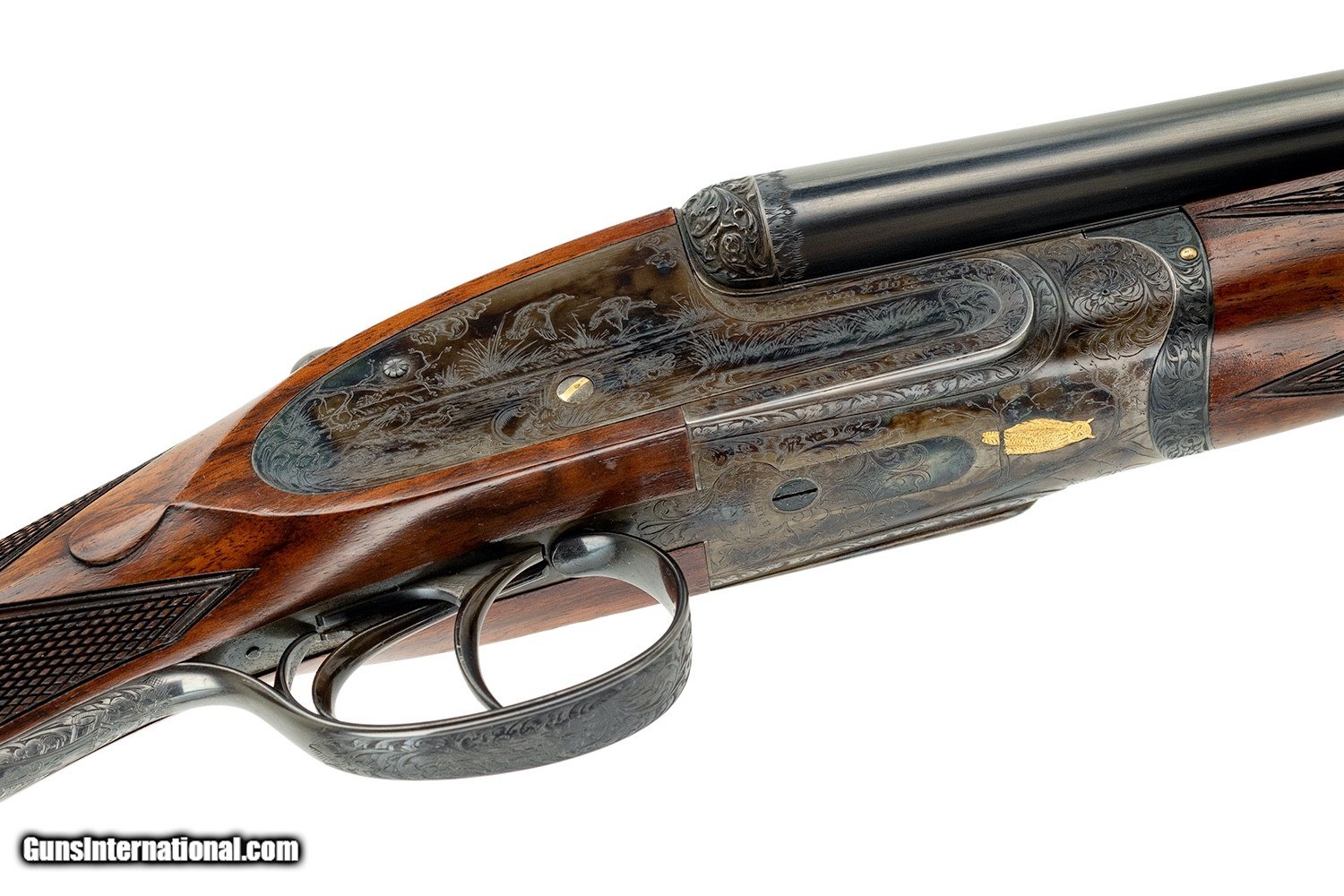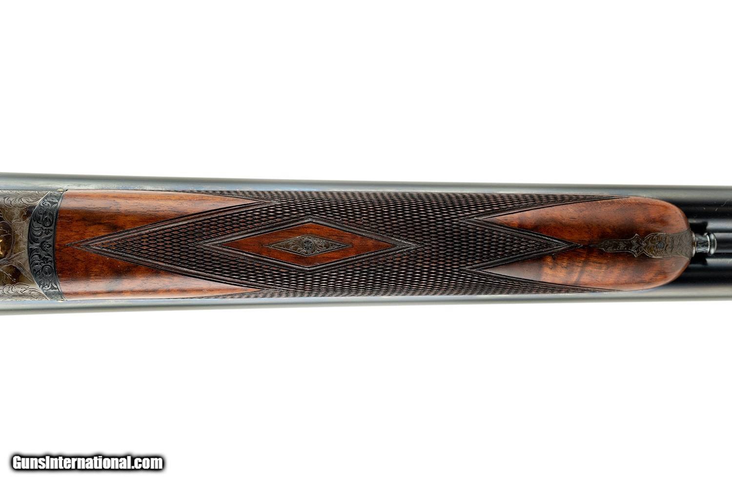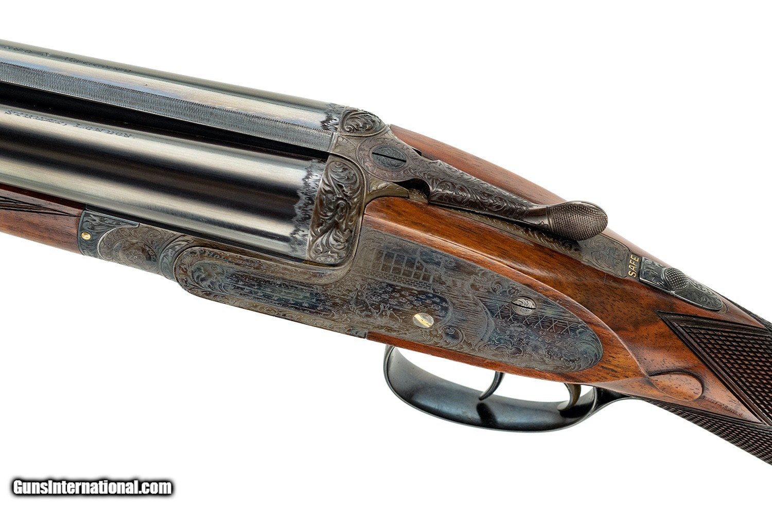 Description: #36XXX 28" SELF OPENER (.009 AND .012) 2 3/4" DOUBLE TRIGGER W/ HINGED FRONT TRIGGER EJECTORS SPLINTER FOREARM ENGLISH GRIP LEATHER COVERED PAD EXCELLENT MINT ORIGINAL CONDITION MAKERS OAK AND LEATHER CASE W/ ALL ACCESSORIES 6LBS 4 OZ 2 1/2" DAH 1 1/2" DAC 15 1/4" LOP SOLD |
