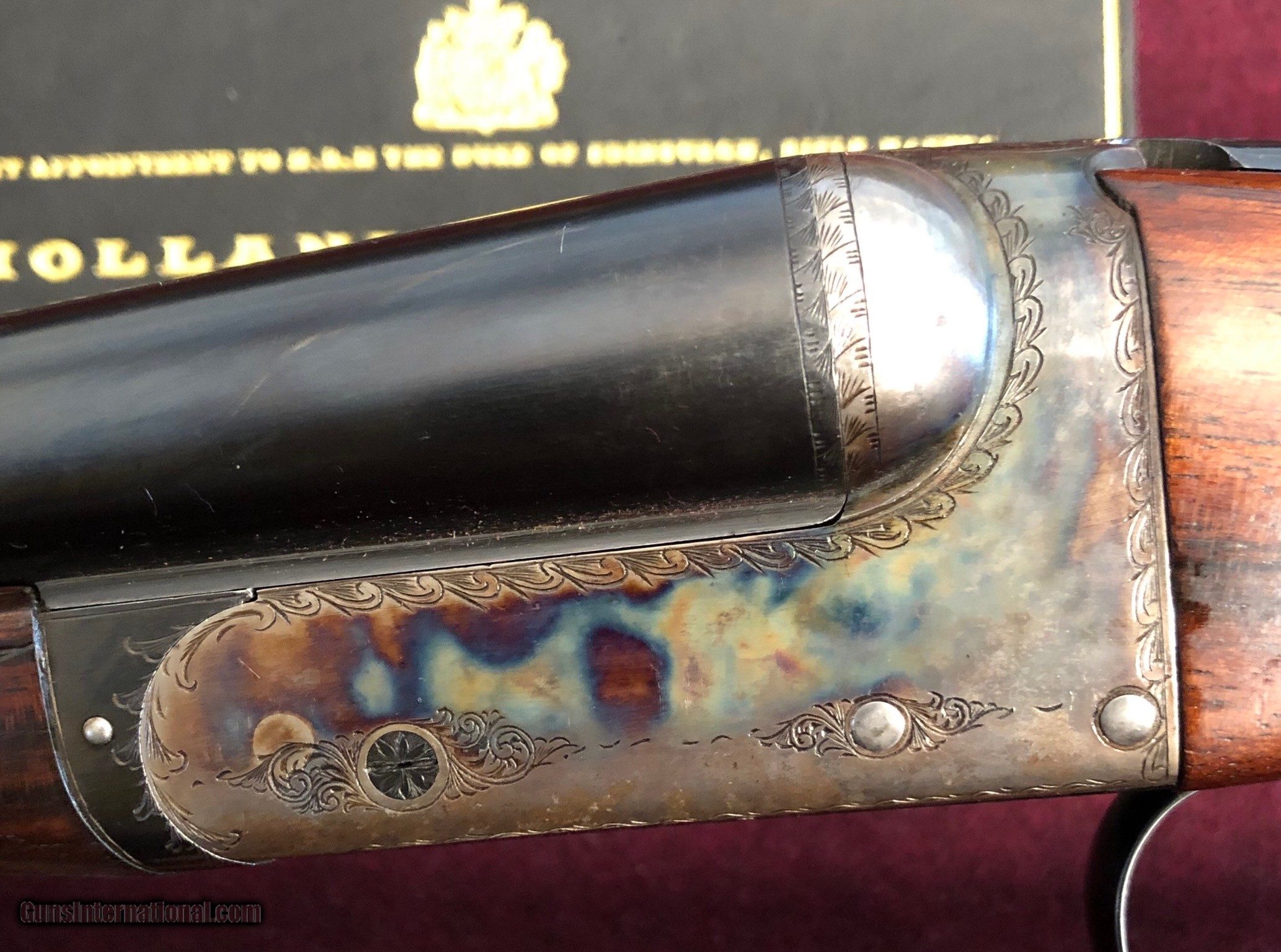 Description: Holland & Holland of England. Model "Shot & Regulated" Boxlock Game SxS shotgun. SN: 147188. 20ga. 26" bbls. Marked "SHOT & REGULATED BY HOLLAND & HOLLAND" on right barrel and "33 BRUTON STREET LONDON" on left barrel. 2 3/4" chamber with 3 1/4 ton proofing. Choked .001"/.010". Ejectors. Case colored border and light ornamental scroll engraved boxlock action. Double triggers. Auto safety. Nice straight grained English walnut straight grip stock. Leather covered buttpad. LOP 14 1/4" x 1 1/2"DAC x 2 1/8" DAH. Unengraved initial oval on toe line of stock. Weight: 5lbs9oz. Cased in canvas covered and leather-trimmed case with maroon felt lining and leather H&H trade label. Top leather label embossed "LLOYD". Two-piece wood cleaning rods. Condition: Gun is in remarkably excellent overall original condition showing little signs of use. Case color is vibrant and deeply hued. All blue remains. Ejectors strong. Bores clean. Case is excellent. Gentlemen, this is one of the better "Shot & Regulated" we have ever seen. An opportunity to own one from the world's more famous makers! Please call now. FFL required Buyer to pay flat $50 S/H/I SOLD Manufacturer: HOLLAND & HOLLAND Model: SHOT & REGULATED Serial Number: 147188 Condition: EXC Metal Condition: EXC Wood Condition: EXC Bore Condition: EXC Barrels: 26 Action: BOXLOCK Triggers: DOUBLE Gauge Info: 20 Weight: 5lbs9oz Case: YES Proof:Nitro: YES |