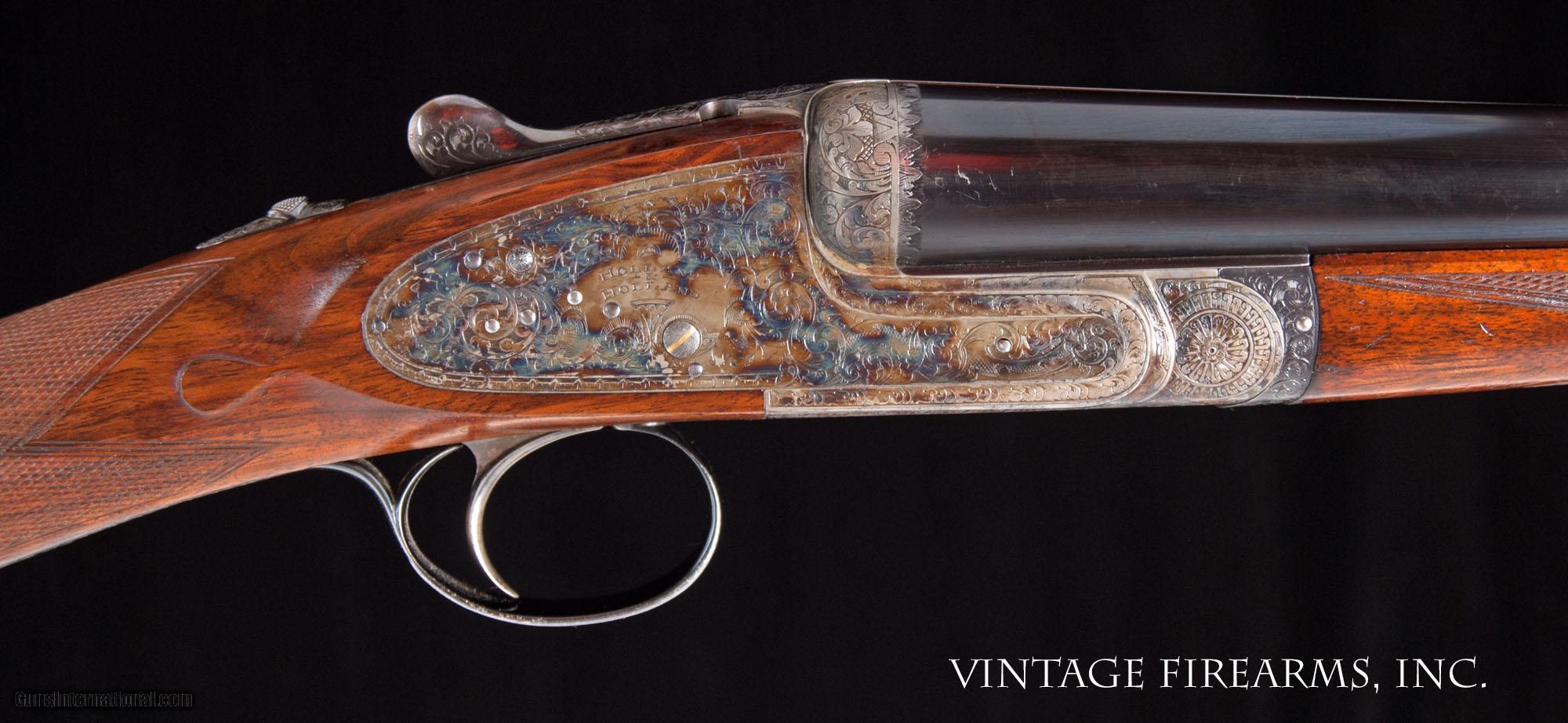 Description: Holland & Holland Royal 12 Gauge Shotgun ROYAL, 28", HIGH CONDITION General Specs: Holland & Holland, Year 1984, 12 Gauge, 6lbs 12oz, Side-by-Side Serial Number: 40626 If you want to start a vigorous debate, ask a group of experienced double gun enthusiasts "what maker builds the finest double shotgun in the world?". There will be a variety of educated opinions with vigorous defenders, but Holland & Holland will be included in the debate. Building fine sporting arms since 1856, there is little doubt that H & H will always land in the top 5 BEST GUN makers in the world. This Royal gun, serial number 40625 built in 1984, is a fine example of their work and is in fine factory condition ready for your shooting needs. The gus have seen use at the pegs, as the previous owner was an avid shooter and a critical shot, so it is a proven gun. It was shipped with 28” barrels and good stock dimensions, see below for details. It is fitted with single triggers, which is a hard-to-find feature for those that prefer single triggers. There are light handling marks on the wood and a few handling marks on the barrels, but no dents or dings and the guns are tight on face and hinge pin like a new gun. The case color and blue are factory original and strong at 98%. Thanks for looking. Barrels Barrel Length: 28" Chokes: .010/.025 IC/IM 1/4 and 1/2 choke english Bores: perfect mirrors Bore Diameter: .727/.730 Wall Thickness: .027/.024 % Blue: 99% factory Chambers: 2 3/4" Ribs: tight Sights: single Action Action: tight Ejectors or Extractors: ejectors, strong, timed Case Color: 97% factory Screws: excellent Engraving: Holland banknote scroll sharp clear Trigger Type: single, crisp Trigger Guard Color: 97% rolled right edge Stock Type: english stock/splinter forend/ moderate figure LOP: 15 1/8" rear trigger LOP To End Of Wood: 14" rear DAH: 2 5/8" DAC: 1 1/2" Cast: 1/2h; 5/8"t off Checkering Condition: excellent Butt Treatment: leather covered pad There are more photos upon request. There is a 30 day mechanical warranty on this gun. Call us for full details. Please see all of our fine Vintage Firearms on this . We have many more sxs shotguns for sale and soon to be listed, check back or email us for a preview. Thanks for looking! We employ a full time gunsmith on premises and can perform alterations to suit your needs within a few weeks of purchase. Payment Methods: Money Order, Certified Check, Personal Check, Wire Transfer Inspection Period / Return Policy: Three Days from the date the item was received. Sales Tax: 6% Michigan Only Shipping & Insurance: Ground $240.00 We ship internationally! (***NOTE that most all of this is INSURANCE. If you have your own, we can arrange your insurance covering it.) Item Condition: Used Requires FFL?: Yes If you have any questions about this item or payment, please email or call us directly, at #616-292-6240. Thanks! Jay Shachter, Vintage Firearms, Inc We employ a full time gunsmith on premises and can perform alterations to suit your needs within a few weeks of purchase. Common requests are: -stock bending to suit your particular requirements -addition of any specified butt pad to increase length of pull -alteration of chokes to suit your shooting preferences -lengthening of chambers and forcing cones -darkening stock color with penetrating stains -restoring any part of the gun including rust blue, charcoal blue, bone and charcoal case color, wood restoration and checkering recuts. If you like one our guns but it needs "tweaked", let us know and we can quote you a time and price. Some enthusiasts like the guns "as found" and others want them "just so". We often list guns as found and let the particular buyer choose how they want their gun to fit or look. SOLD |