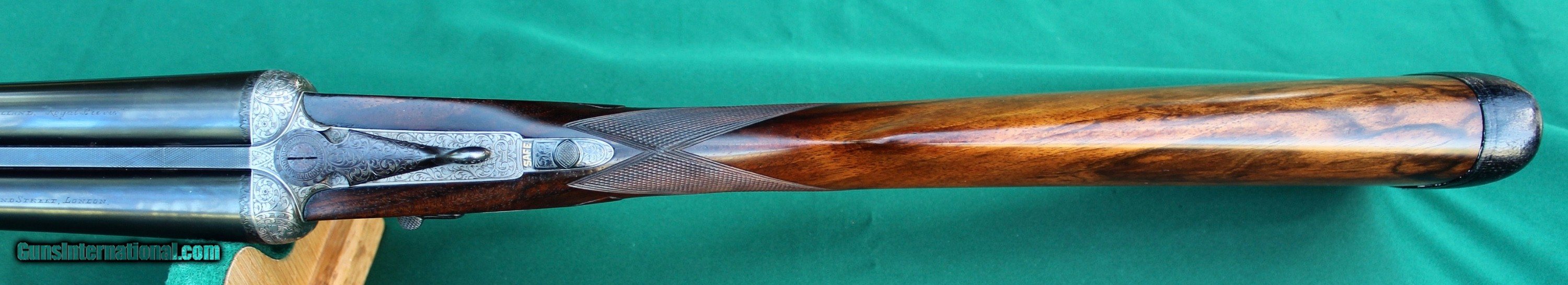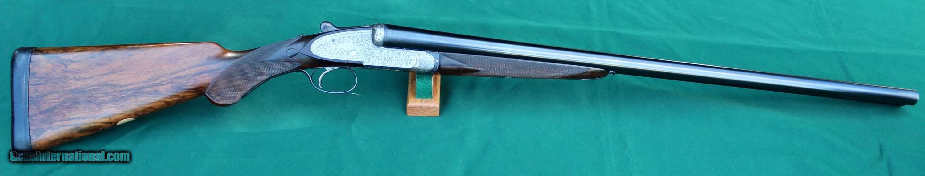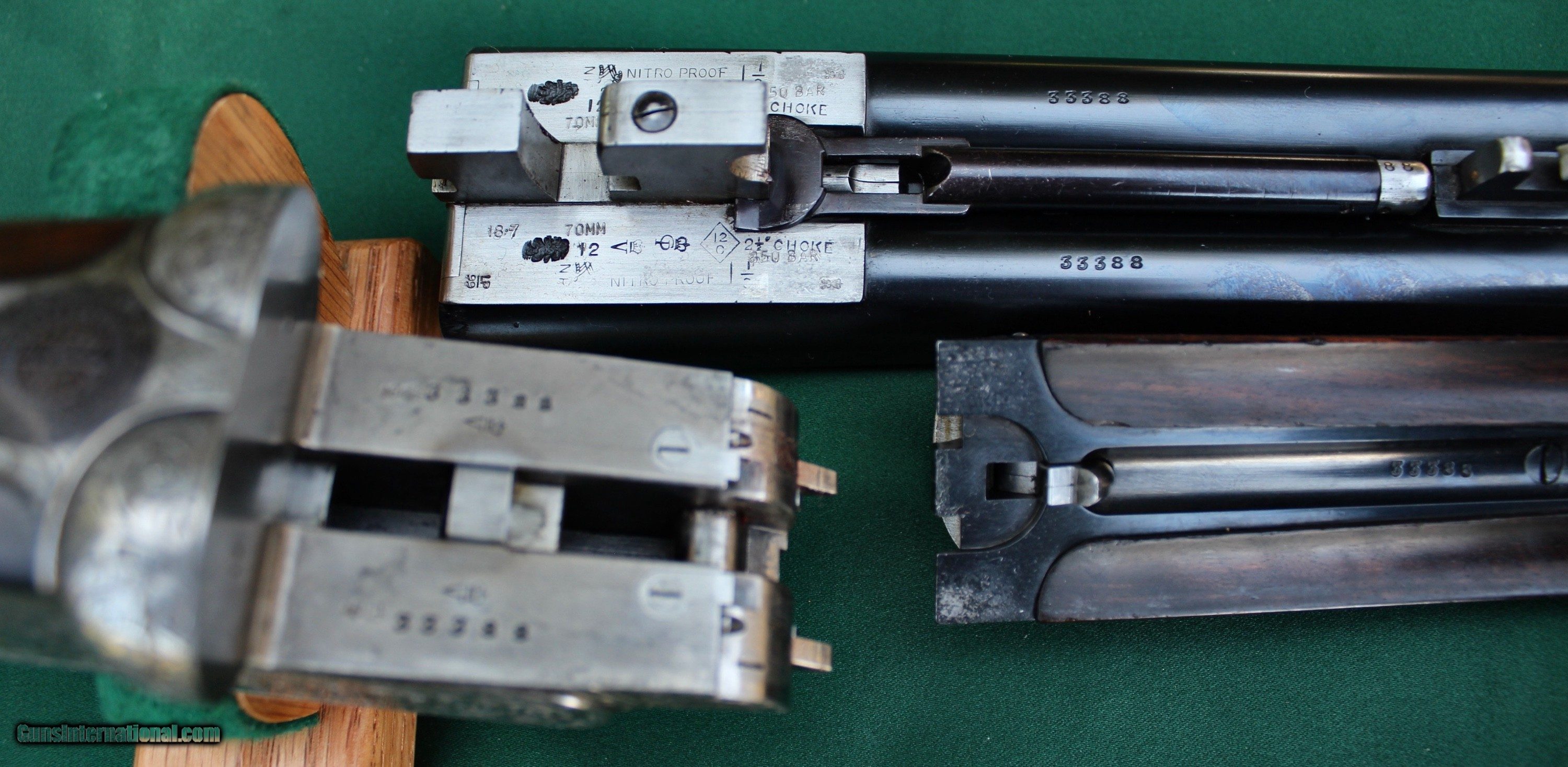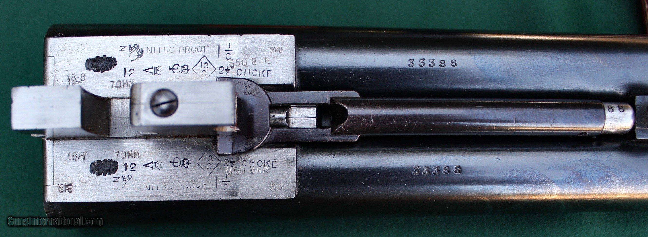 Description: This is a very nice 1936 H&H Royal Brevis cased 12 bore. Serial No. 33388(Full House) . Gun has had the barrels and furniture re-blacked in the London style of quality. The barrel flats show a London Proof date in 1999 with proof at 70mm and 850 bars. Gun functions as it is supposd to with well timed ejectors and strong assisted opening. A Very nice golden age gun at a fraction of new price!!! SOLD SOLD Shotgun Gauge: 12 Gauge Manufacturer: Holland and Holland Model: Royal Brevis Serial Number: 33388 Barrel Length: 26 Bore: Mirror Chambers: 2 3/4 Ejectors: Strong - Well timed Condition: Excellent Metal Condition: Excellent Wood Condition: Very Good Bore Condition: Excellent Barrels: 26 Barrel Type: Whitworth Action: Side Lock Ejector Triggers: Single Non-Selective Stock: Turkish Walnut Stock Dimensions: 1 5/8 x 2 3/4 x 14 Stock Cast: 1/4 off Butt Pad: Leather Weight: 6 lbs. 5.1 oz. Manufacture Date: 1936 Chokes: .028 & .042 Choke Left: 042 Choke Right: .028 Case: Leather Trunk Item Location: WI Proof:Nitro: Yes Minimum Wall Thickness Left: .027 Minimum Wall Thickness Right: .028` |