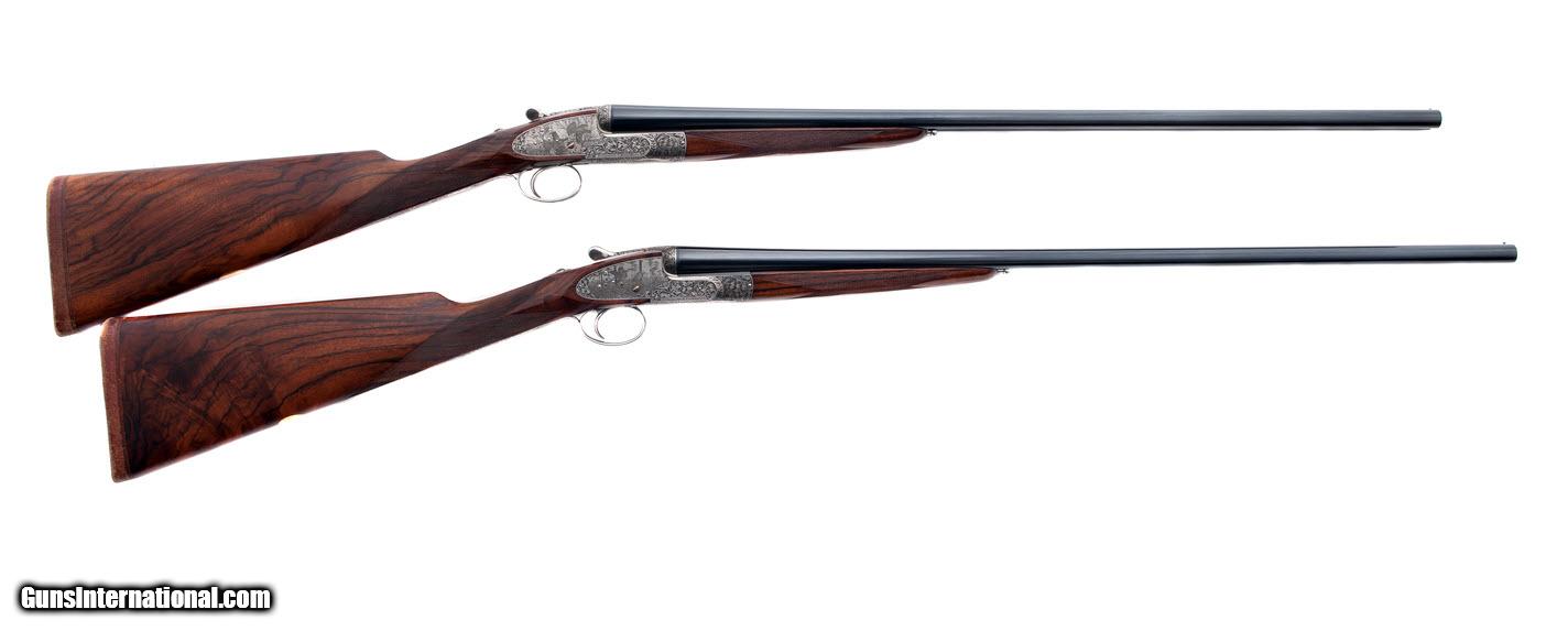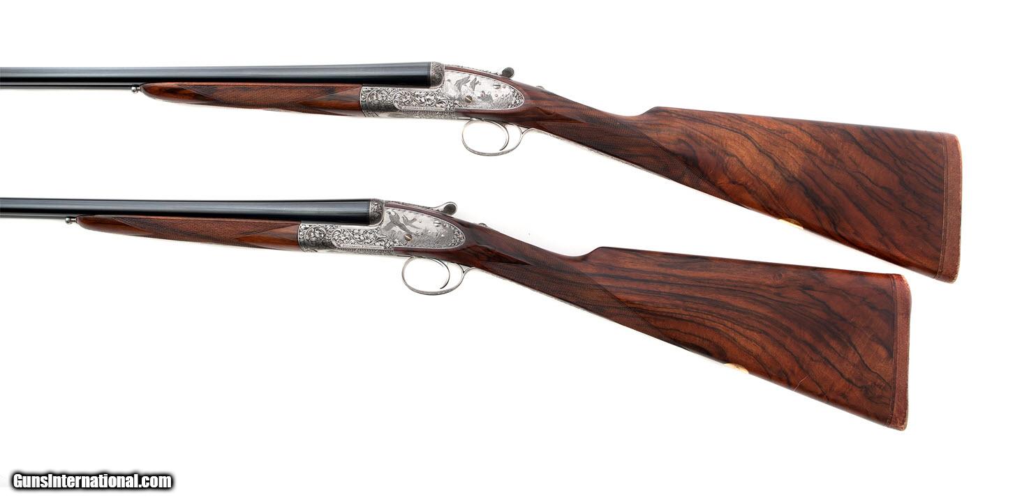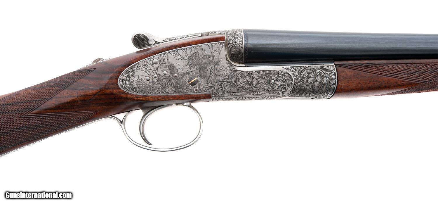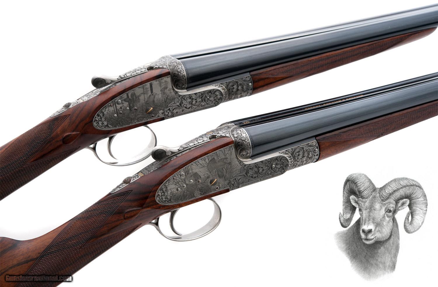 Description: Holland & Holland - Royal Deluxe - Pair - 28 ga - Item Number: HOL41259/0 Shotgun type: SxS Action: Sidelock Ejectors: Yes Trigger: Single Grip: Straight Grip Forend: Checkered Lop: 15 5/8 " Pad thickness: 0.5 " Type of butt: Leather Covered Pad Drop comb: 1 1/2 " Drop heel: 2 1/4 " Cast amount: 3/8 " Cast: Off Weight: 6 lbs, 14 oz Manufactured in: England Manufacture Year: 1999Finish: French Grey - Stipled Overall condition: Very Good Stock condition: Very Good Metal condition: Very Good Stock: Original finish Metal: Original finish Type of Case: Canvas & Leather Motor Case Extra barrels: 0 Barrel info: Gauge: 28 ga Chamber: 2 3/4 " Length: 27 " Chokes: IC/M Rib type: Concave Comments : Beautifully executed engraving by the 'late' Master Engraver Philippe Grifnée. Depicting vignette scenes, featuring Ringneck Pheasant, Ruffed Grouse, Quail & Ducks. Dogs are depicted on underside of action. Few engravers will ever reach the skill & reputation of Philippe Grifnée of Liège, Belgium. Fewer still will ever even meet an engraving artist of Grifnée's caliber. Your opportunity to acquire a fine example of Grifnée's work and a rare "28 bore pair" of Royal Game Guns with Deluxe Grade Walnut. SG-311 SOLD |