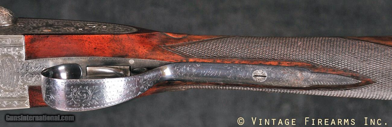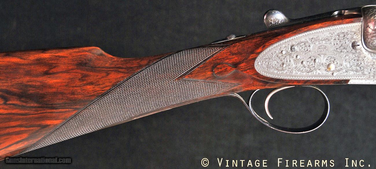 Description: Holland & Holland Royal Ejector 12 Bore SxS 30" BARRELS, 6 1/2 lbs, BARGAIN! General Specs: Holland & Holland, Year 1896, 12 Gauge, 6 1/2 lbs , Side by Side Serial Number: 17341 If you want to start a vigorous debate, ask a group of experienced double gun enthusiasts "what maker builds the finest double shotgun in the world?". There will be a variety of opinions with vigorous defenders, but Holland & Holland will be included in the debate. Building fine sporting arms since 1856, there is little doubt that H & H will always land in the top 5 BEST GUN makers in the world. This gun, sn17341 built in 1896, is a perfect example. 119 years old and still in perfect mechanical condition and gorgeous in the way of fit and finish. Weighing just 6lbs. 9oz. and balanced perfectly 1/8" ahead of the hinge pin, this is the gun that DEFINES DYNAMIC HANDLING IN A 12 BORE. With perfectly struck 30" barrels, mirror bores choked cylinder/LM (.000/.016), plenty of wall thickness at 25 thou right, 24 thou left and strong, well timed ejectors, this is the side by side shooter's dream gun. When you look at used Holland & Holland guns you expect to see price tags that begin at $25K for a well worn gun. Look at this gun, with the gorgeous figured original wood, perfect wood to metal fit, factory single trigger, great stock dimensions with 14 3/4" LOP from the rear position single trigger, about 30% faded case color, excellent screws...then look at our price. Quite the bargain! You can invest in one of the finest guns on the planet at a reasonable price and shoot a name that is world renowned for quality and prestige. The reason is that the chambers have been extended to 2 3/4" and the gun was proofed at 2 1/2". The gun is still perfectly safe to shoot with 1 1/8 oz. loads, as there is plenty of wall thickness and the gun is healthy. We can send it back to England for reproofing this summer for a total cost of $3000 and then the gun is worth over $25K, but we thought for a shooter looking for a great gun at an affordable price, this would be one for him/her. We also avoid the 3 month turnaround time. Reproofing can be done at anytime, and the increase in value would be money in the new owner's pocket. A great gun and a great investment opportunity. Barrels Barrel Length: 30" Chokes: .000/.016 Cyl/LM Bores: mirror Bore Diameter: .731/.731 Wall Thickness: .025/.024 % Blue: 99% deep blue Chambers: 2 3/4" Ribs: tight Sights: single Action Action: tight Ejectors or Extractors: ejectors, strong, timed Case Color: 35% faded light Screws: excellent Engraving: gorgeous clear crisp Trigger Type: single non selective trigger, crisp Trigger Guard Color: 99% Stock Type: English stock/splinter forend, nice French diamond grip LOP: 14 3/4" LOP To End Of Wood: 13 5/8" DAH: 2 1/2" DAC: 1 7/16" Cast: 0 Checkering Condition: excellent Butt Treatment: nice vintage leather pad There are more photos upon request. We offer a 30 day mechanical warranty on this fine shotgun. PLEASE SEE MY OTHER FINE VINTAGE FIREARMS. Just open one of my ads and click on the line that says “see all items from this seller” and a very nice list of fine sporting and collectible arms will appear. I have many more fine sxs shotguns not yet listed. Thanks for looking! We employ a full time gunsmith on premises and can perform alterations to suit your needs within a few weeks of purchase. Payment Methods: Money Order, Certified Check, Personal Check, Wire Transfer Inspection Period / Return Policy: Three Days from the date the item was received. Sales Tax: 6% Michigan Only Shipping & Insurance: Ground $140.00 We ship internationally! Item Condition: Used Requires FFL?: NO - ANTIQUE! If you have any questions about this item or payment, please email or call us directly, at #616-292-6240. Thanks! Vintage Firearms, Inc SOLD Curio/Relic: Yes Antique: Yes |