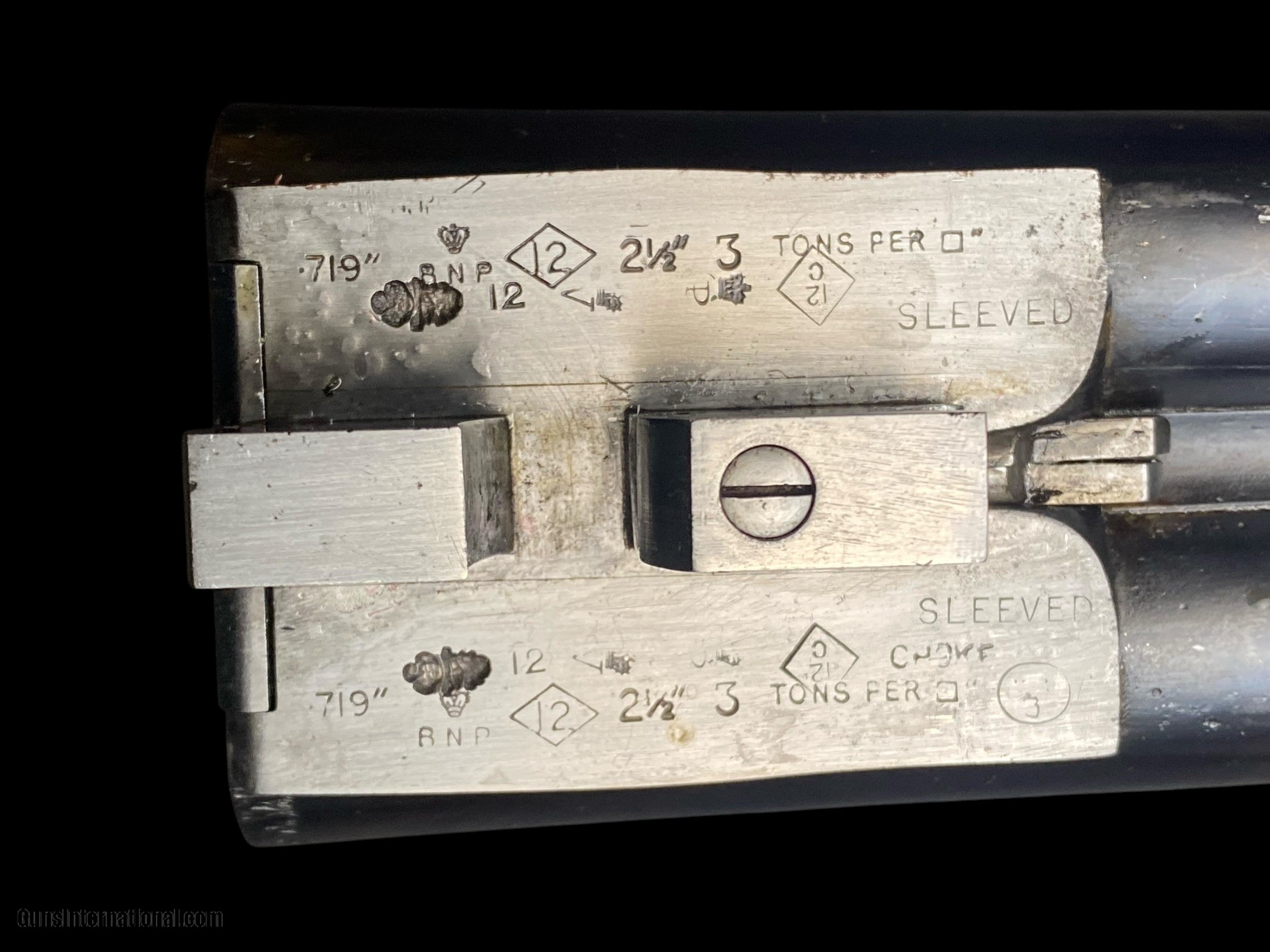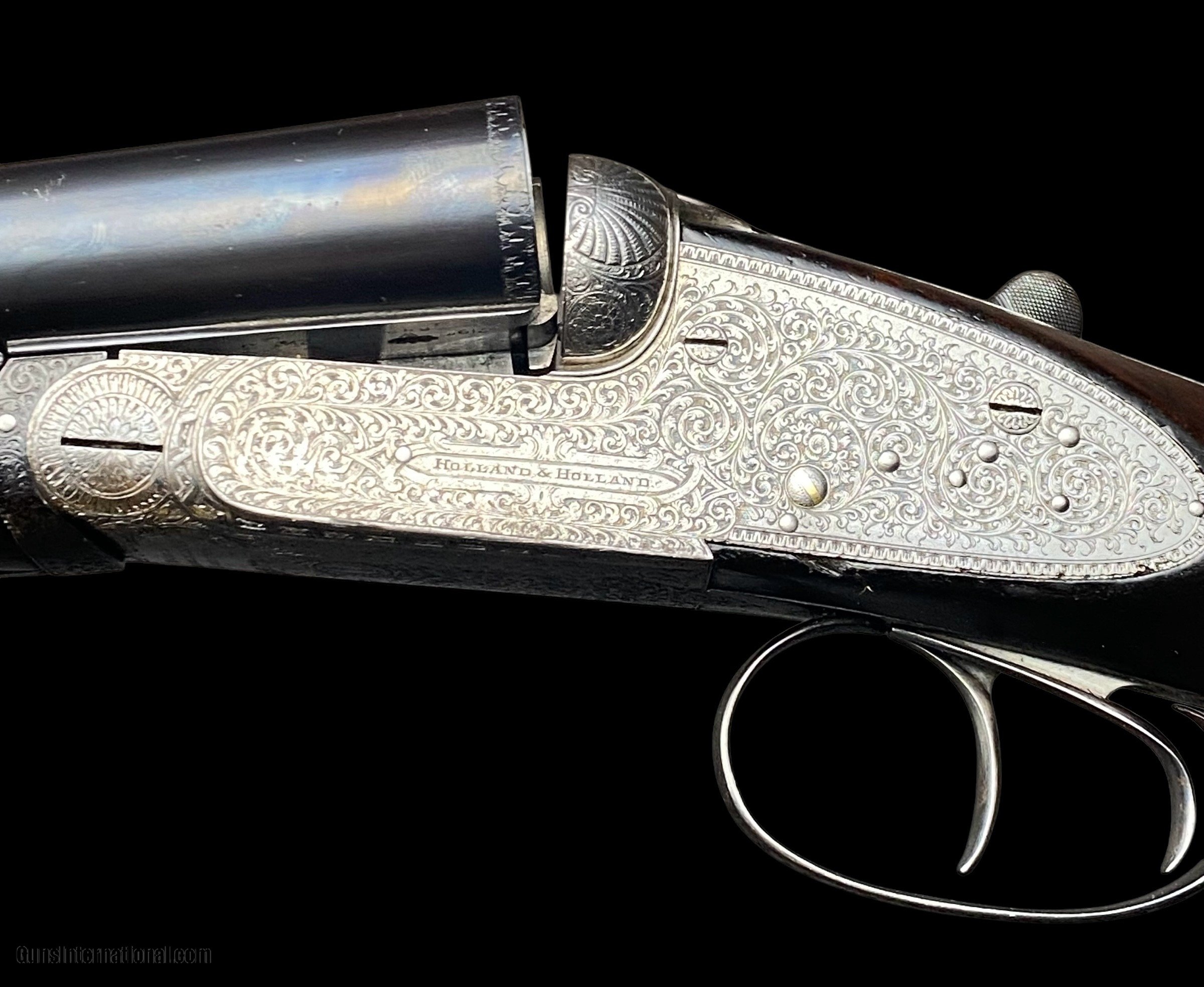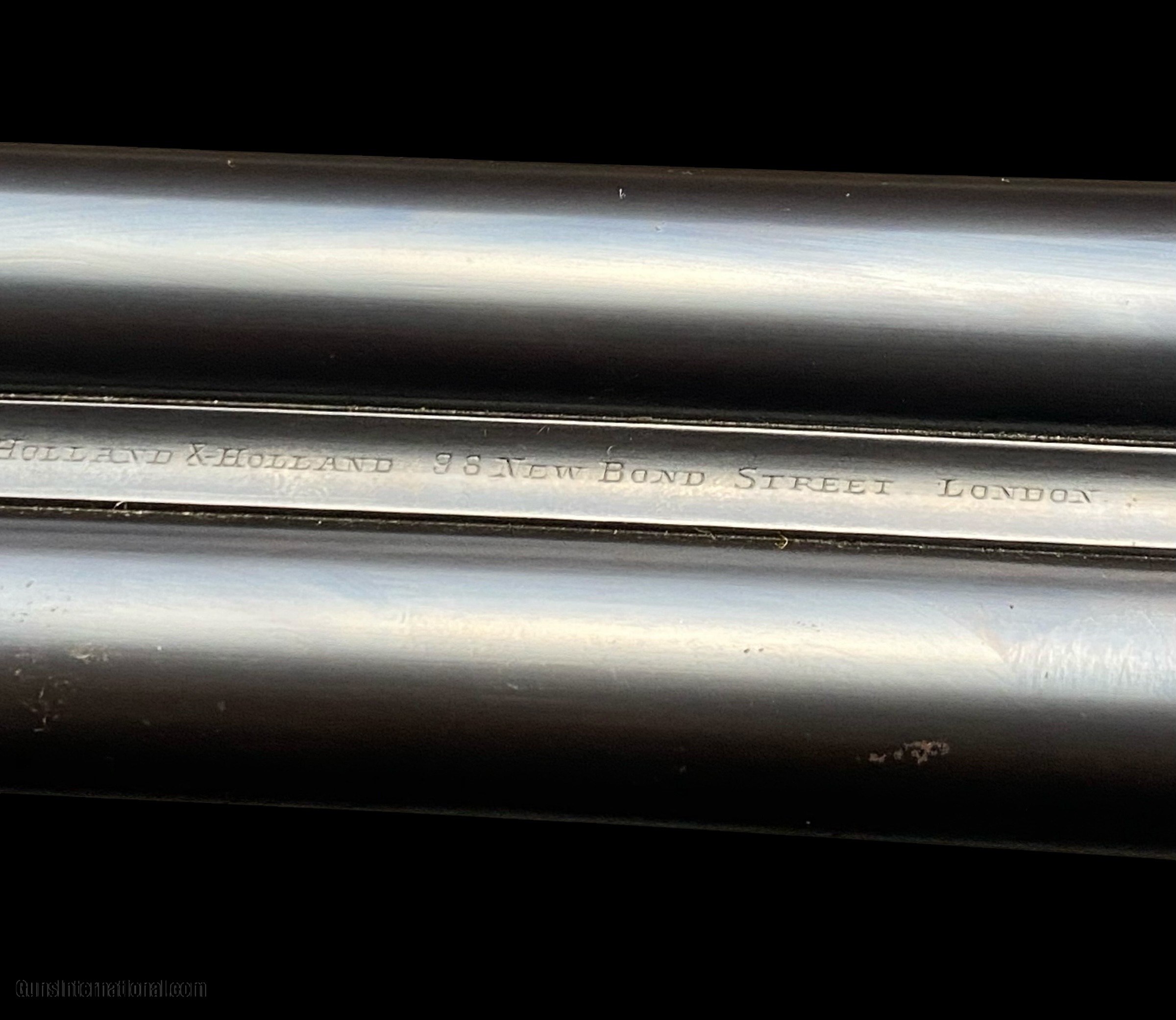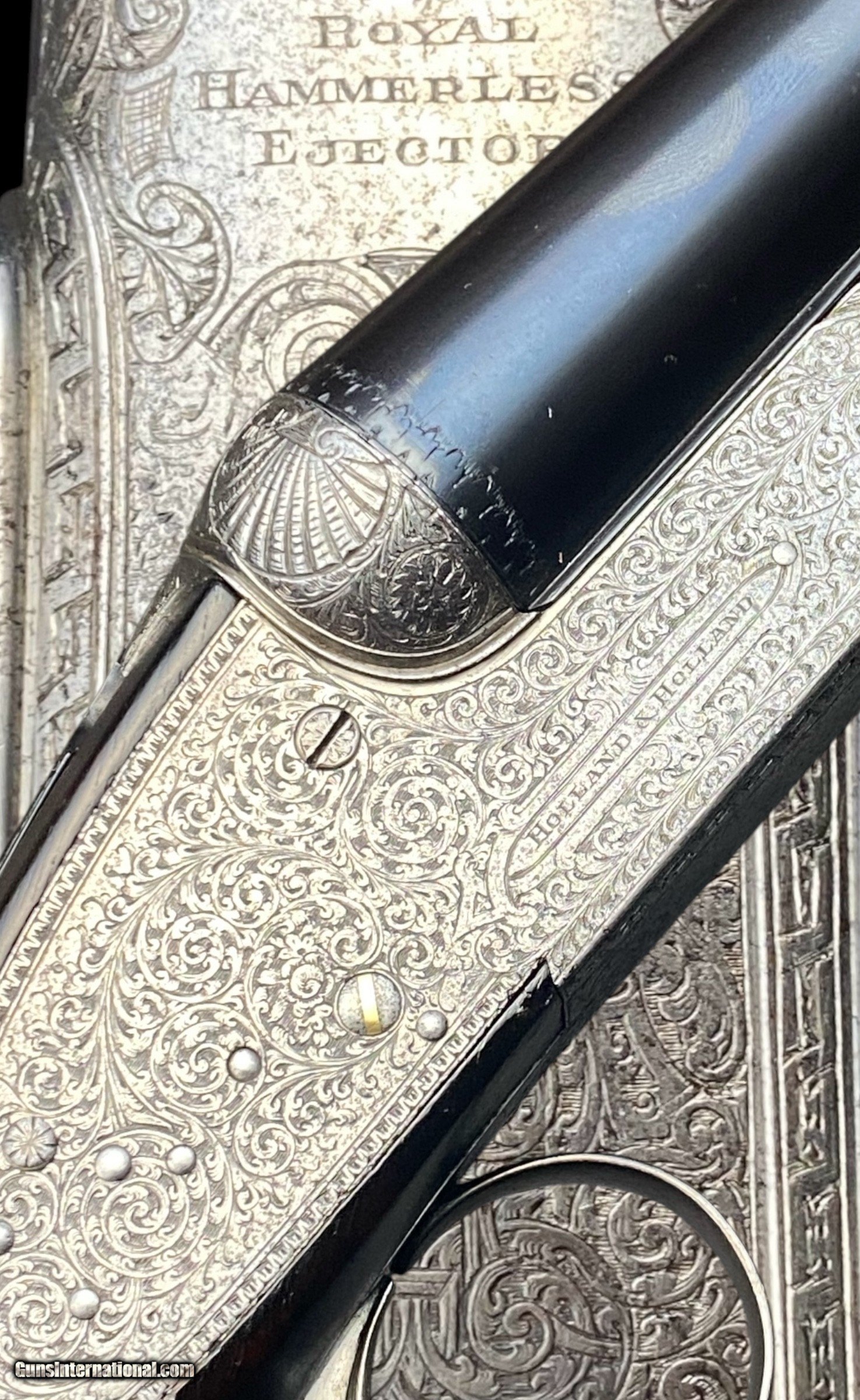 Description: HOLLAND & HOLLAND -- ENGLAND MODEL: ROYAL EJECTOR SIDELOCK MFG - 1893-1896 12GA - 2 1/2" NITRO NEW BARRELS H&H ROYAL EJECTOR HAND ENGRAVED PATTERN WITH LOVELY SHELL ENGRAVINGS ON THE BOLSTERS. BBLS: 27" - MARKED - "HOLLAND & HOLLAND 98 NEW BOND STREET LONDON" W/ MODERN SLEEVED BARRELS & PROOFS CHOKES: 011" / 022" SPECS: R: .721 BORE MIN WALL: .037 L: .720 BORE MIN WALL: .040 DOUBLE TRIGGERS EJECTORS NICELY FIGURED ENGLISH WALNUT STRAIGHT GRIP STOCK AND SPLINTER FOREND CHECKERED HORN BUTTPLATE DIMS: LOP: 14 1/2", DAC: 1 1/2" DAH: 2" WEIGHT: 6LBS 4OZ CONDITION : EXCELLENT OVERALL AS LONDON QUALITY MAINTAINED. BORES CLEAR. EJECTORS IN-TIME. SCANT VERY LIGHT IMPRESSIONS ON WOOD. ACTION TIGHT AND ON-FACE. GENTLEMEN, HERE WE HAVE A BEAUTIFUL H&H ROYAL EJECTOR THAT IS FIT FOR USE AND WITH GREAT DIMENSIONS. THE LONDON SLEEVED BARRELS WERE A $10K UPGRADE AND PROPERLY DONE. AN ANTIQUE STATUS GUN WITH MODERN BARRELS! A FANTASTIC HOLLAND ROYAL AT A FRACTION OF NEW. A TRUE CLASSIC IN THE FIELD. PLEASE CALL NOW! WE HAVE ELEY 2 1/2" SHELLS AVAILABLE!!! PLEASE CALL! FLAT $50 S/H/I CARD FEE APPLIES SOLD Antique: Yes Shotgun Gauge: 12 Gauge Manufacturer: HOLLAND & HOLLAND Model: ROYAL HAMMERLESS EJECTOR Serial Number: 16458 Barrel Length: 27 Chambers: 2.5 Ejectors: YES Condition: EXC Metal Condition: EXC Wood Condition: EXC Bore Condition: EXC Action: SLE Triggers: DOUBLE Weight: 6LBS 4 OZ Proof:Nitro: YES |