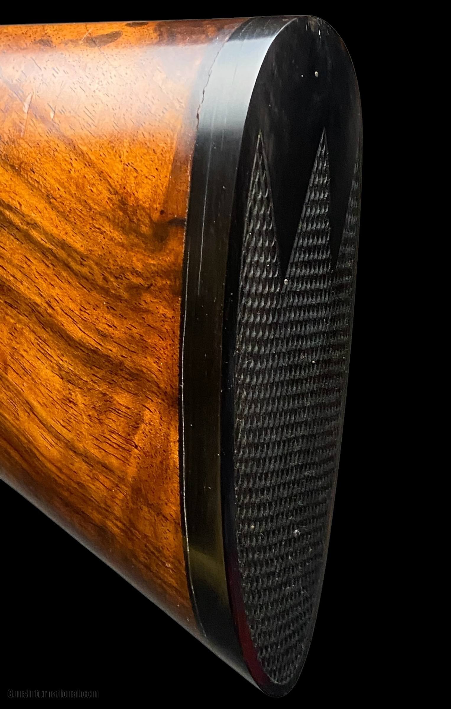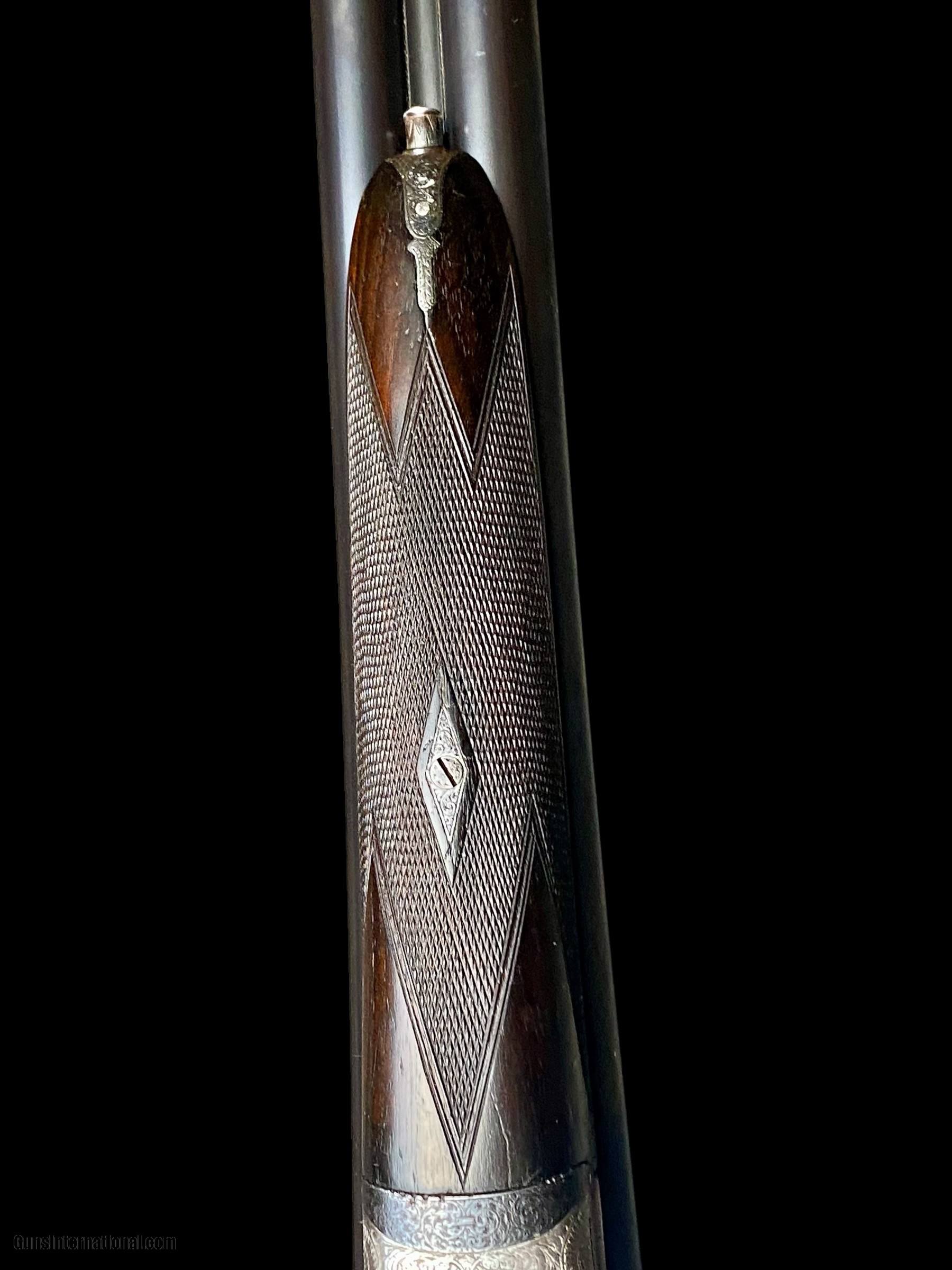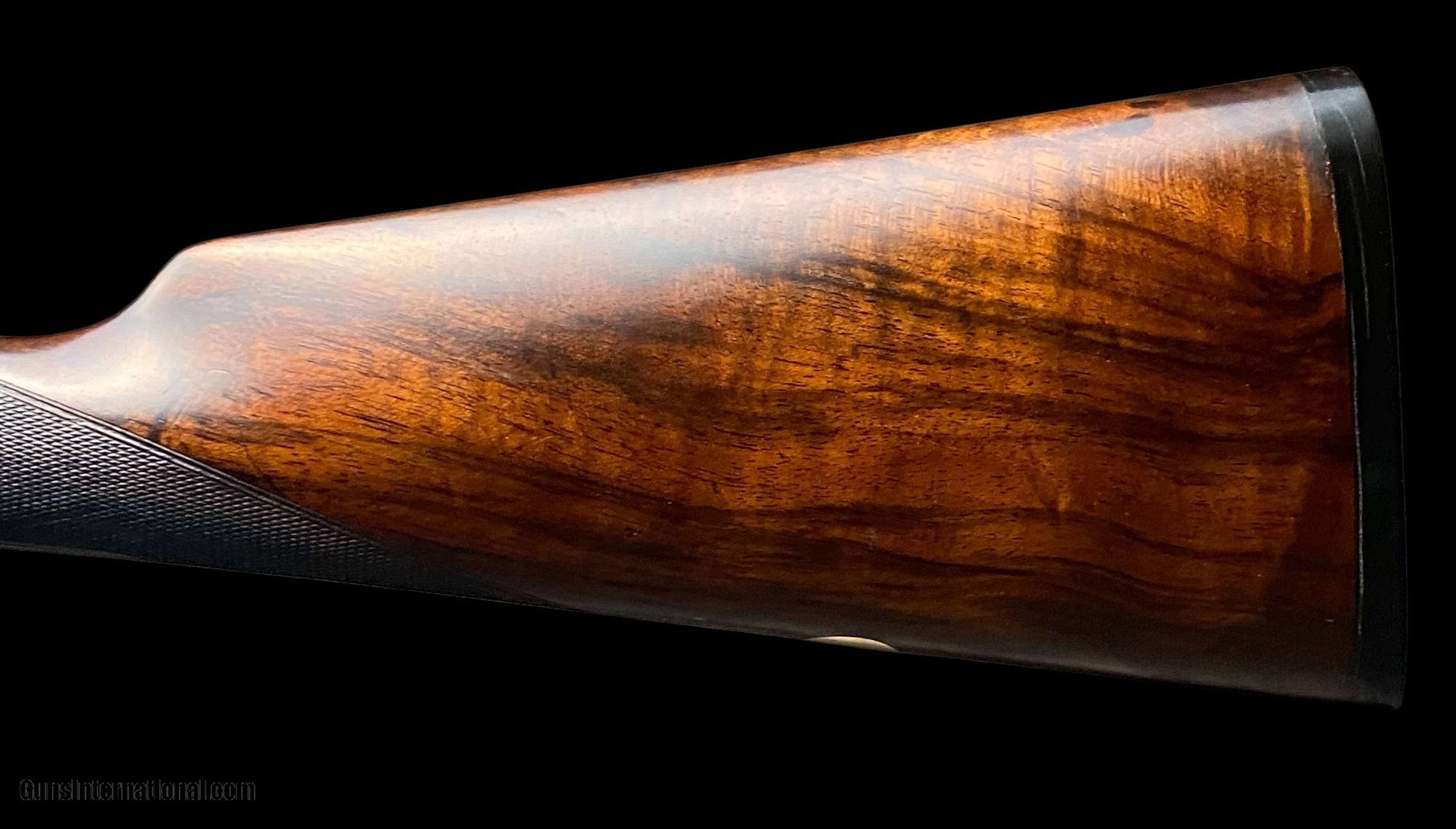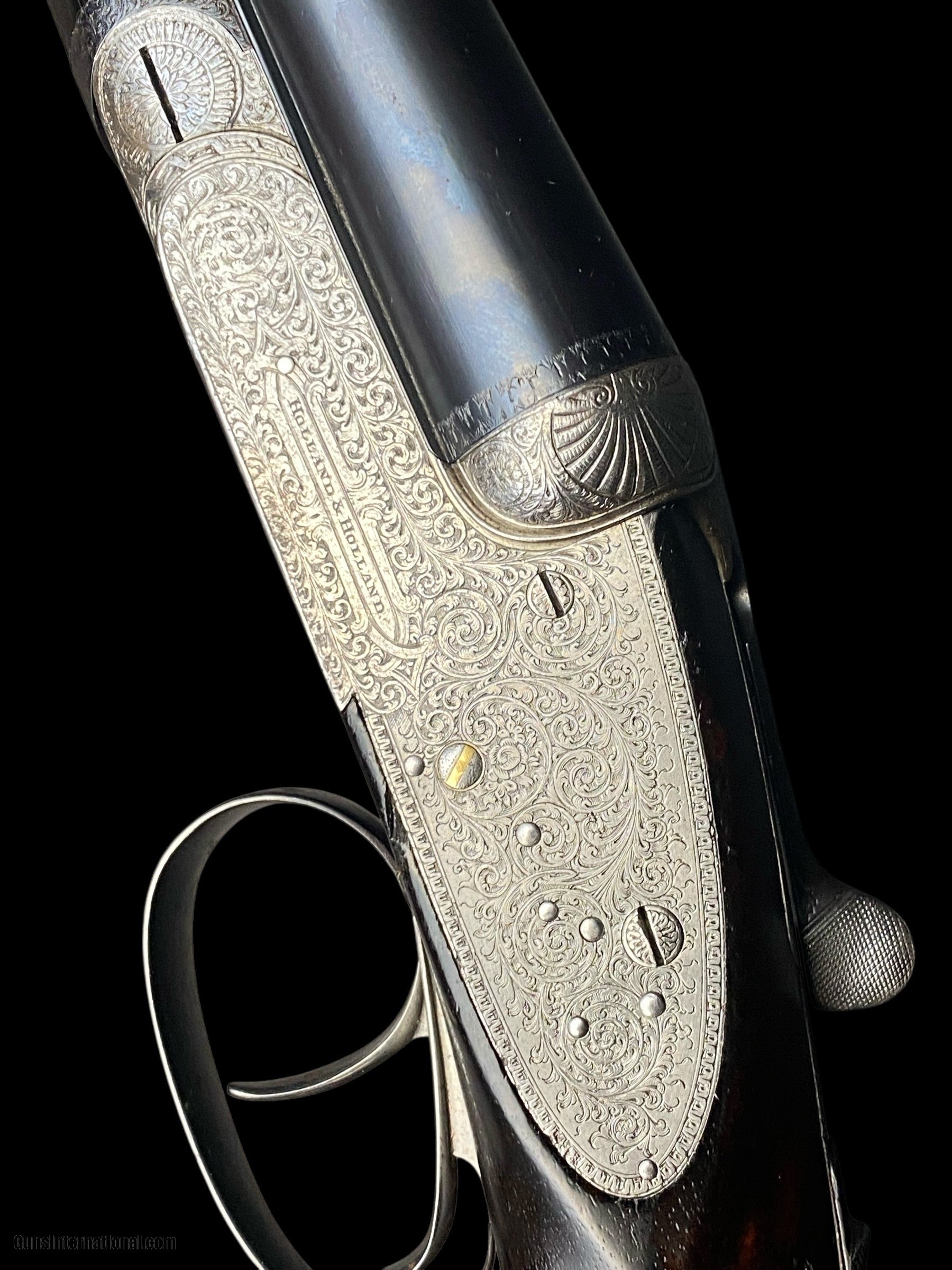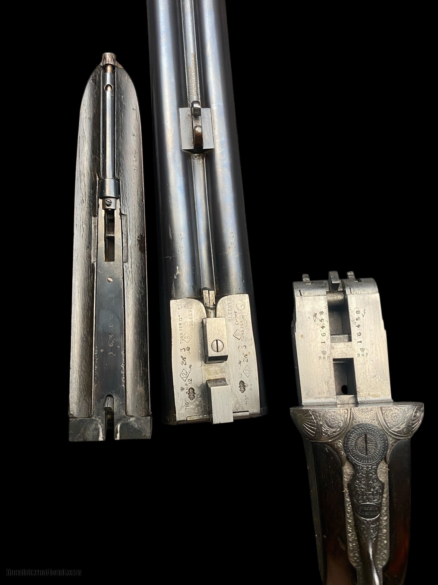Description: HOLLAND & HOLLAND -- ENGLAND MODEL: ROYAL EJECTOR SIDELOCK MFG - 1893-1896 12GA - 2 1/2" NITRO NEW BARRELS H&H ROYAL EJECTOR HAND ENGRAVED PATTERN WITH LOVELY SHELL ENGRAVINGS ON THE BOLSTERS. BBLS: 27" - MARKED - "HOLLAND & HOLLAND 98 NEW BOND STREET LONDON" W/ MODERN SLEEVED BARRELS & PROOFS CHOKES: 011" / 022" SPECS: R: .721 BORE MIN WALL: .037 L: .720 BORE MIN WALL: .040 DOUBLE TRIGGERS EJECTORS NICELY FIGURED ENGLISH WALNUT STRAIGHT GRIP STOCK AND SPLINTER FOREND CHECKERED HORN BUTTPLATE DIMS: LOP: 14 1/2", DAC: 1 1/2" DAH: 2" WEIGHT: 6LBS 4OZ CONDITION : EXCELLENT OVERALL AS LONDON QUALITY MAINTAINED. BORES CLEAR. EJECTORS IN-TIME. SCANT VERY LIGHT IMPRESSIONS ON WOOD. ACTION TIGHT AND ON-FACE. GENTLEMEN, HERE WE HAVE A BEAUTIFUL H&H ROYAL EJECTOR THAT IS FIT FOR USE AND WITH GREAT DIMENSIONS. THE LONDON SLEEVED BARRELS WERE A $10K UPGRADE AND PROPERLY DONE. AN ANTIQUE STATUS GUN WITH MODERN BARRELS! A FANTASTIC HOLLAND ROYAL AT A FRACTION OF NEW. A TRUE CLASSIC IN THE FIELD. PLEASE CALL NOW! WE HAVE ELEY 2 1/2" SHELLS AVAILABLE!!! PLEASE CALL! FLAT $50 S/H/I CARD FEE APPLIES SOLD Antique: Yes Shotgun Gauge: 12 Gauge Manufacturer: HOLLAND & HOLLAND Model: ROYAL HAMMERLESS EJECTOR Serial Number: 16458 Barrel Length: 27 Chambers: 2.5 Ejectors: YES Condition: EXC Metal Condition: EXC Wood Condition: EXC Bore Condition: EXC Action: SLE Triggers: DOUBLE Weight: 6LBS 4 OZ Proof:Nitro: YES |