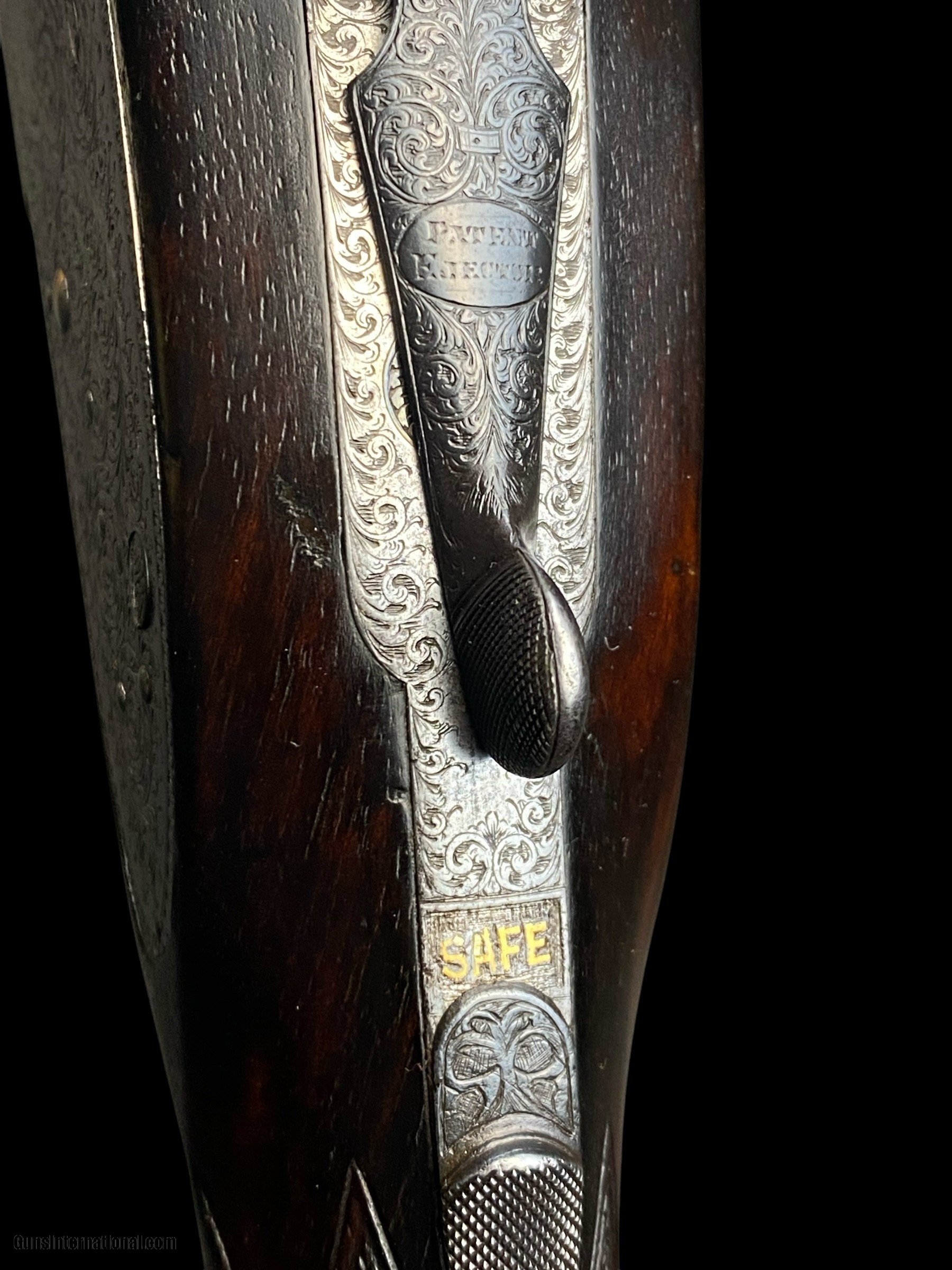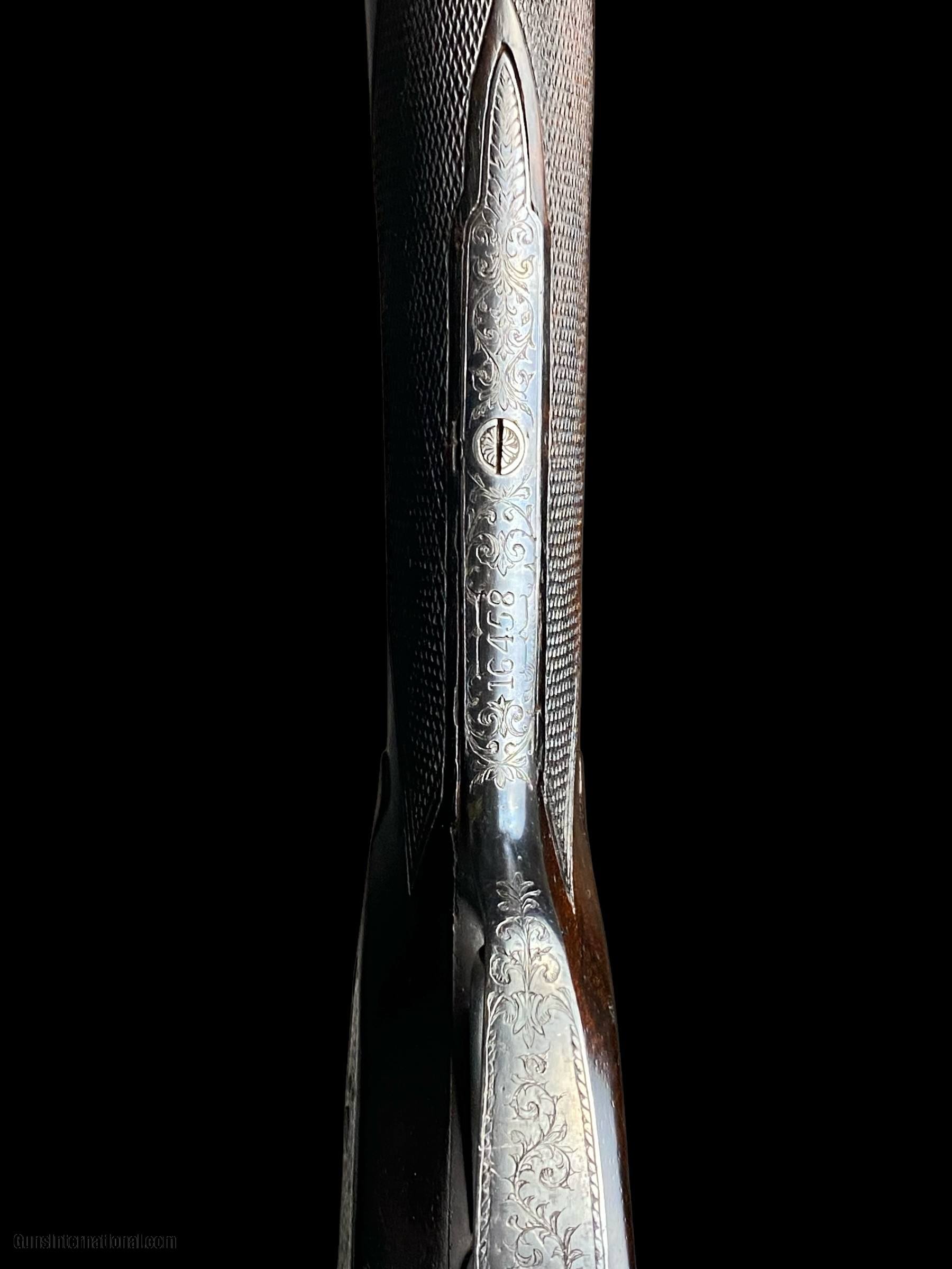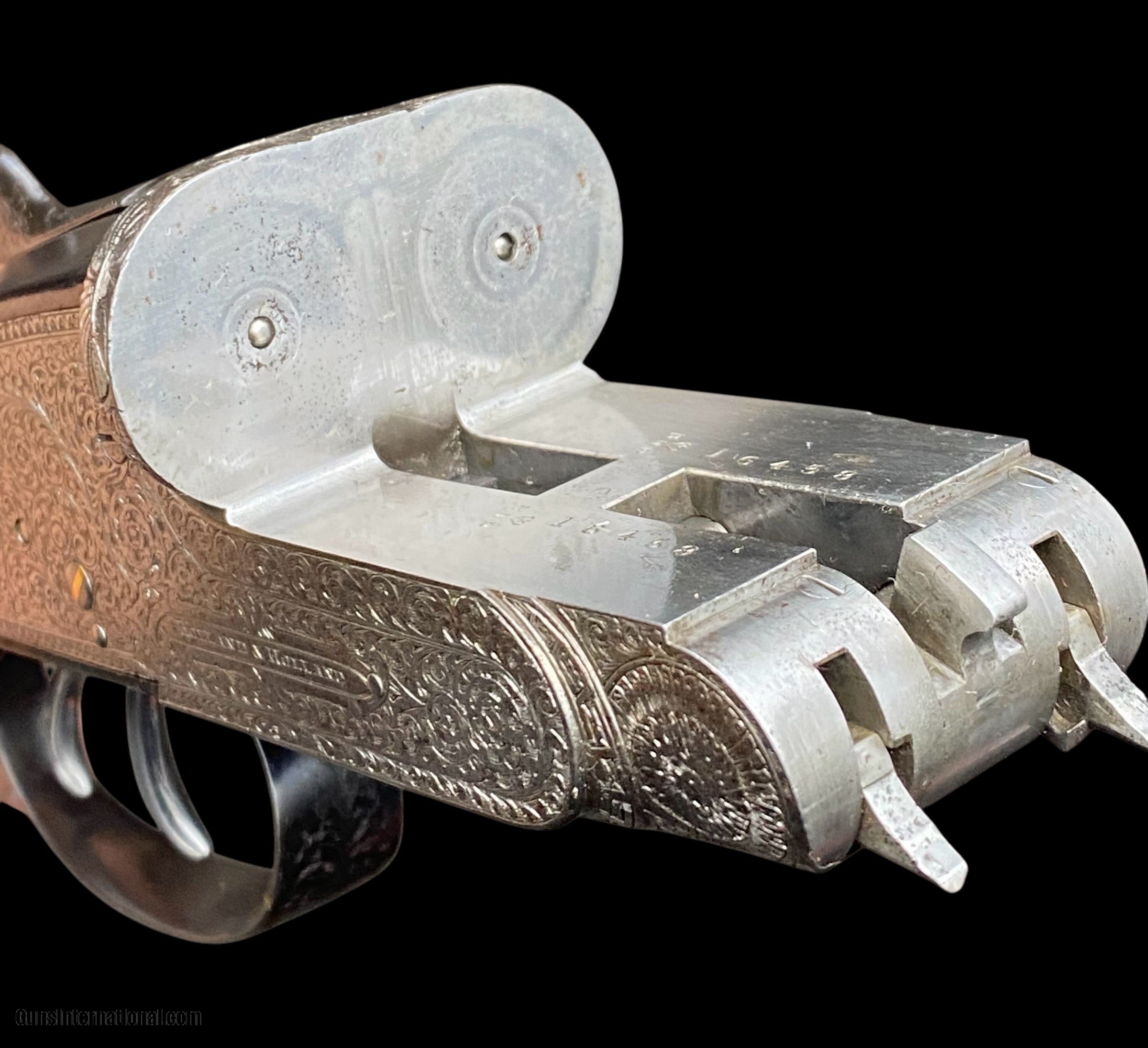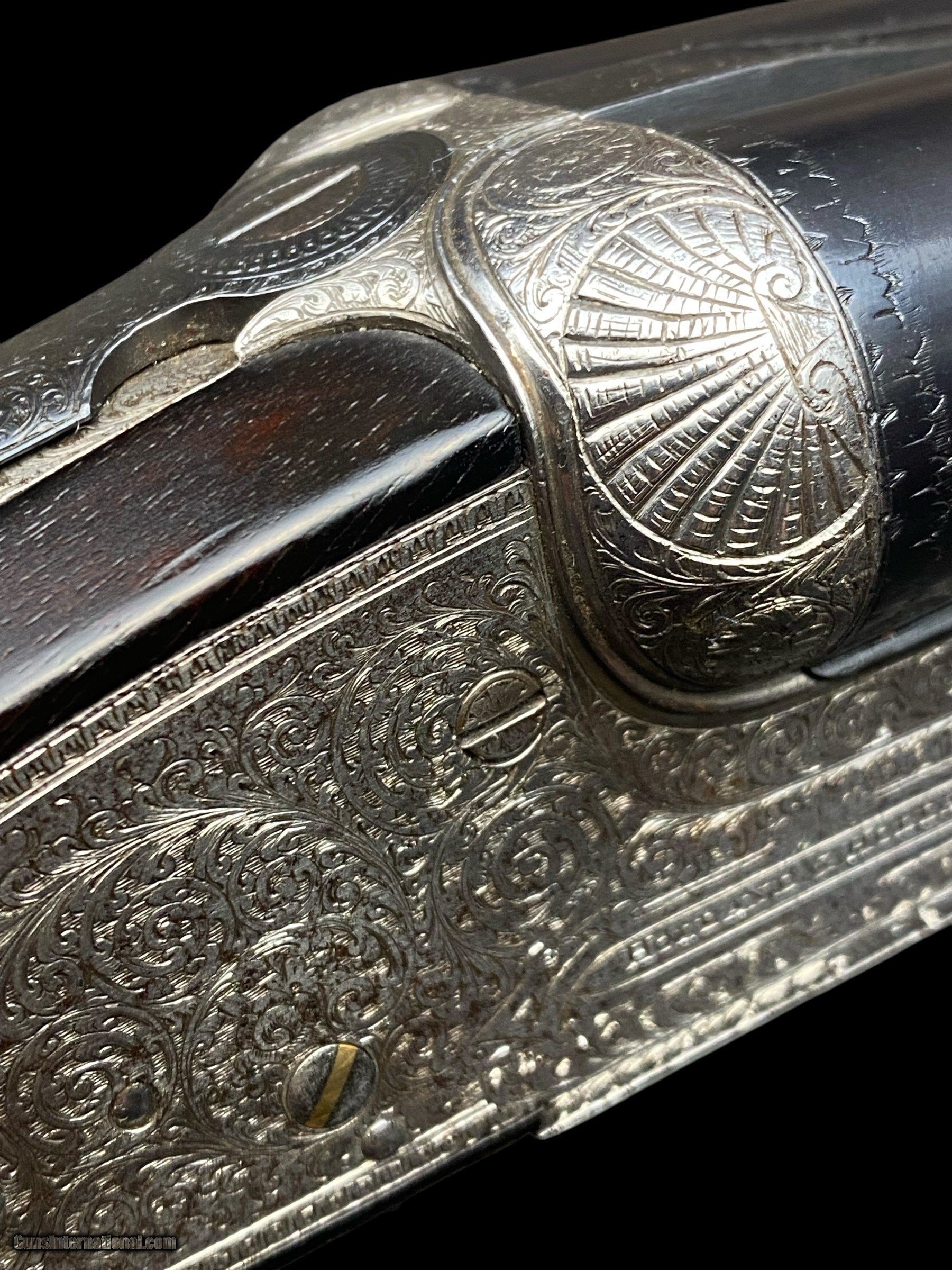 Description: HOLLAND & HOLLAND -- ENGLAND MODEL: ROYAL EJECTOR SIDELOCK MFG - 1893-1896 12GA - 2 1/2" NITRO NEW BARRELS H&H ROYAL EJECTOR HAND ENGRAVED PATTERN WITH LOVELY SHELL ENGRAVINGS ON THE BOLSTERS. BBLS: 27" - MARKED - "HOLLAND & HOLLAND 98 NEW BOND STREET LONDON" W/ MODERN SLEEVED BARRELS & PROOFS CHOKES: 011" / 022" SPECS: R: .721 BORE MIN WALL: .037 L: .720 BORE MIN WALL: .040 DOUBLE TRIGGERS EJECTORS NICELY FIGURED ENGLISH WALNUT STRAIGHT GRIP STOCK AND SPLINTER FOREND CHECKERED HORN BUTTPLATE DIMS: LOP: 14 1/2", DAC: 1 1/2" DAH: 2" WEIGHT: 6LBS 4OZ CONDITION : EXCELLENT OVERALL AS LONDON QUALITY MAINTAINED. BORES CLEAR. EJECTORS IN-TIME. SCANT VERY LIGHT IMPRESSIONS ON WOOD. ACTION TIGHT AND ON-FACE. GENTLEMEN, HERE WE HAVE A BEAUTIFUL H&H ROYAL EJECTOR THAT IS FIT FOR USE AND WITH GREAT DIMENSIONS. THE LONDON SLEEVED BARRELS WERE A $10K UPGRADE AND PROPERLY DONE. AN ANTIQUE STATUS GUN WITH MODERN BARRELS! A FANTASTIC HOLLAND ROYAL AT A FRACTION OF NEW. A TRUE CLASSIC IN THE FIELD. PLEASE CALL NOW! WE HAVE ELEY 2 1/2" SHELLS AVAILABLE!!! PLEASE CALL! FLAT $50 S/H/I CARD FEE APPLIES SOLD Antique: Yes Shotgun Gauge: 12 Gauge Manufacturer: HOLLAND & HOLLAND Model: ROYAL HAMMERLESS EJECTOR Serial Number: 16458 Barrel Length: 27 Chambers: 2.5 Ejectors: YES Condition: EXC Metal Condition: EXC Wood Condition: EXC Bore Condition: EXC Action: SLE Triggers: DOUBLE Weight: 6LBS 4 OZ Proof:Nitro: YES |