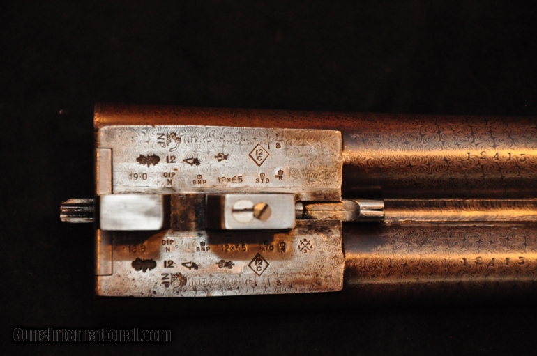 Description: Holland and Holland Royal sidelock ejector 12ga. An absolutely stunning circa 1891 Royal in pristine condition cased in original oak and leather case with a full compliment of accessories. Original Holland & Holland labels in the original to the gun case. Original thirty inch nitro proved damascus barrels with original 2 1/2 chambers. Bore diameters of 739 and 743 and minimum wall thickness of 23 and 21 thousandth choked skeet and cylinder. Clean bores and the browning throughout is beautiful. Timed ejectors. Classic, patented best back action locks (gold washed internals) with crisp and delicate bouquet and scroll engraving. Retaining 20% case colors, more in protected areas, a wonderful patina only a century of time can create. The furniture blacking is excellent and well maintained. Arguably one of the most finely figured stocks you will find on any gun of this era. Honey and smoke fiddleback english walnut to a checkered butt. Good checkering with minimal wear with a small dent or two. LOP is 14 5/8, at comb 1 1/2 at heel 2 1/4, 1/4 slight cast off for the a right handed shooter. Oak and Leather case is solid and free from cracks or gouges, complimented with ebony cleaning rods complete with jags and mops as supplied by the maker. Oil bottle, grease pot and snap caps all also marked Holland Royal. While uncertain of any provenance, whomever this gun was bespoken for had great taste. It's caretakers, myself included, have lovingly treated this gun like the lady she is. Pre 1898 gun, so I can ship to your front door. Shipping will be $79.00 and that includes insurance, packaging and a shipping crate to protect it. A bargain at $10,900. NOW $8,900! SOLD Curio/Relic: Yes Antique: Yes |