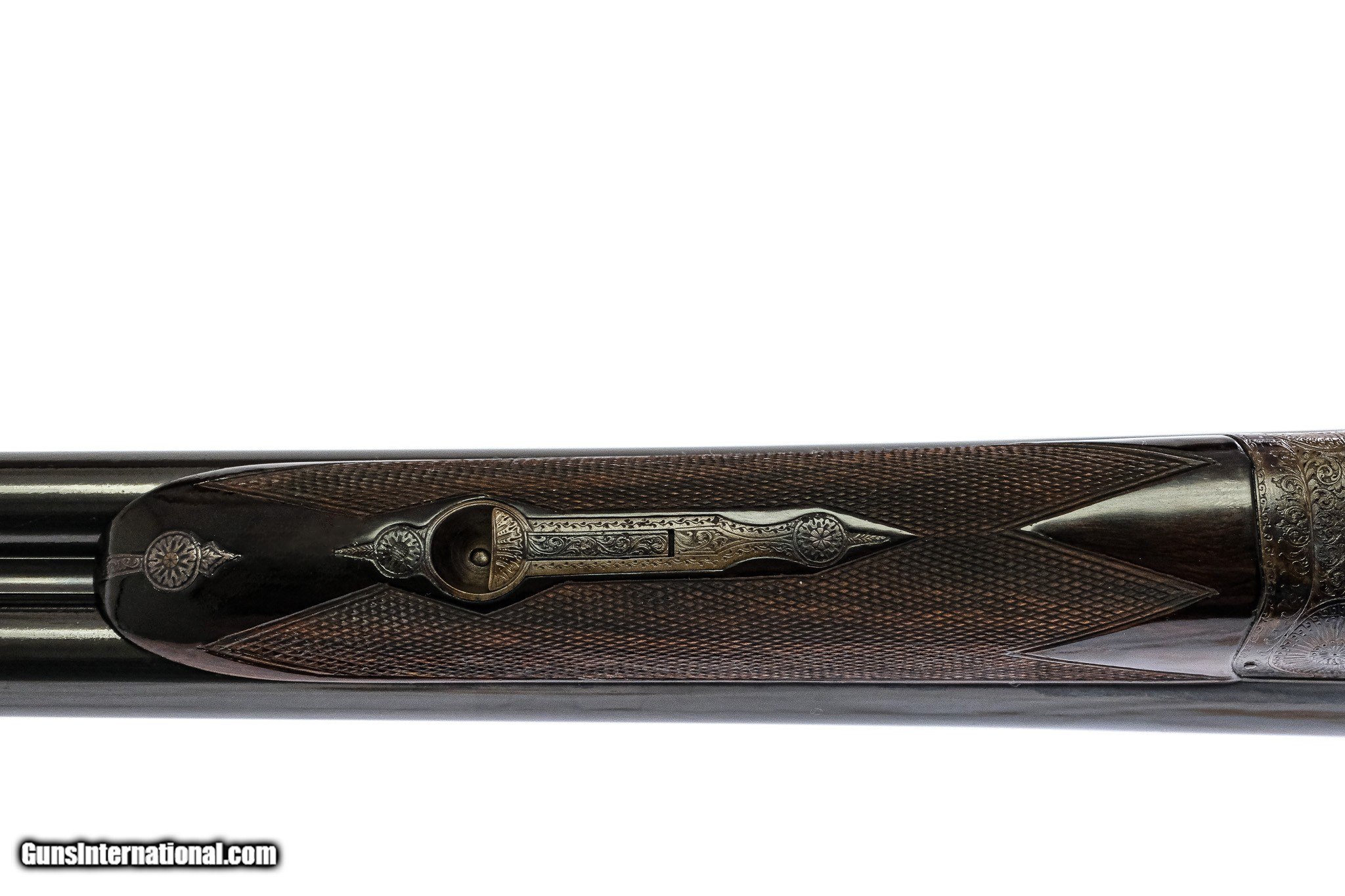 Description: Holland & Holland - Royal Grade, SxS, 12ga. 30" Barrels Choked C/M. Steel barrels choked at C/M , 2 ½" chamber, automatic safety , magnificent Acanthus scroll that is magnificently , marked “Royal Hammerless Ejector” , splinter forend, double trigger, straight grip, 1 1/8 oz proof, this gun has 100% blue, wood finish, checkering, and case color, it has been through a complete London style refurbishment, literally looks like a brand new gun… Vacant gold oval, original horn butt, sharp checkering with perfect screws, and deep dark case coloring, drop points, Turkish walnut, replacement cost of this gun is 150,000 virtually no difference between this gun and a brand new one. Inv: 71884 6 lbs. 8 oz. 14 ¼" x 1 ½" x 2 ½" $16,995.00 SOLD |