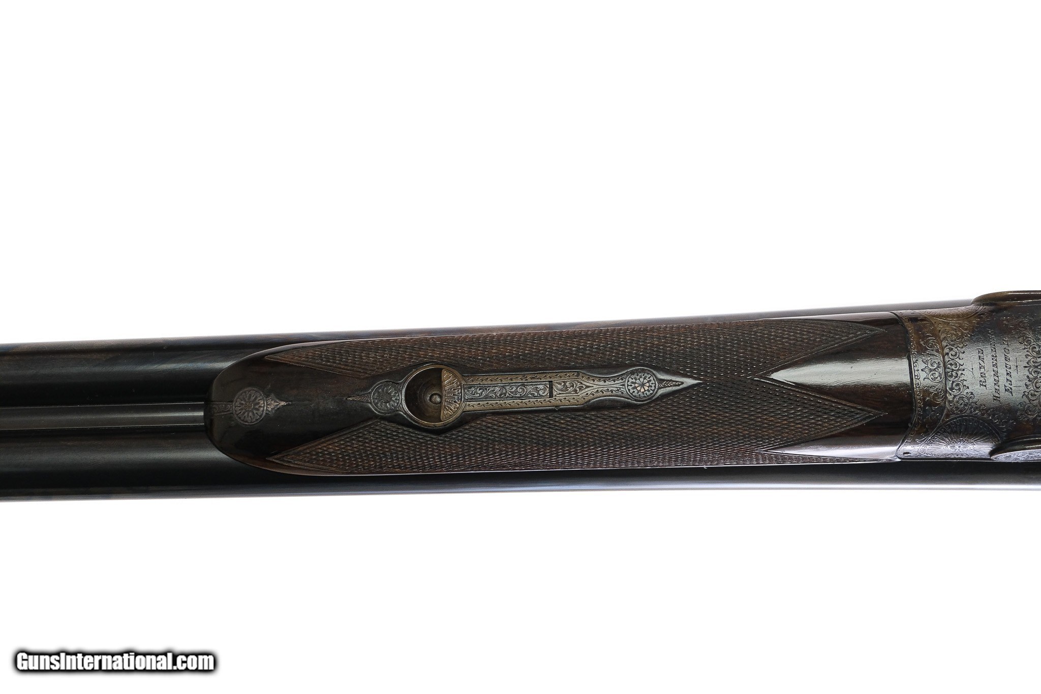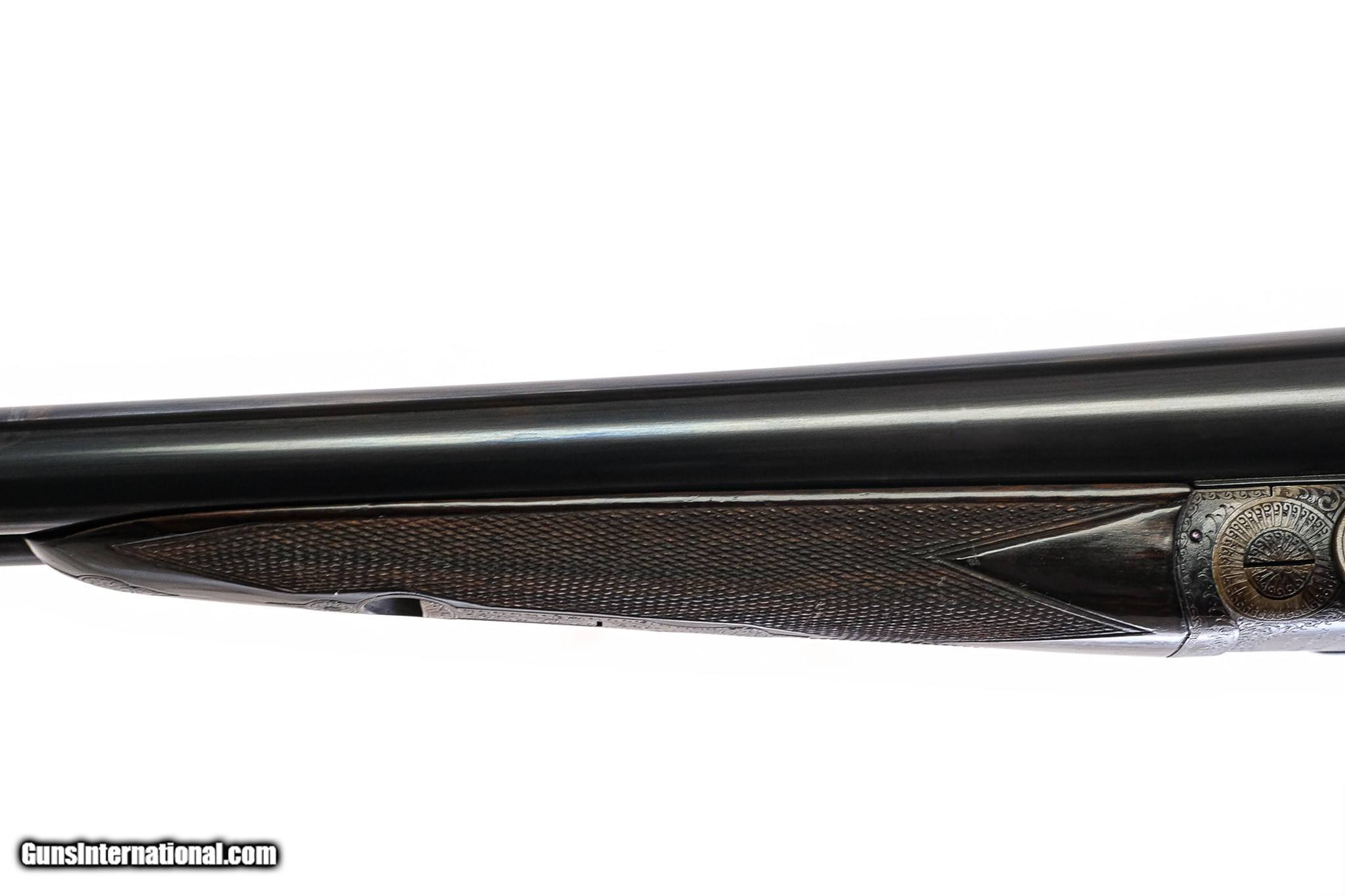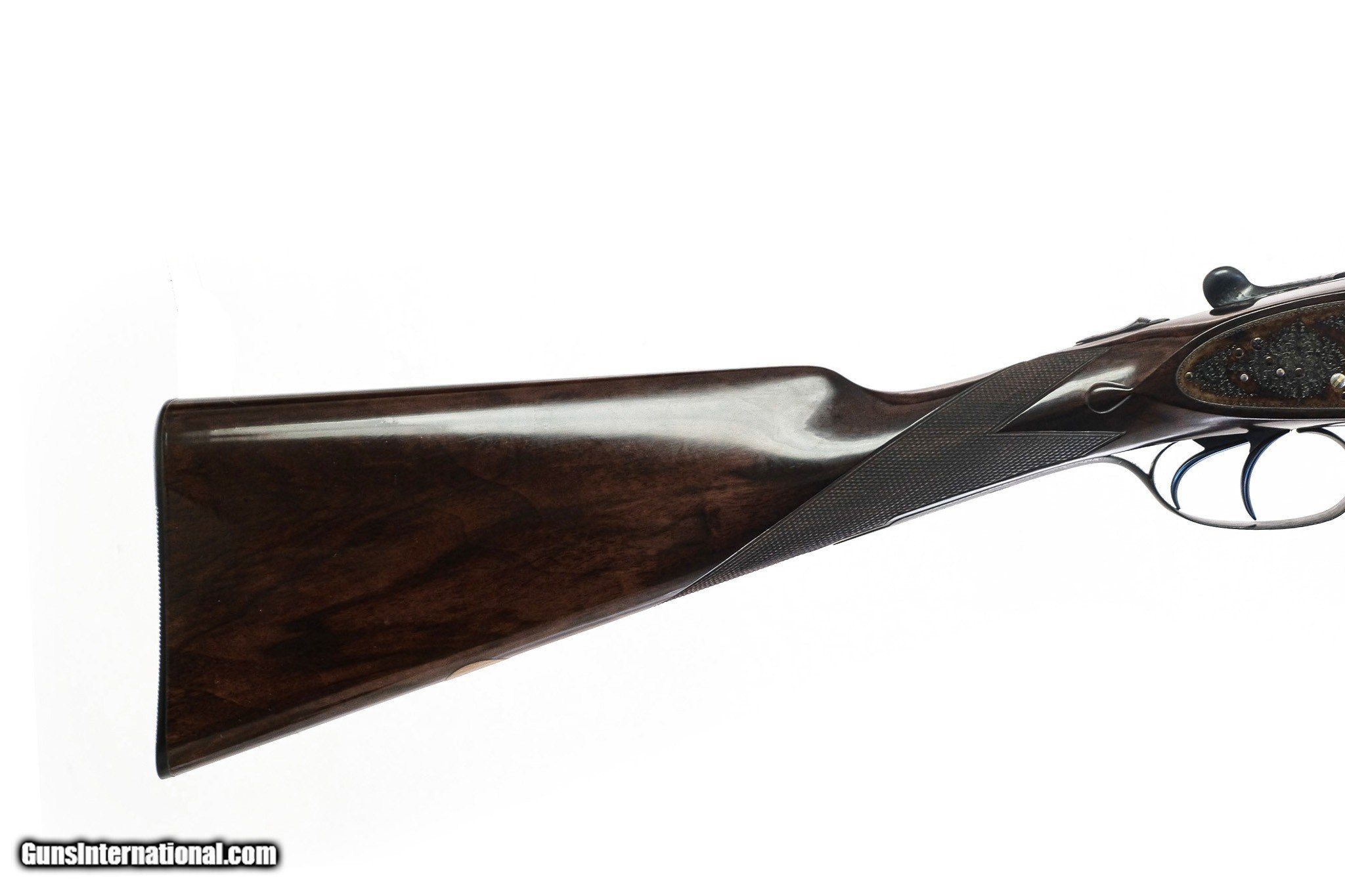 Description: Holland & Holland - Royal Grade, SxS, 12ga. 30" Barrels Choked C/M. Steel barrels choked at C/M , 2 ½" chamber, automatic safety , magnificent Acanthus scroll that is magnificently , marked “Royal Hammerless Ejector” , splinter forend, double trigger, straight grip, 1 1/8 oz proof, this gun has 100% blue, wood finish, checkering, and case color, it has been through a complete London style refurbishment, literally looks like a brand new gun… Vacant gold oval, original horn butt, sharp checkering with perfect screws, and deep dark case coloring, drop points, Turkish walnut, replacement cost of this gun is 150,000 virtually no difference between this gun and a brand new one. Inv: 71884 6 lbs. 8 oz. 14 ¼" x 1 ½" x 2 ½" $16,995.00 SOLD |