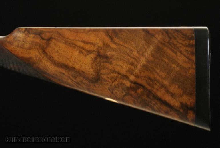Description: Holland & Holland Royal Sidelock Ejector, circa 1898, 12 bore, 2 3/4" chambers, 26" replacement fluid steel barrels in 1940 with original nitro proof of 1 1/8 oz. and a 1990 reproof of 850 BAR and for 2 3/4" chambers, choked .006 Skt. and .032 Lt. Full, barrel tubes engraved "Holland & Holland on right and "98 New Bond Street, London" on left tube, concave game rib, ejectors, 6 lbs. 4 oz., 14 7/8" LOP over a 5/8" ebony butt plate, 1 5/8" DAC, 1 7/8" DAH, 1/4" cast off for right hand shooters, best English scroll and rose engraving pattern with the maker's name on the sides of the action, the bottom of the action engraved the same with "Royal Ejector, Patent No. 20979", the fences have finely carved large acanthus scroll, straight grip, splinter forend, double triggers, vacant gold oval in stock, nicely figured English walnut stock, gold line cocking indicators, automatic safety with "SAFE" in gold, "2" in gold on top lever, top lever engraved "Patent Ejector". Cased in period case that has been relined with replacement maker's label, gun, and charge card along with some accessories. Excellent condition gun with bores dead on at .729 on both and min. wall thickness at .026 and .021. SOLD Curio/Relic: Yes |