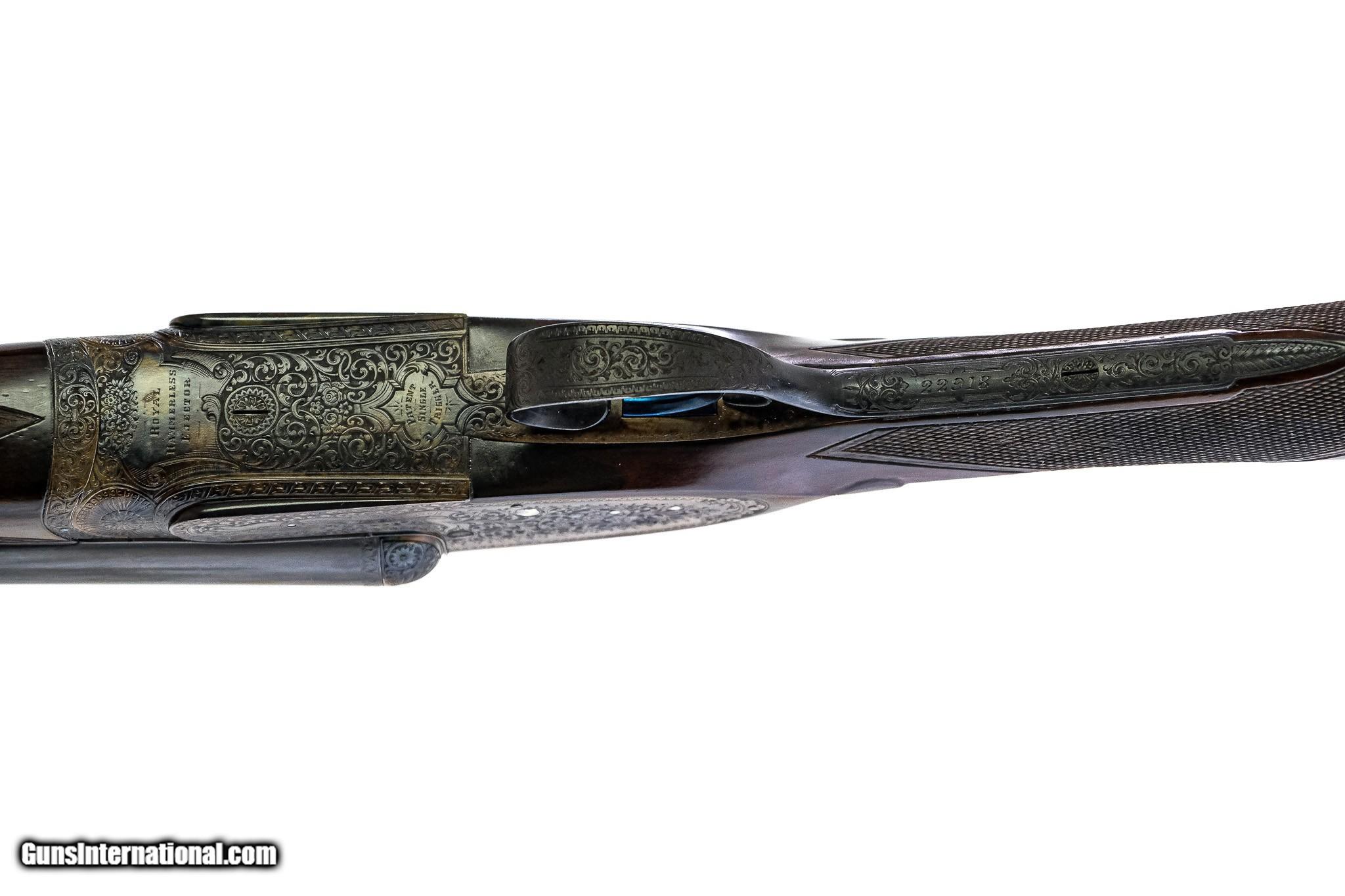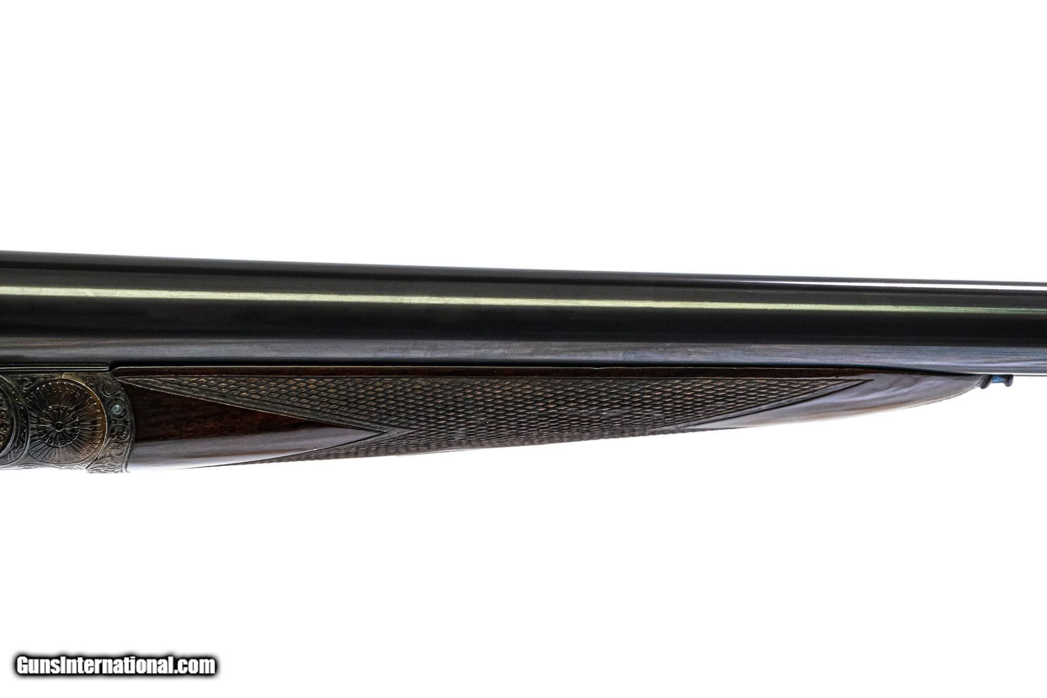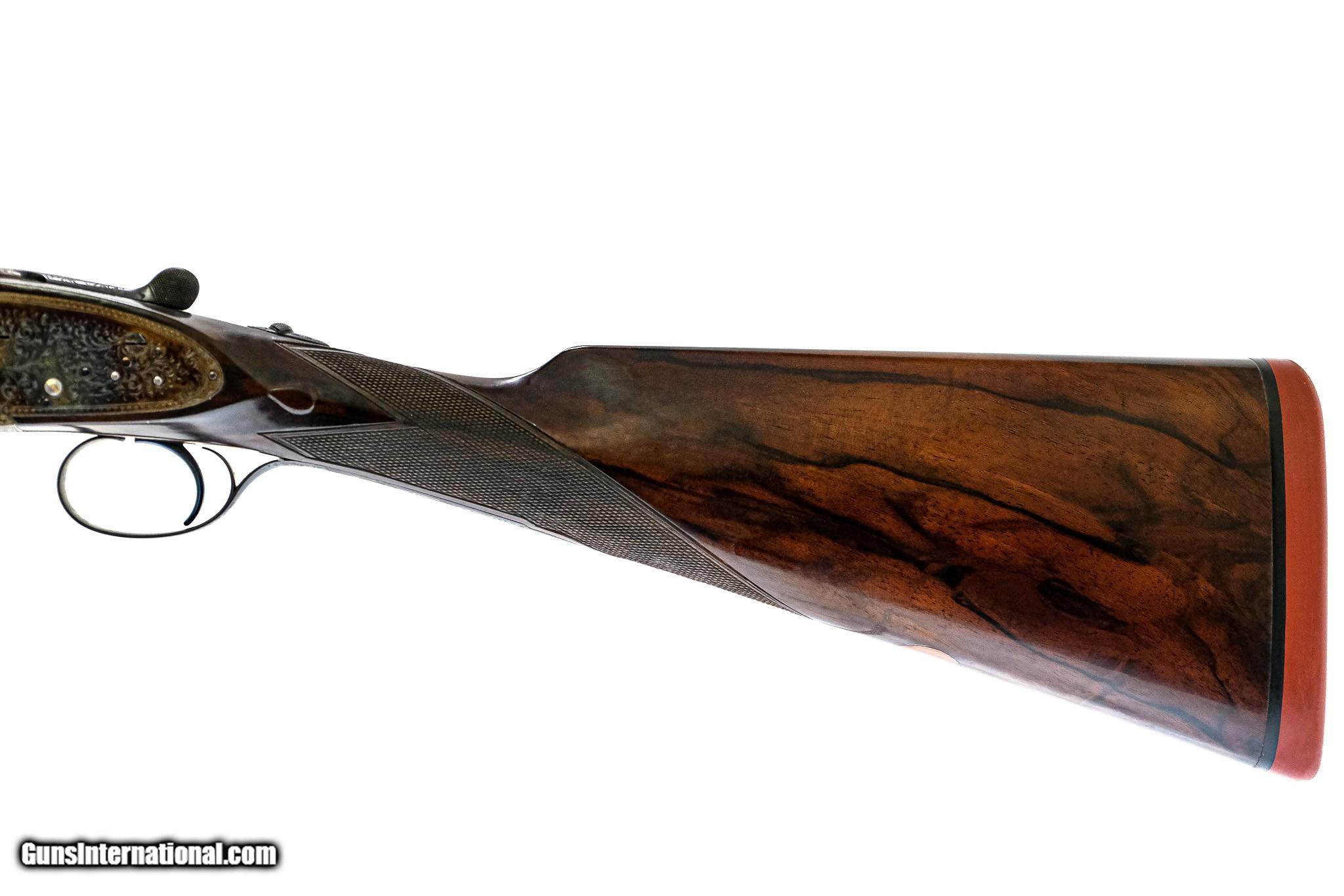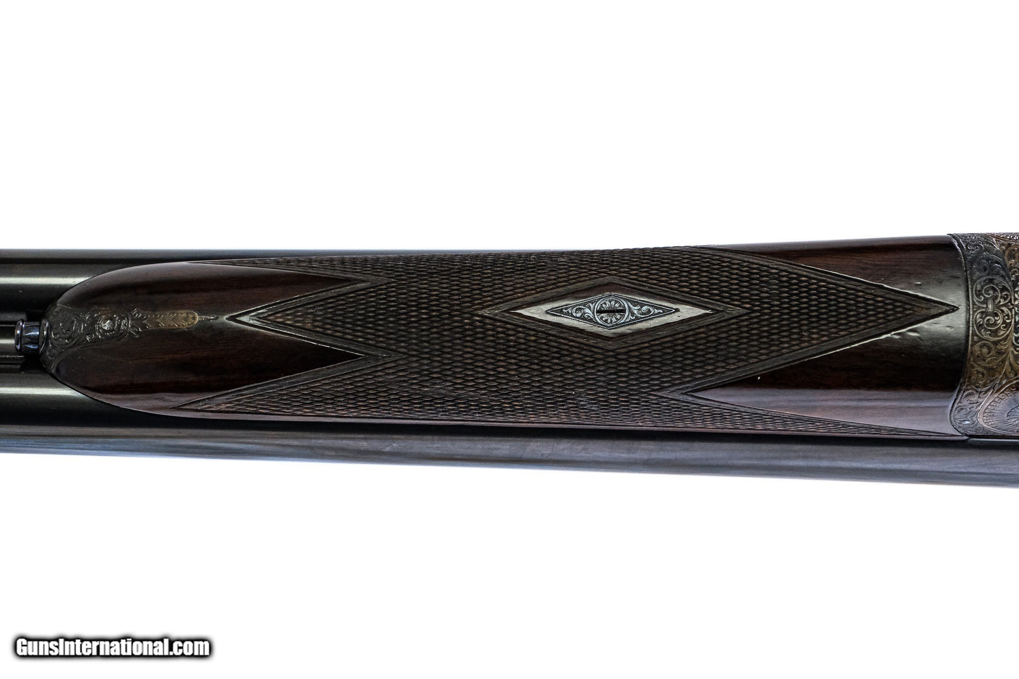 Description: Holland & Holland - Royal SxS, 12ga. 30" Barrels Choked CYL/IC. 30" barrels choked at Cylinder & Quarter, single trigger, automatic ejector, gold “2” inlayed on breach and bond street address , 2 ½ in chambers, gold safe, deep carved shell fences, gold inlayed cocking indicator, patented semi selective trigger, bottom of the frame marked “royal”, hammerless ejector, retains from a London quality refinishing, 100% as new condition in every possible way.. perfect engraving, checkering, and wood finish, highly figured French Walnut, straight grip, splinter forend, perfect screws, tight like they were new guns and onface. (If you’d like to make a pair we own gun 1 & 2, reach out for special pricing for pair.) Inv: 71901 6 lbs. 7 oz. 14 1/8" x 1 5/8" x 2 5/8" $18,995.00 SOLD |