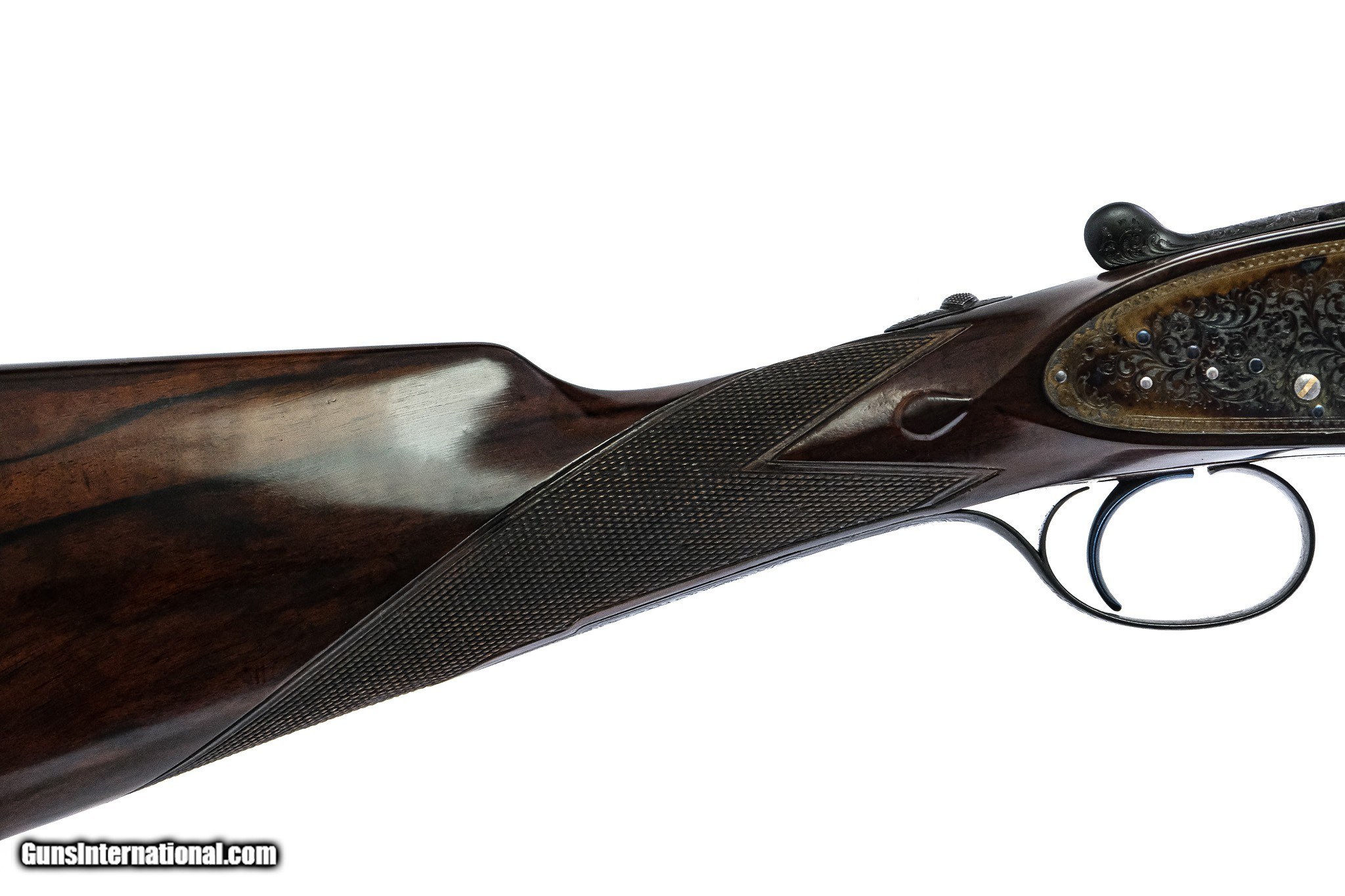 Description: Holland & Holland - Royal SxS, 12ga. 30" Barrels Choked CYL/IC. 30" barrels choked at Cylinder & Quarter, single trigger, automatic ejector, gold “2” inlayed on breach and bond street address , 2 ½ in chambers, gold safe, deep carved shell fences, gold inlayed cocking indicator, patented semi selective trigger, bottom of the frame marked “royal”, hammerless ejector, retains from a London quality refinishing, 100% as new condition in every possible way.. perfect engraving, checkering, and wood finish, highly figured French Walnut, straight grip, splinter forend, perfect screws, tight like they were new guns and onface. (If you’d like to make a pair we own gun 1 & 2, reach out for special pricing for pair.) Inv: 71901 6 lbs. 7 oz. 14 1/8" x 1 5/8" x 2 5/8" $18,995.00 SOLD |