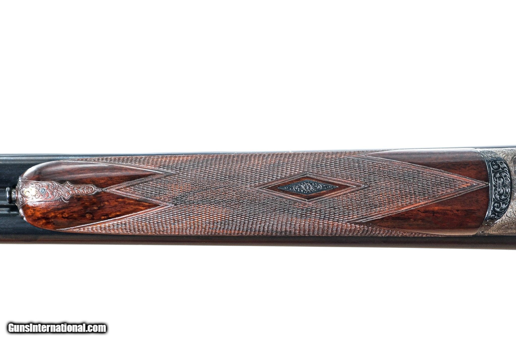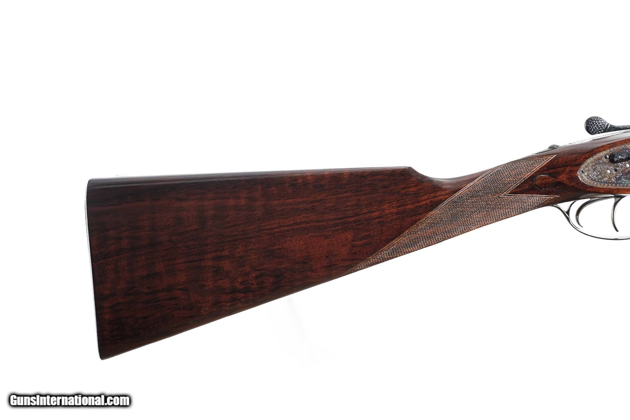 Description: Holland & Holland - Royal SxS, 16ga. 26 1/2" Barrels Choked IC / 1/4. 16ga with all accessories in case. 26 ½" barrels choked IC/ ¼ and was ordered that way. 2 ½" chambered, the rib engraved with the Royal and Holland and Holland 13 Bruton St, London, made in approximately 1965 and reproofed in 2023, a Gold #2 on the top lever and barrel, hand detachable sidelock, double trigger, automatic ejector, assisted opener, straight diamond grip with slight sweep in stock , automatic safety , splinter forend, bottom of the frame is marked “The Royal Model”, this gun has perfect drop points, a checkered butt, and has virtually all the color case hardening blue, and wood finish. The engraving on the gun is perfect sharp and clear… the screws are perfect. The gun shows little to no use on face and is very tight. Just a superior gun in every respect! Wood is proud! Drop points are clear! Just a beautiful gun in every aspect! Has a Holland Diamond grip! Inv: 82426 5 lbs. 15 oz. 14 ½" x 1 3/8" x 2" $22,500.00 SOLD |