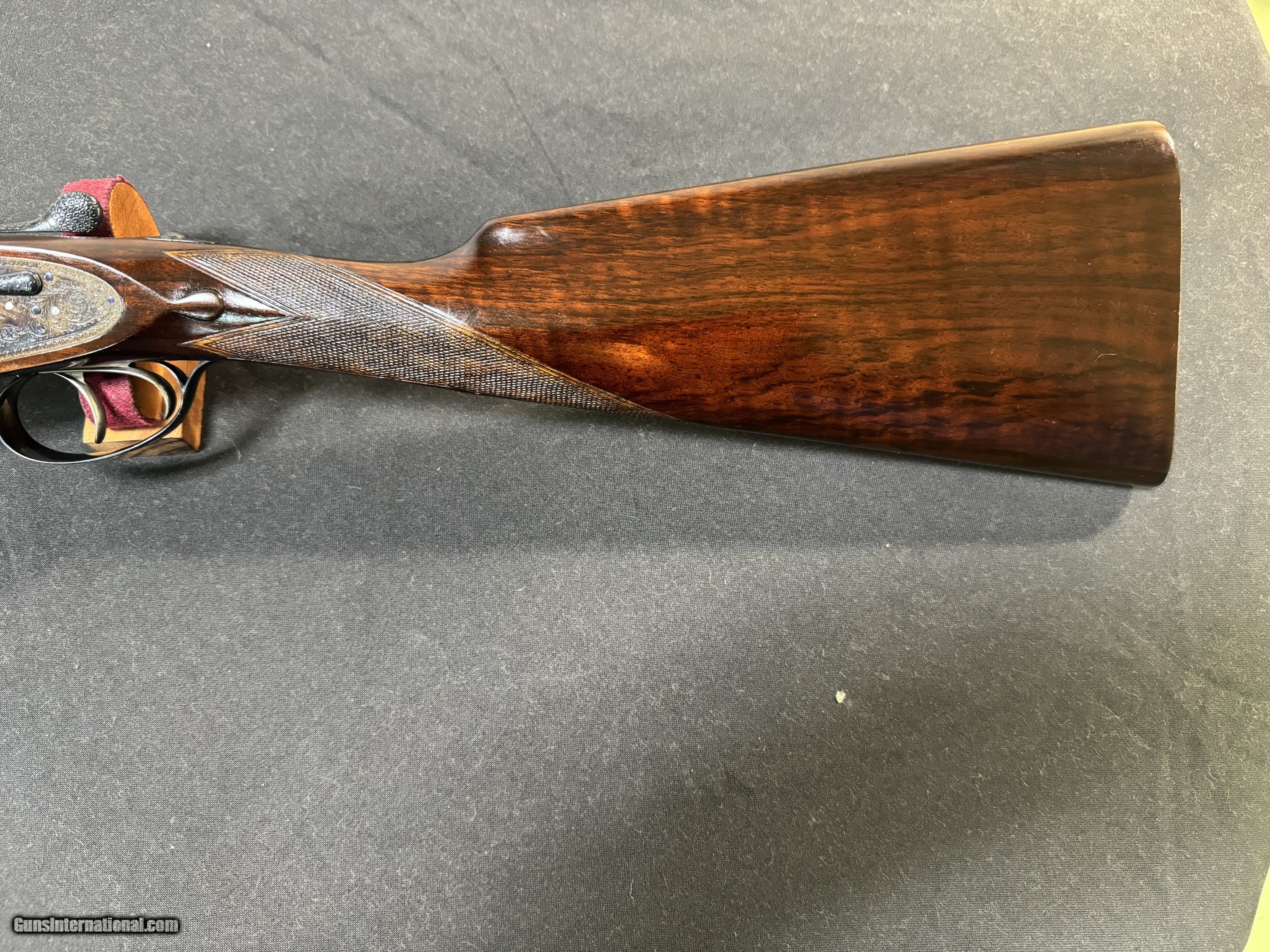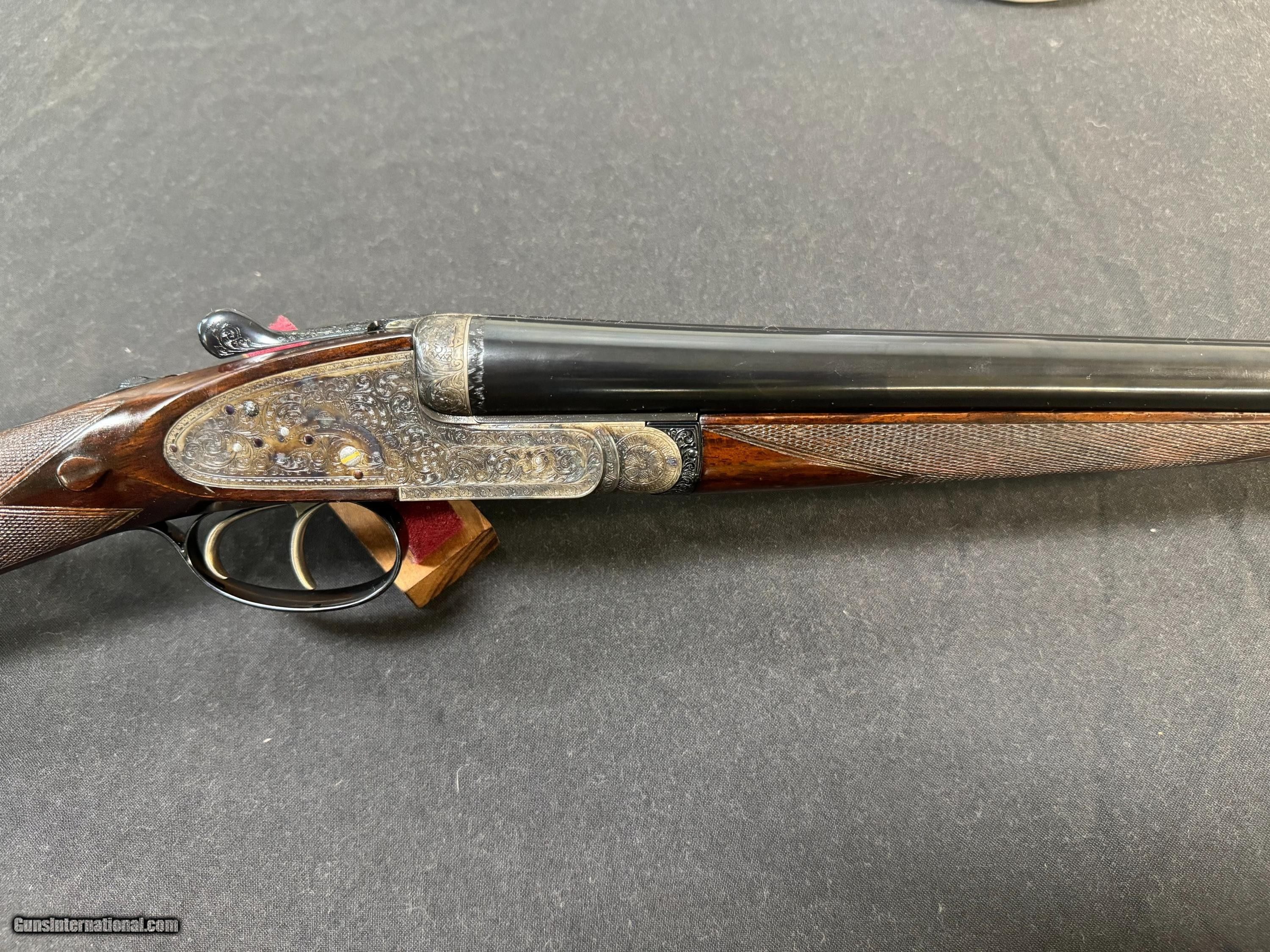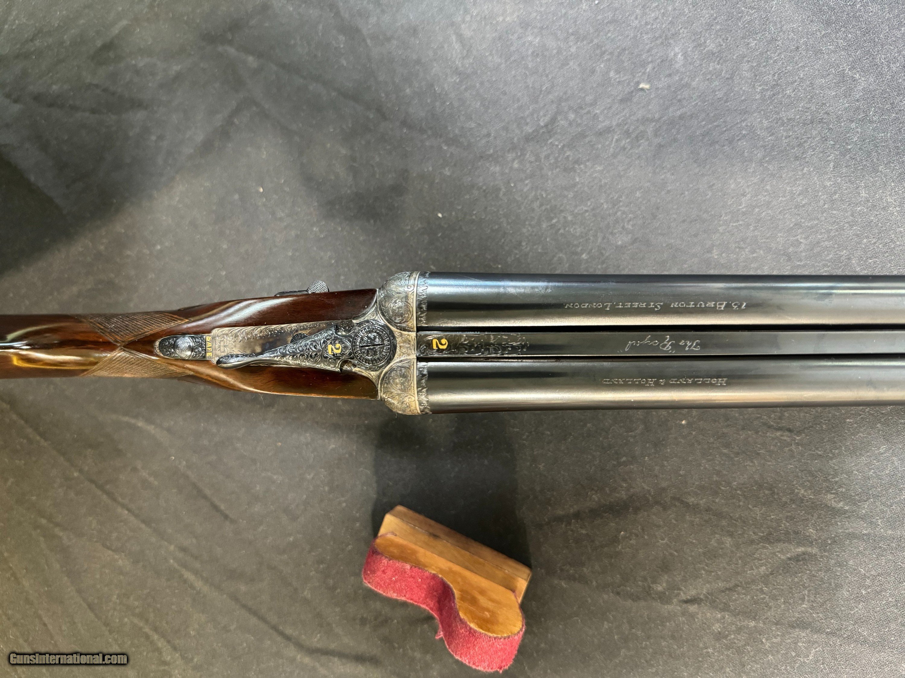 Description: 26 ½ inch barrels choked IC/ ¼ and was ordered that way. 2 ½ chambered, the rib engraved with the Royal and Holland and Holland 13 Bruton St, London, made in approximately 1965 and reproofed in 2023, a Gold #2 on the top lever and barrel, hand detachable sidelock, double trigger, automatic ejector, assisted opener, straight diamond grip with slight sweep in stock , automatic safety , splinter forend, bottom of the frame is marked “The Royal Model”, this gun has perfect drop points, a checkered butt, and has virtually all the color case hardening blue, and wood finish. The engraving on the gun is perfect sharp and clear… the screws are perfect. The gun shows little to no use on face and is very tight. Just a superior gun in every respect! Wood is proud! Drop points are clear! Just a beautiful gun in every aspect! Has a Holland Diamond grip! Inv: 82426 5lb 15oz 14 ½ x 1 3/8 x 2 $19,995.00 SOLD Shotgun Gauge: 16 Gauge |
