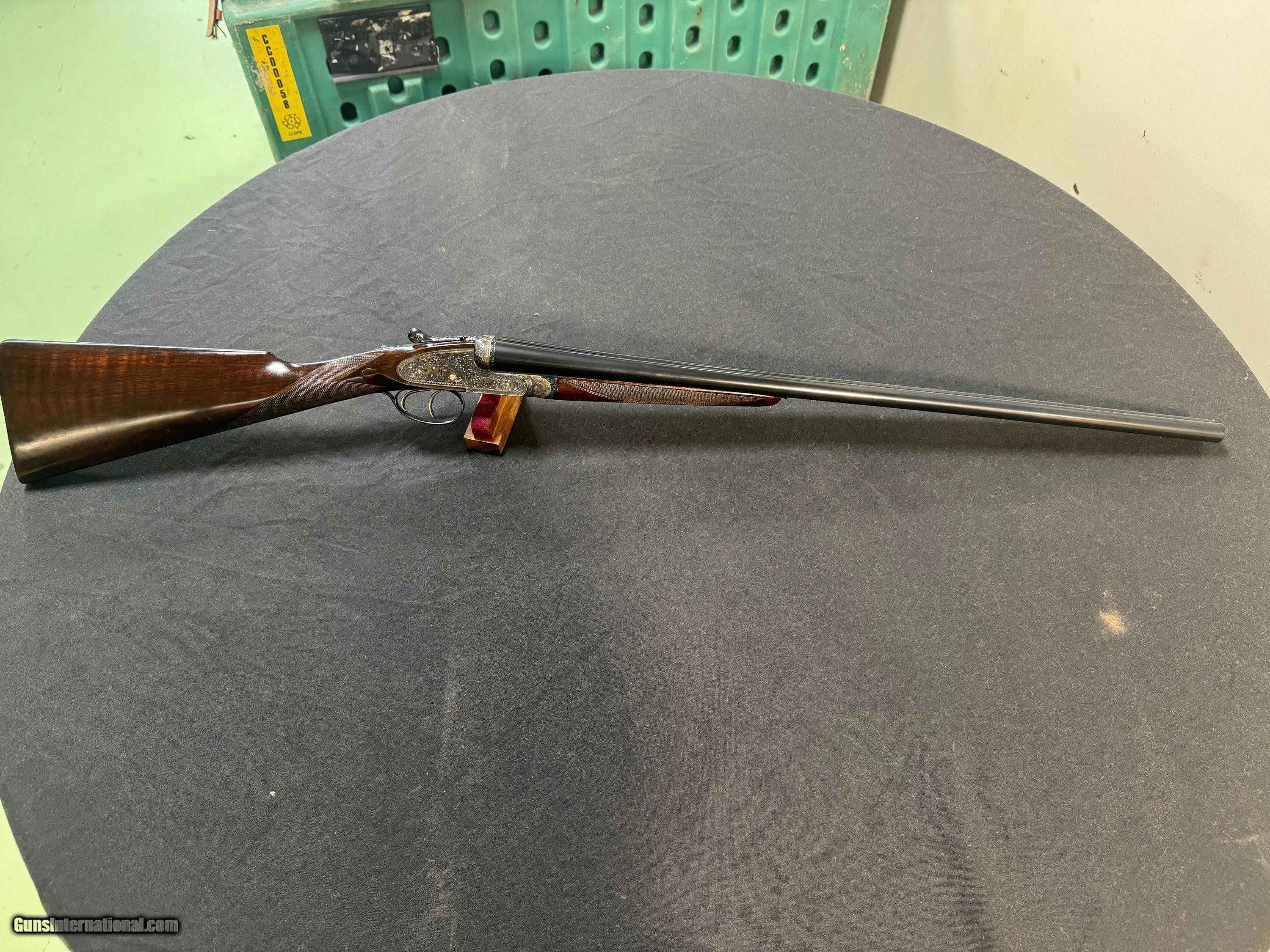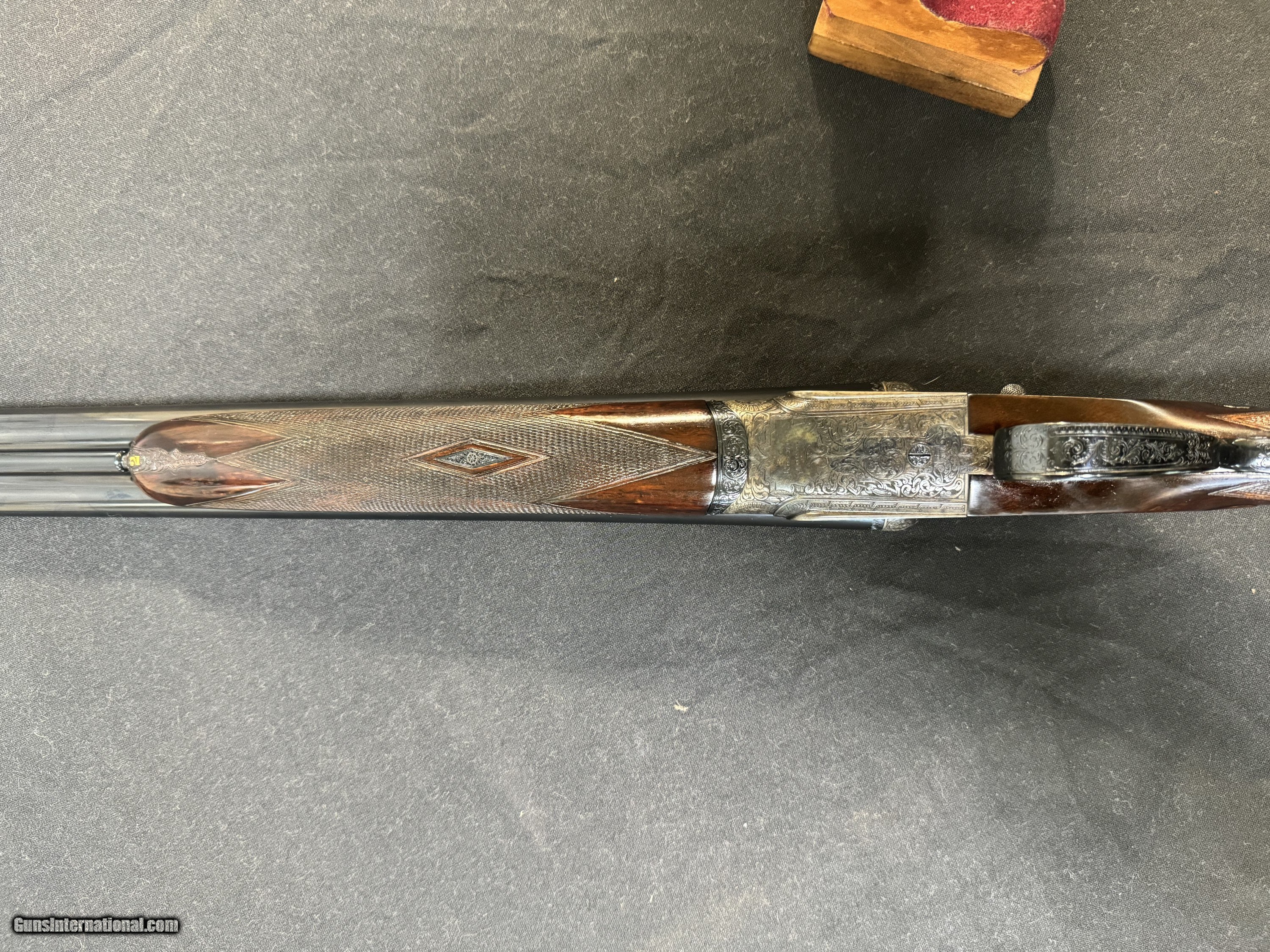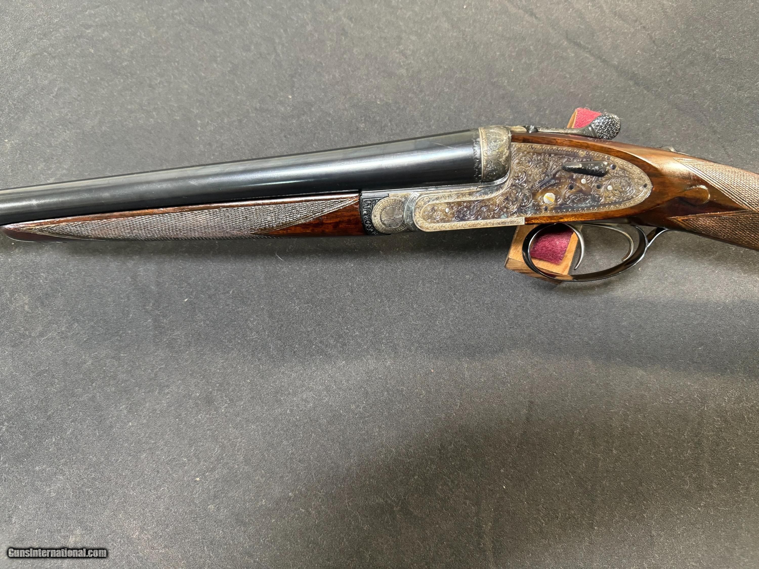 Description: 26 ½ inch barrels choked IC/ ¼ and was ordered that way. 2 ½ chambered, the rib engraved with the Royal and Holland and Holland 13 Bruton St, London, made in approximately 1965 and reproofed in 2023, a Gold #2 on the top lever and barrel, hand detachable sidelock, double trigger, automatic ejector, assisted opener, straight diamond grip with slight sweep in stock , automatic safety , splinter forend, bottom of the frame is marked “The Royal Model”, this gun has perfect drop points, a checkered butt, and has virtually all the color case hardening blue, and wood finish. The engraving on the gun is perfect sharp and clear… the screws are perfect. The gun shows little to no use on face and is very tight. Just a superior gun in every respect! Wood is proud! Drop points are clear! Just a beautiful gun in every aspect! Has a Holland Diamond grip! Inv: 82426 5lb 15oz 14 ½ x 1 3/8 x 2 $19,995.00 SOLD Shotgun Gauge: 16 Gauge |
