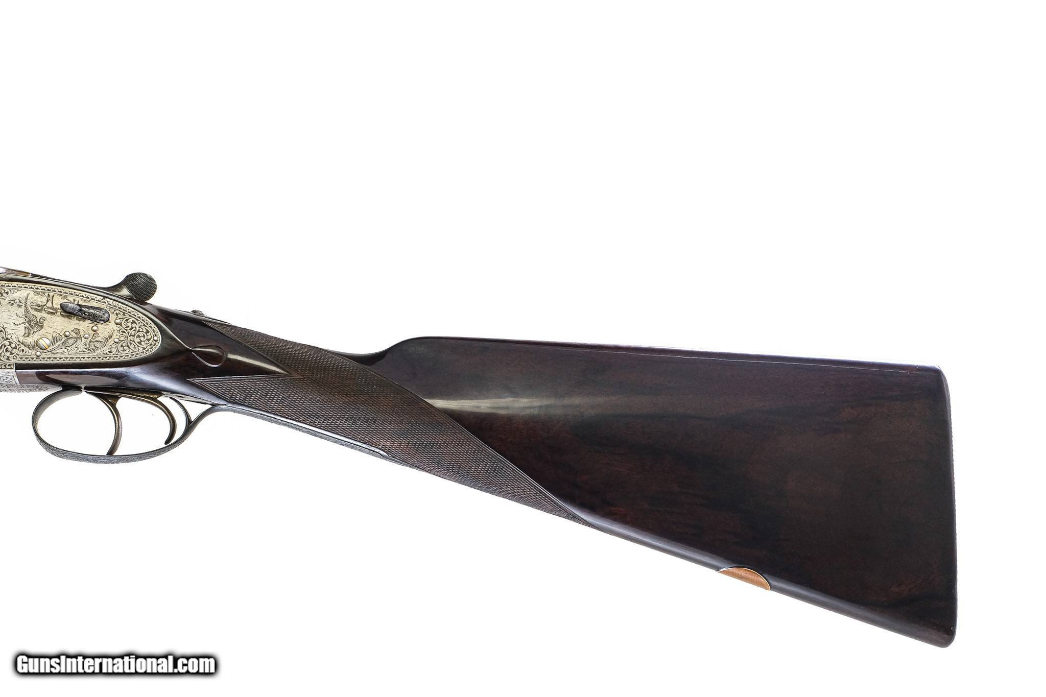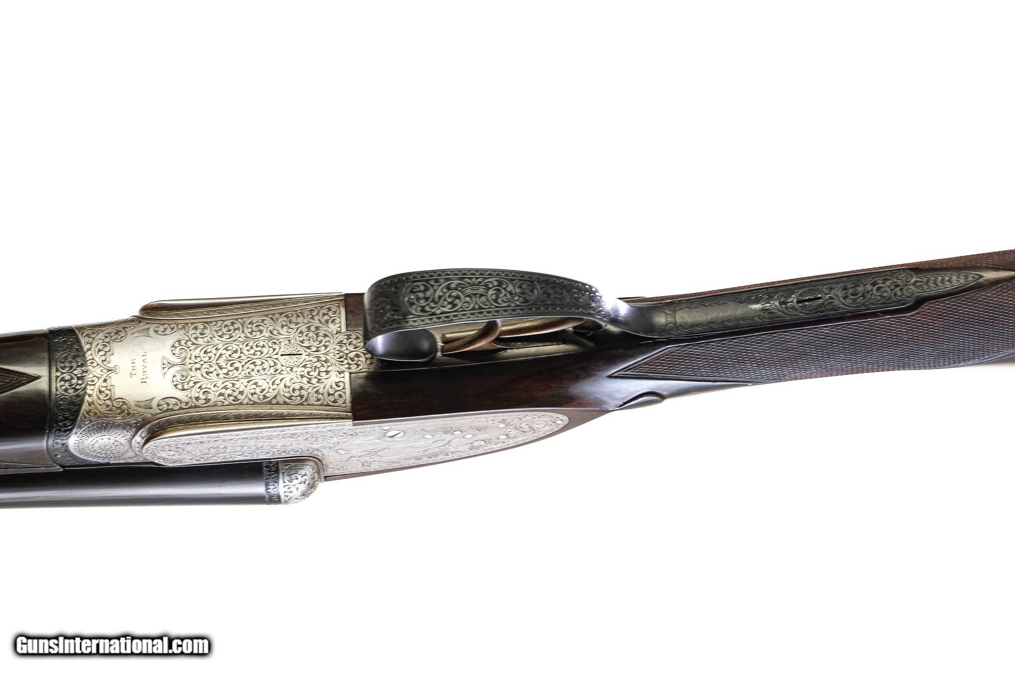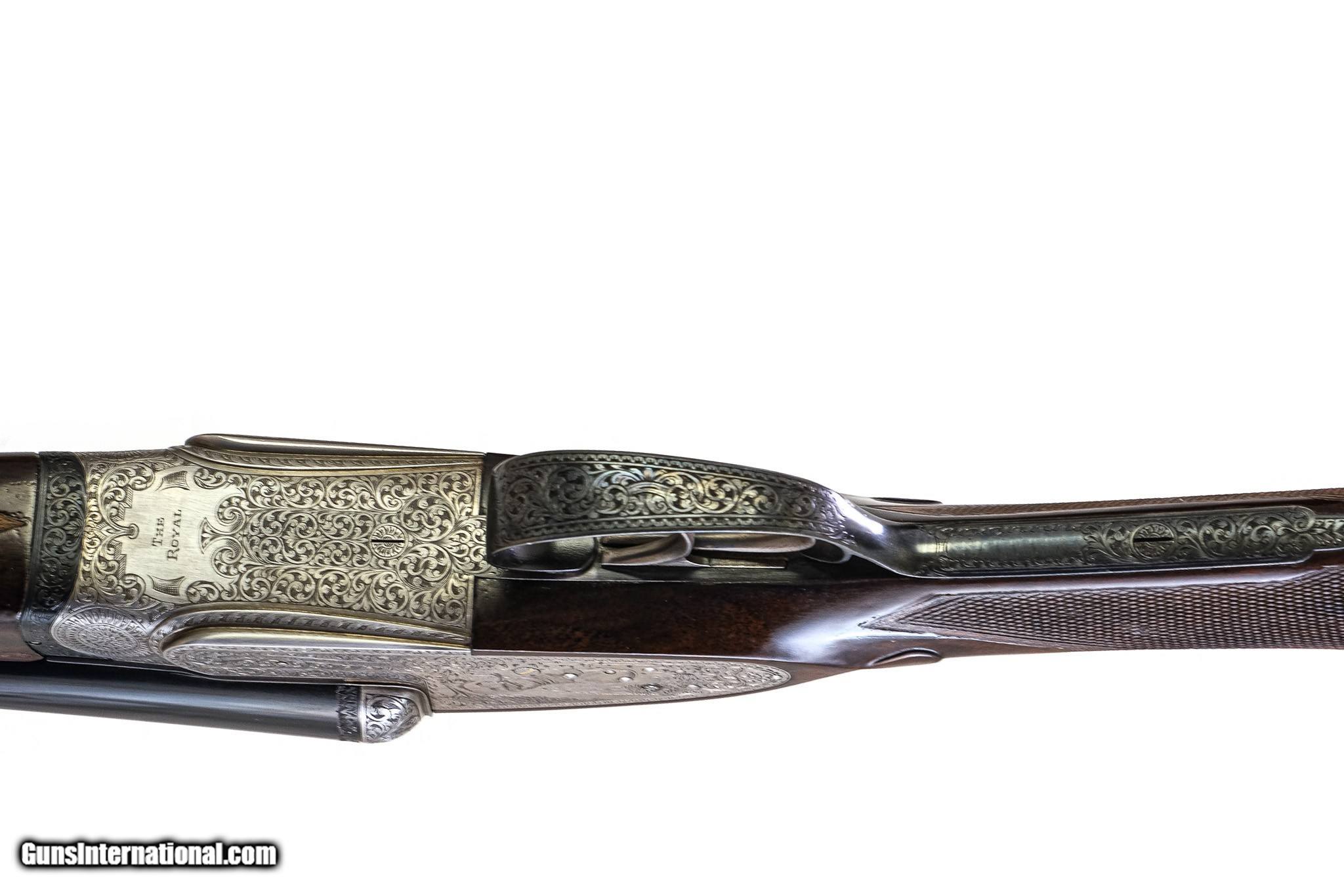 Description: Holland & Holland - Special Order, Royal SxS, Matched Pair, 12ga. 28" Barrels. Made in 1970 Special Commission! Special Order! Lightweight! Both guns are special order! Gun #1 features bold English scroll with the left side of 3 Pheasants and game scene setting with holland an Holland banner, the right side has 3 pheasants in a field scene with H&H in banner, double trigger, automatic ejector., gold “1”; ¼ /x ¾ choked Gun #2 features a lab sitting in a hunting scene on both sides, all followed by English scroll, the royal written on the bottom of the frame, double trigger, automatic ejector, gold “2”; ½ x ¾ choked. 28 in barrels, 2 ¾ in chambers, hand detachable locks, Extra finish, right hand cast, Holland And Holland confirms this was a match pair 28in barrels with special engraving and special finishes, these were ultra expensive guns, these are modern virtually new guns, with the highest quality workmanship! The best quality Turkish Walnut! Everything about these guns are special. They are in their original motor case and are very seldom seen in this configuration and condition. You’re essentially buying 2 brand new guns that are special orders and very expensive. Inv: 76234 - 76235 6 lbs. 7 oz. 14 ¾" x 1 5/8" x 2 3/8" $52,500.00 SOLD |