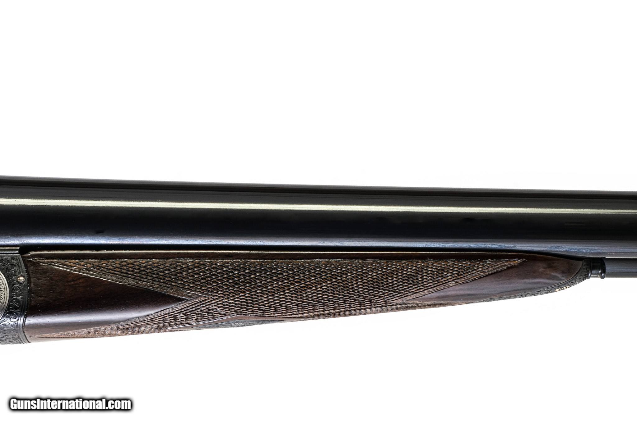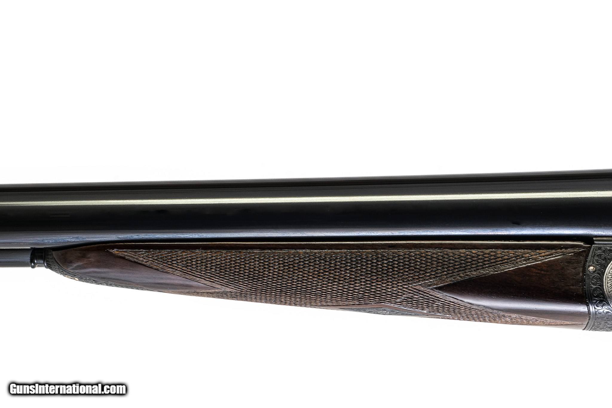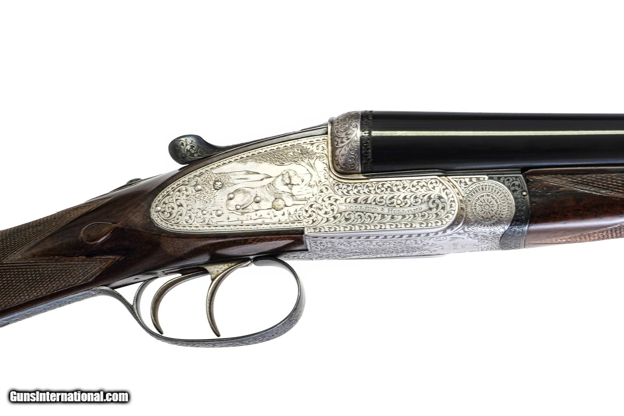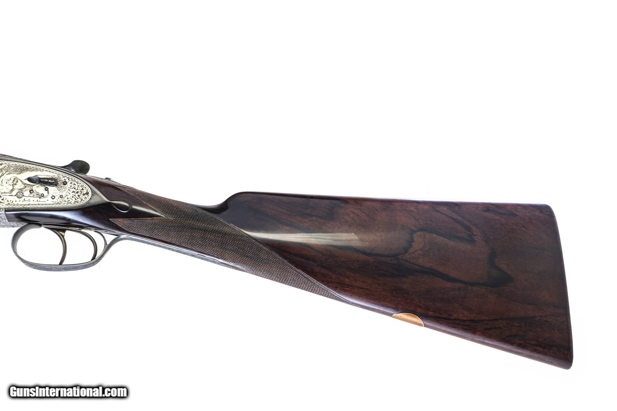 Description: Holland & Holland - Special Order, Royal SxS, Matched Pair, 12ga. 28" Barrels. Made in 1970 Special Commission! Special Order! Lightweight! Both guns are special order! Gun #1 features bold English scroll with the left side of 3 Pheasants and game scene setting with holland an Holland banner, the right side has 3 pheasants in a field scene with H&H in banner, double trigger, automatic ejector., gold “1”; ¼ /x ¾ choked Gun #2 features a lab sitting in a hunting scene on both sides, all followed by English scroll, the royal written on the bottom of the frame, double trigger, automatic ejector, gold “2”; ½ x ¾ choked. 28 in barrels, 2 ¾ in chambers, hand detachable locks, Extra finish, right hand cast, Holland And Holland confirms this was a match pair 28in barrels with special engraving and special finishes, these were ultra expensive guns, these are modern virtually new guns, with the highest quality workmanship! The best quality Turkish Walnut! Everything about these guns are special. They are in their original motor case and are very seldom seen in this configuration and condition. You’re essentially buying 2 brand new guns that are special orders and very expensive. Inv: 76234 - 76235 6 lbs. 7 oz. 14 ¾" x 1 5/8" x 2 3/8" $52,500.00 SOLD |