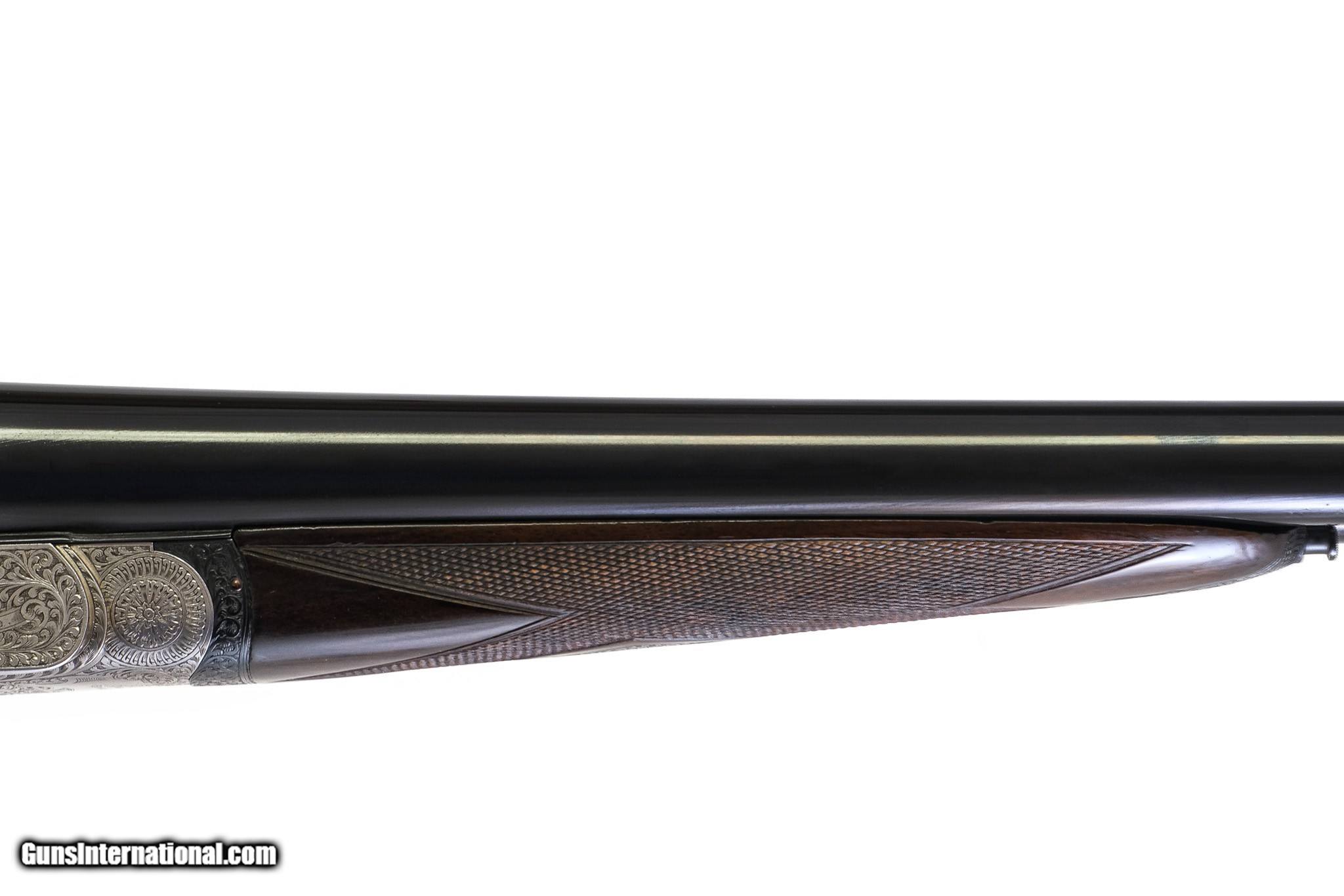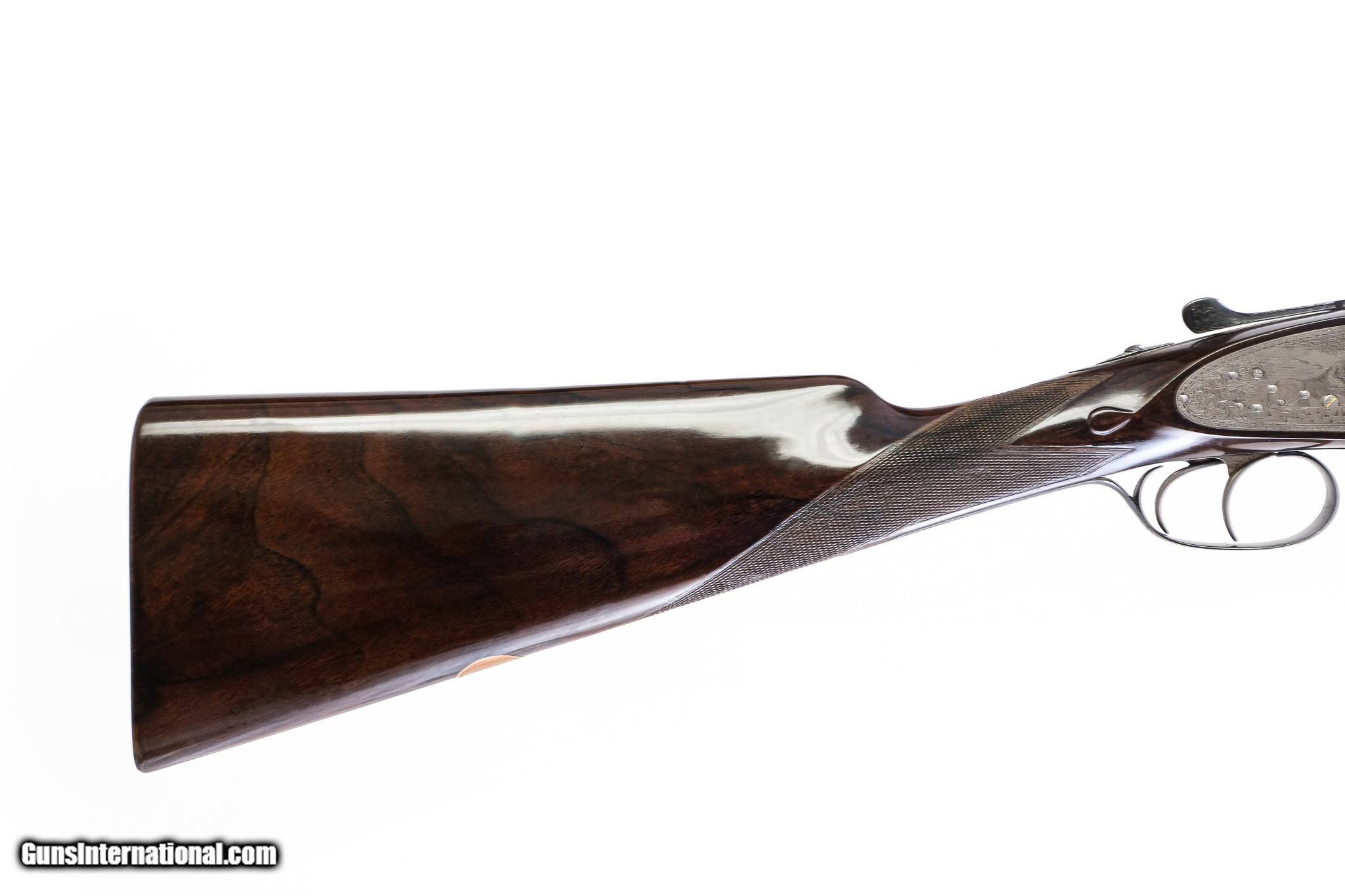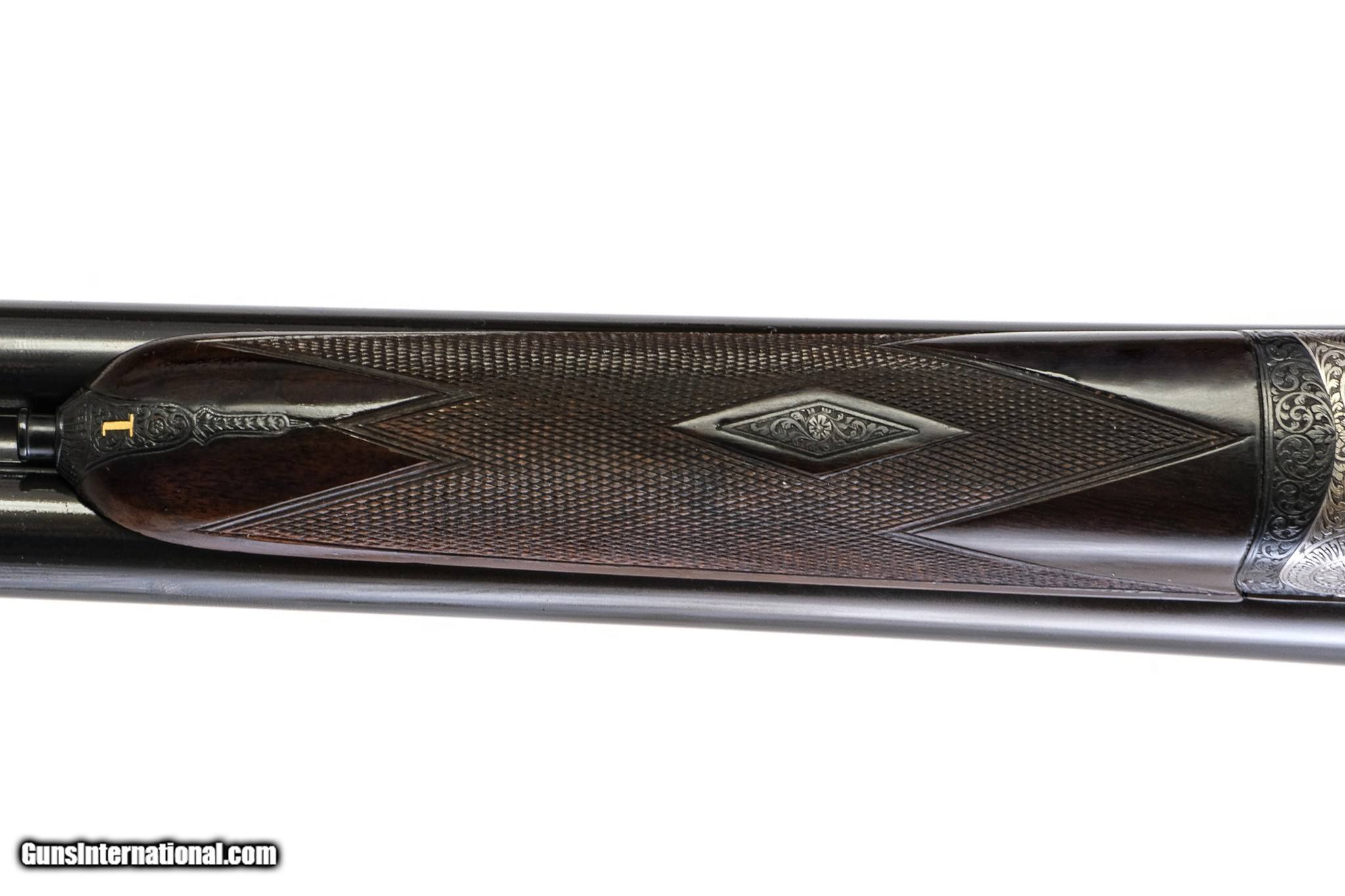Description: Holland & Holland - Special Order, Royal SxS, Matched Pair, 12ga. 28" Barrels. Made in 1970 Special Commission! Special Order! Lightweight! Both guns are special order! Gun #1 features bold English scroll with the left side of 3 Pheasants and game scene setting with holland an Holland banner, the right side has 3 pheasants in a field scene with H&H in banner, double trigger, automatic ejector., gold “1”; ¼ /x ¾ choked Gun #2 features a lab sitting in a hunting scene on both sides, all followed by English scroll, the royal written on the bottom of the frame, double trigger, automatic ejector, gold “2”; ½ x ¾ choked. 28 in barrels, 2 ¾ in chambers, hand detachable locks, Extra finish, right hand cast, Holland And Holland confirms this was a match pair 28in barrels with special engraving and special finishes, these were ultra expensive guns, these are modern virtually new guns, with the highest quality workmanship! The best quality Turkish Walnut! Everything about these guns are special. They are in their original motor case and are very seldom seen in this configuration and condition. You’re essentially buying 2 brand new guns that are special orders and very expensive. Inv: 76234 - 76235 6 lbs. 7 oz. 14 ¾" x 1 5/8" x 2 3/8" $52,500.00 SOLD |