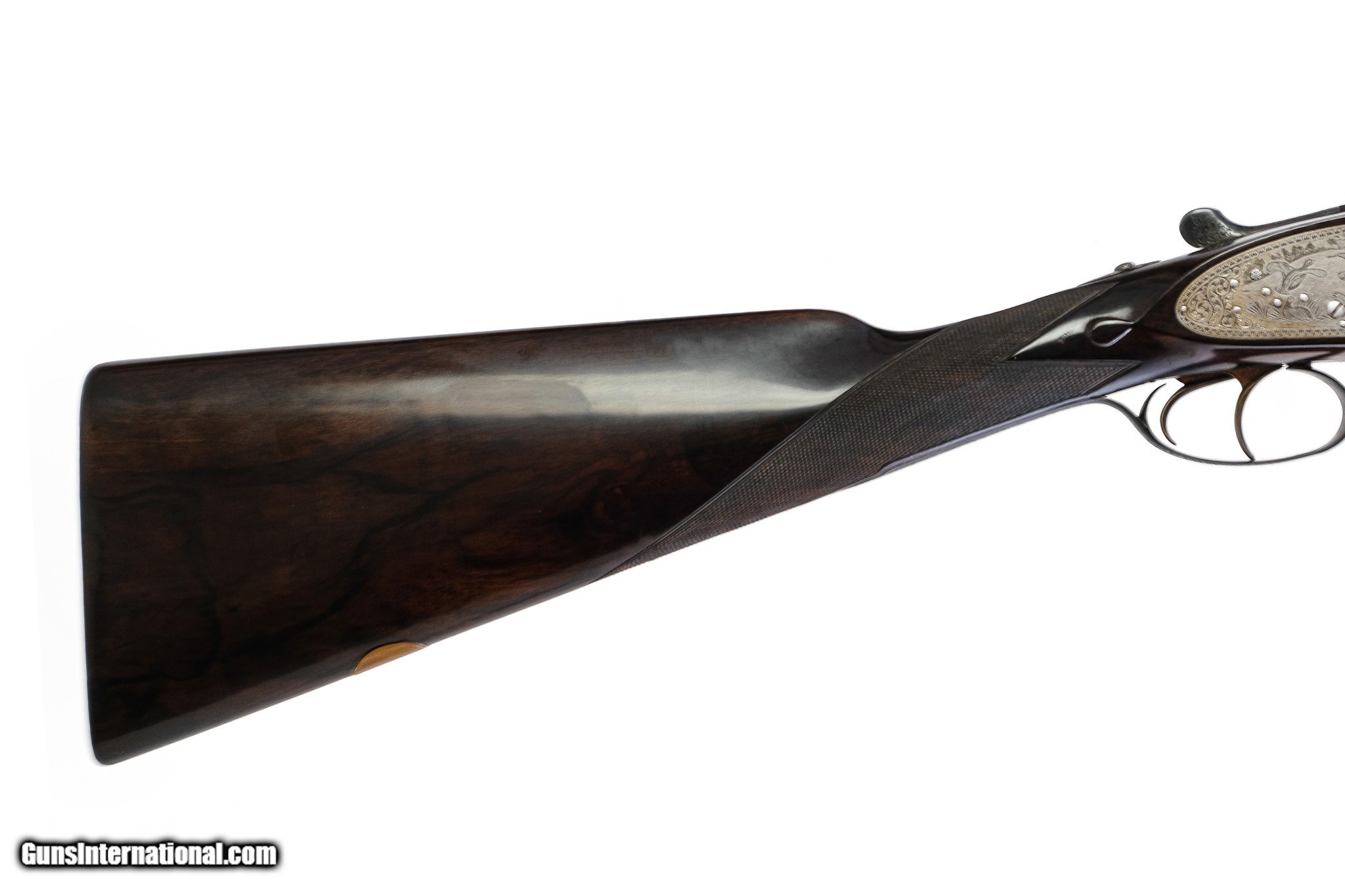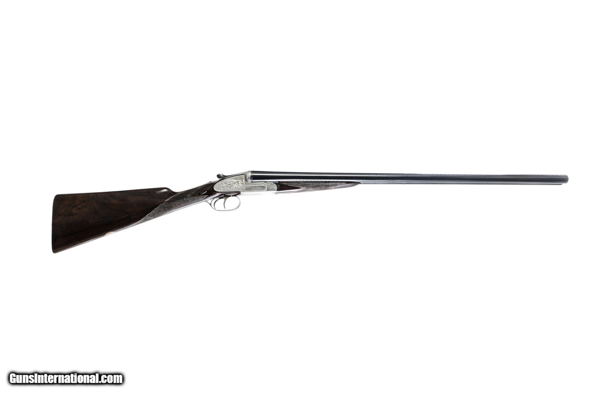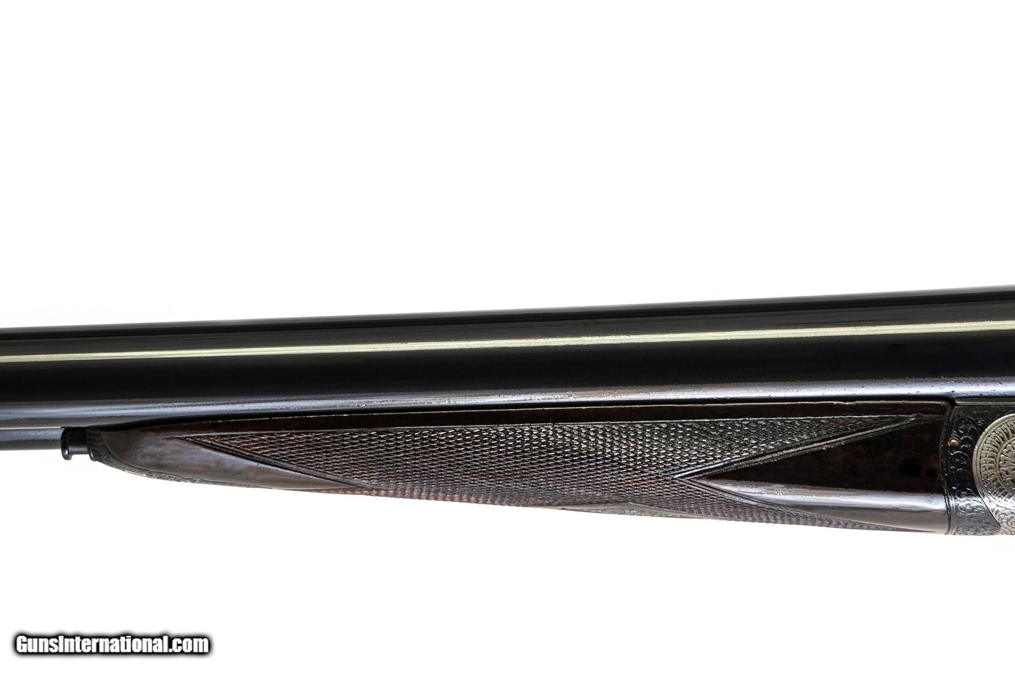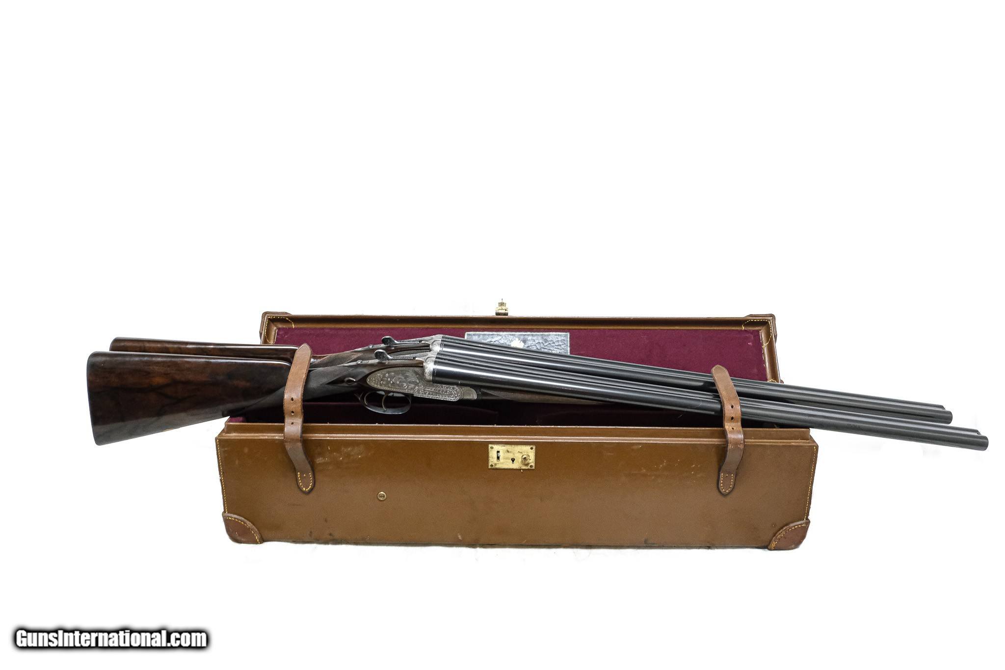 Description: Holland & Holland - Special Order, Royal SxS, Matched Pair, 12ga. 28" Barrels. Made in 1970 Special Commission! Special Order! Lightweight! Both guns are special order! Gun #1 features bold English scroll with the left side of 3 Pheasants and game scene setting with holland an Holland banner, the right side has 3 pheasants in a field scene with H&H in banner, double trigger, automatic ejector., gold “1”; ¼ /x ¾ choked Gun #2 features a lab sitting in a hunting scene on both sides, all followed by English scroll, the royal written on the bottom of the frame, double trigger, automatic ejector, gold “2”; ½ x ¾ choked. 28 in barrels, 2 ¾ in chambers, hand detachable locks, Extra finish, right hand cast, Holland And Holland confirms this was a match pair 28in barrels with special engraving and special finishes, these were ultra expensive guns, these are modern virtually new guns, with the highest quality workmanship! The best quality Turkish Walnut! Everything about these guns are special. They are in their original motor case and are very seldom seen in this configuration and condition. You’re essentially buying 2 brand new guns that are special orders and very expensive. Inv: 76234 - 76235 6 lbs. 7 oz. 14 ¾" x 1 5/8" x 2 3/8" $52,500.00 SOLD |