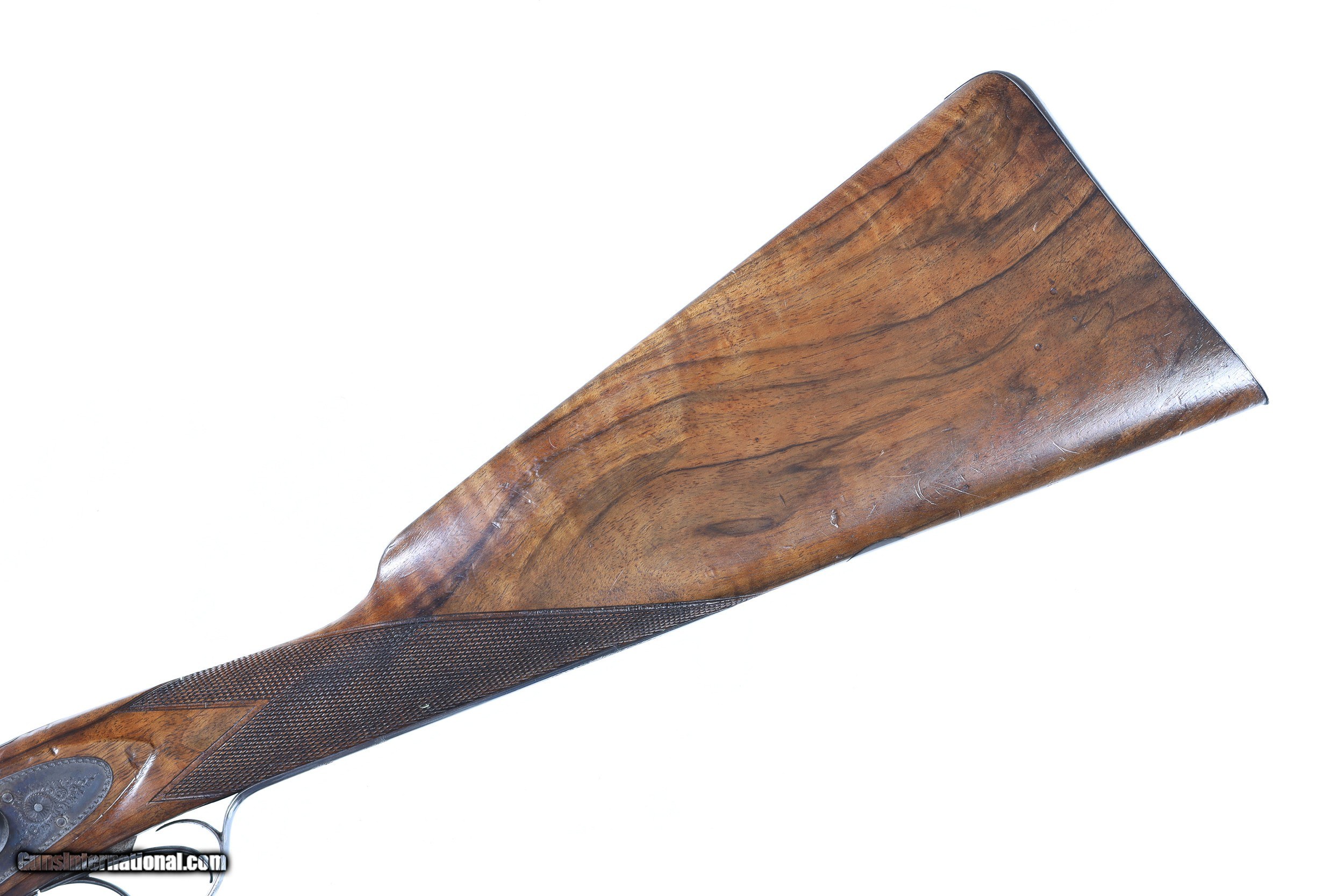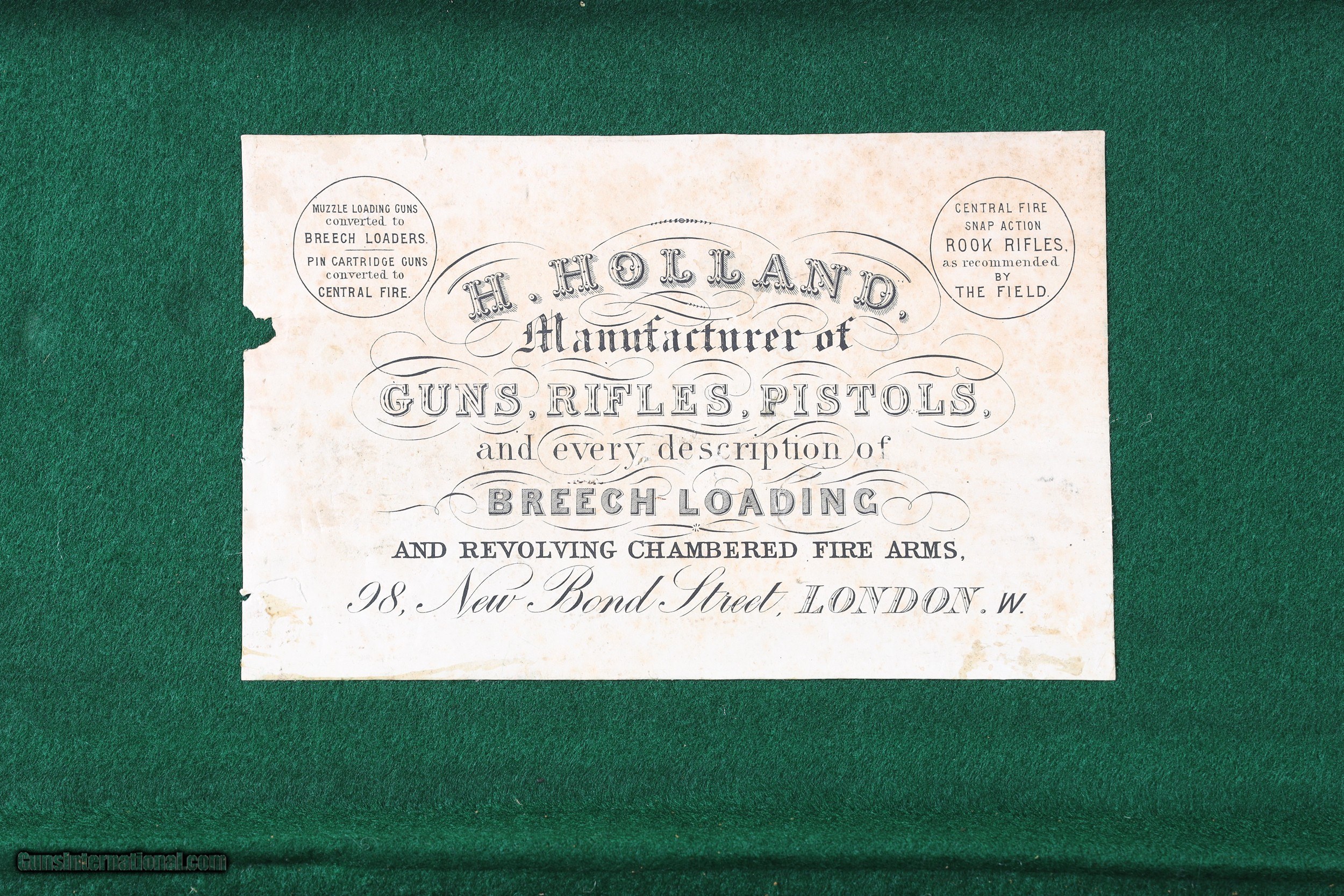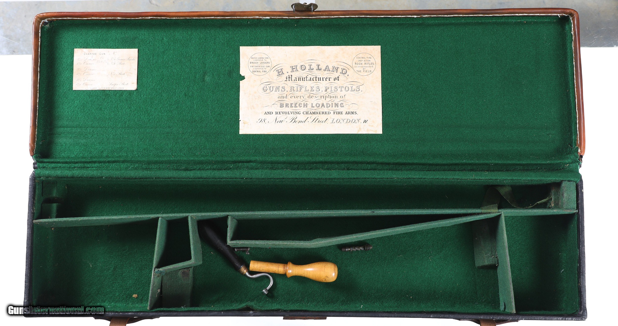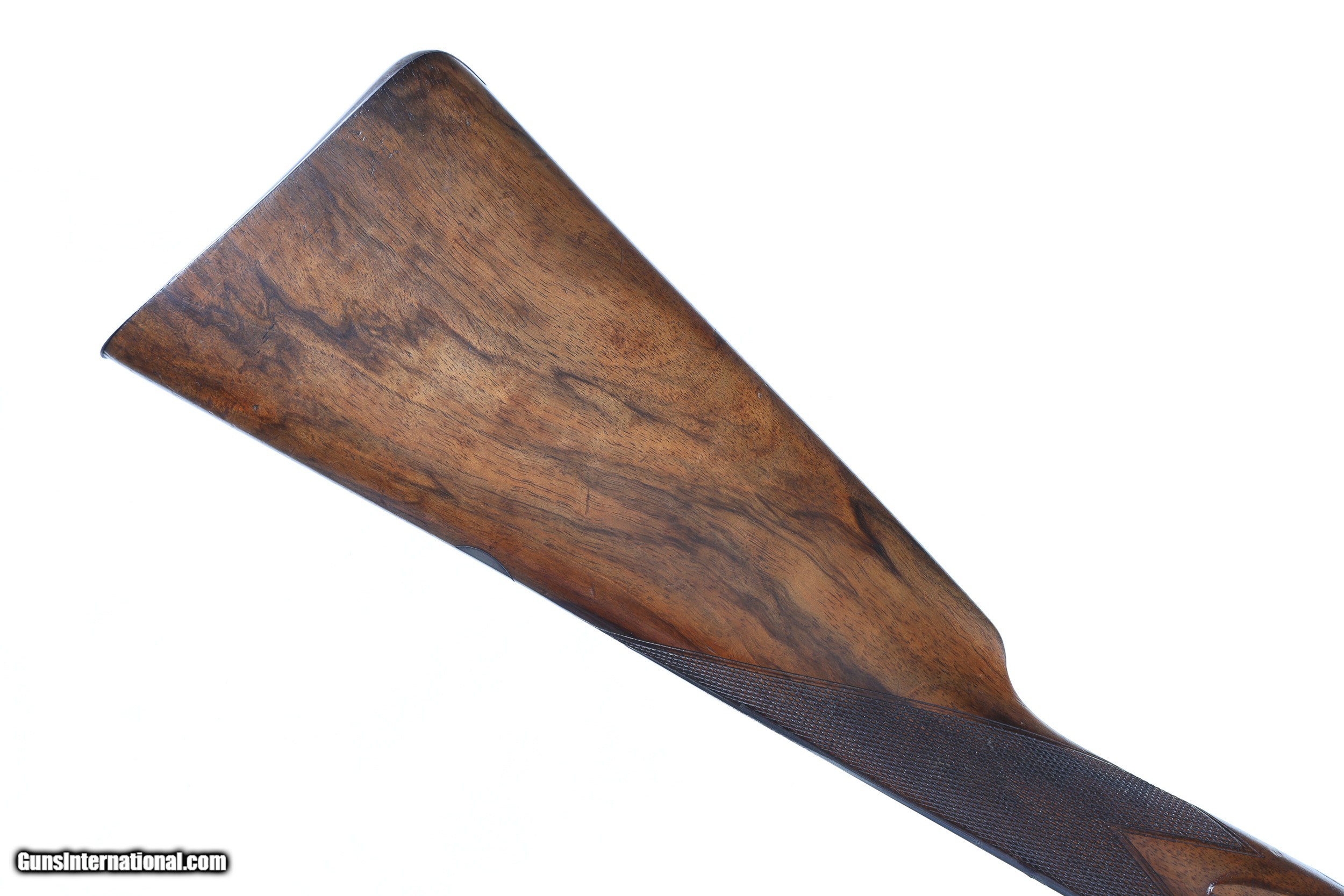 Description: Metal surfaces rate very good plus sporting original finish. Wood displays marring from field use. Single bead sight on the smooth concave rib marked "H. HOLLAND 98. NEW BOND St. LONDON" with 2 3/4 inch chambers, single extractor, and cylinder/cylinder chokes. The receiver, lock plates, and hammers feature fine splashes of English scroll engraving with sculpted fences, "H. HOLLAND" marked on each lock plate, sculpted hammers, checkered under lever, and dual triggers. Checkered wedge fastened splinter forearm and straight grip buttstock with a blank silver initial oval and smooth steel buttplate. With a custom leather takedown case with green felt interior, "H. HOLLAND" retail label on the inside of the lid, The barrel and stock measurements are: drop at comb 2 inches; drop at heel 2 1/2 inches; length of pull 14 inches. • Free Shipping, No Credit Card Fees. • Lay-a-way available for this firearm. • 1/3 Down, a 1/3 in 30 Days 1/3 in 60 Days. SOLD Curio/Relic: Yes Antique: Yes Manufacturer: Holland & Holland Model: Under Lever Serial Number: 2645 Barrel Length: 29-5/8 |