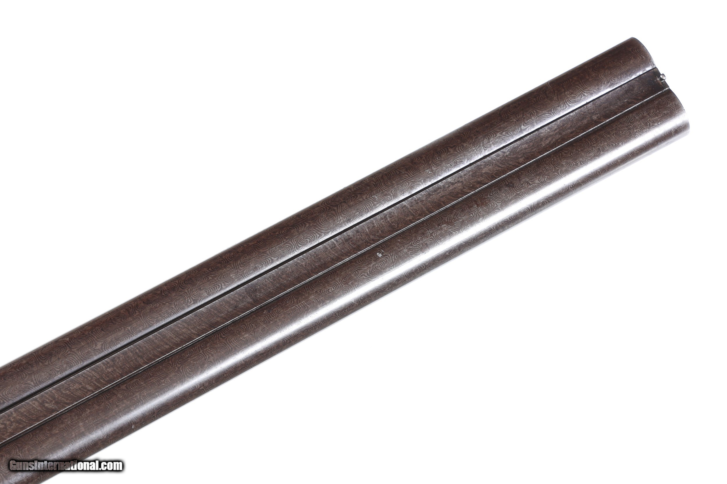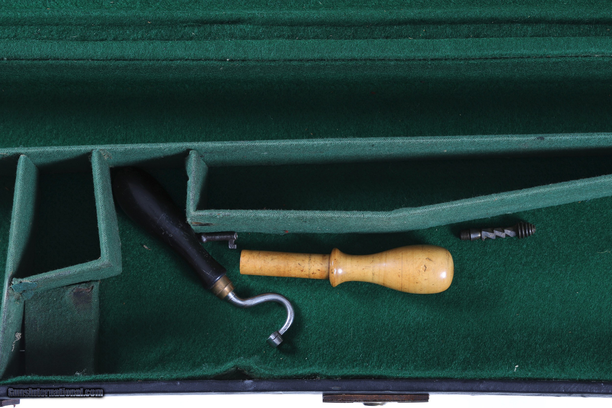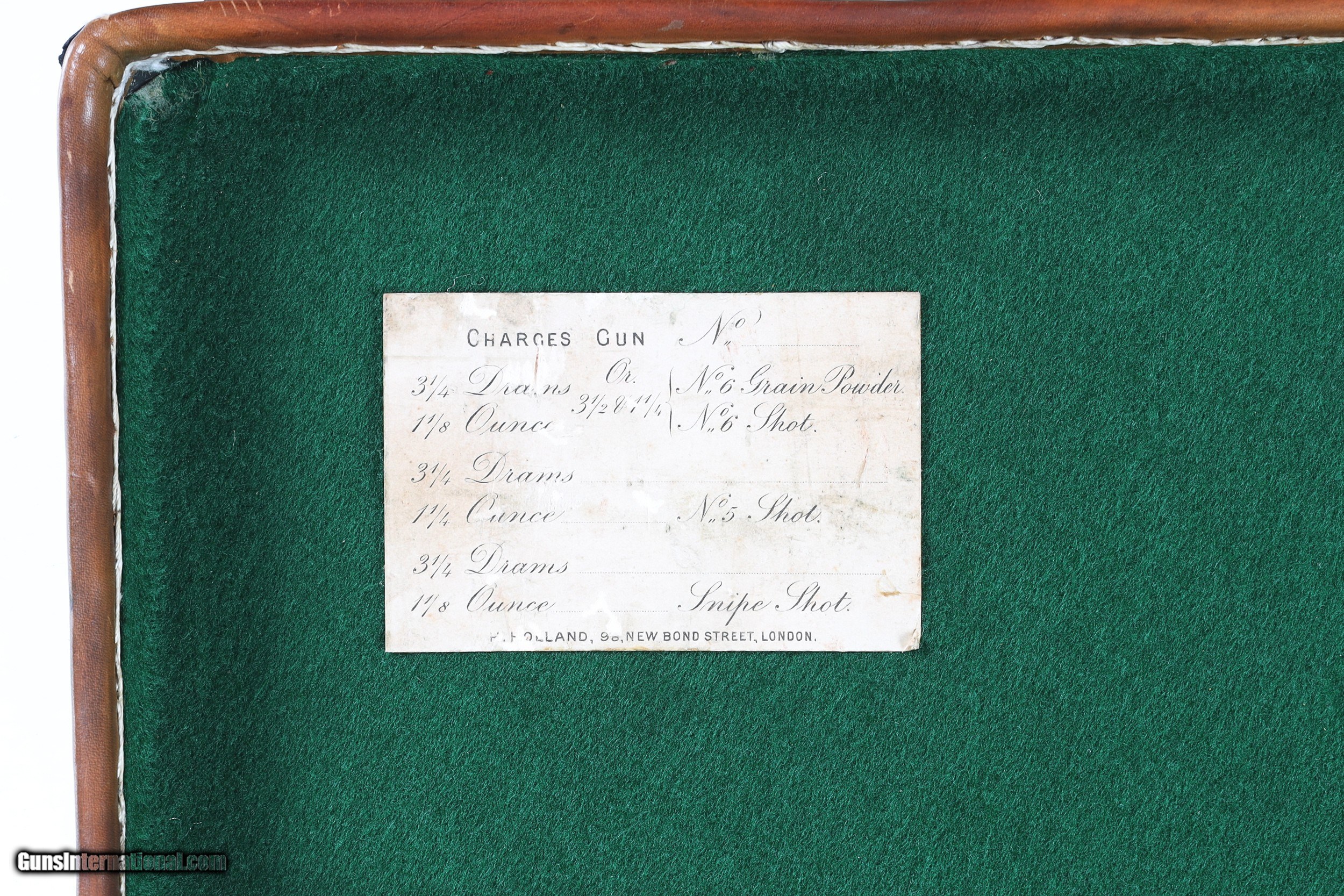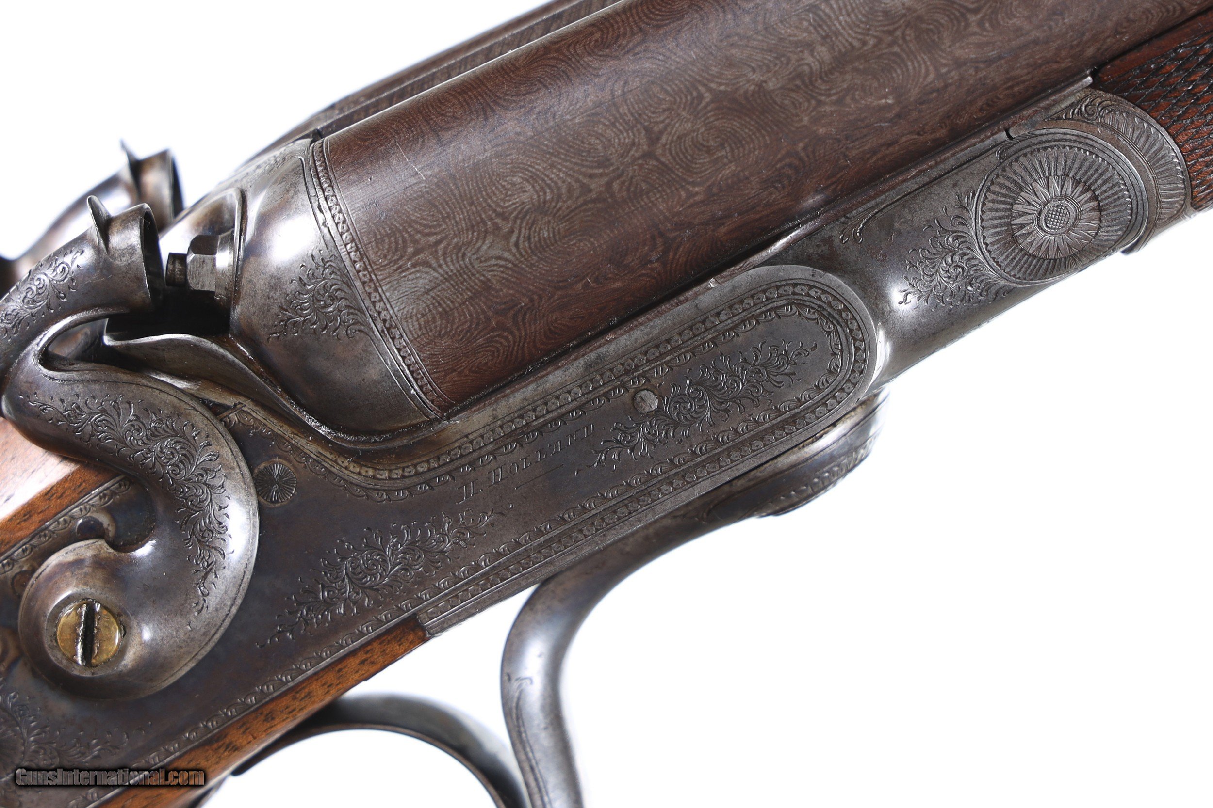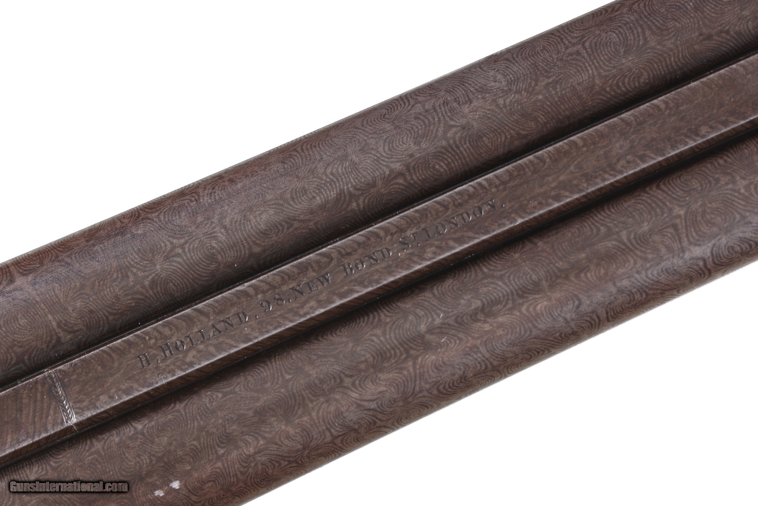 Description: Metal surfaces rate very good plus sporting original finish. Wood displays marring from field use. Single bead sight on the smooth concave rib marked "H. HOLLAND 98. NEW BOND St. LONDON" with 2 3/4 inch chambers, single extractor, and cylinder/cylinder chokes. The receiver, lock plates, and hammers feature fine splashes of English scroll engraving with sculpted fences, "H. HOLLAND" marked on each lock plate, sculpted hammers, checkered under lever, and dual triggers. Checkered wedge fastened splinter forearm and straight grip buttstock with a blank silver initial oval and smooth steel buttplate. With a custom leather takedown case with green felt interior, "H. HOLLAND" retail label on the inside of the lid, The barrel and stock measurements are: drop at comb 2 inches; drop at heel 2 1/2 inches; length of pull 14 inches. • Free Shipping, No Credit Card Fees. • Lay-a-way available for this firearm. • 1/3 Down, a 1/3 in 30 Days 1/3 in 60 Days. SOLD Curio/Relic: Yes Antique: Yes Manufacturer: Holland & Holland Model: Under Lever Serial Number: 2645 Barrel Length: 29-5/8 |