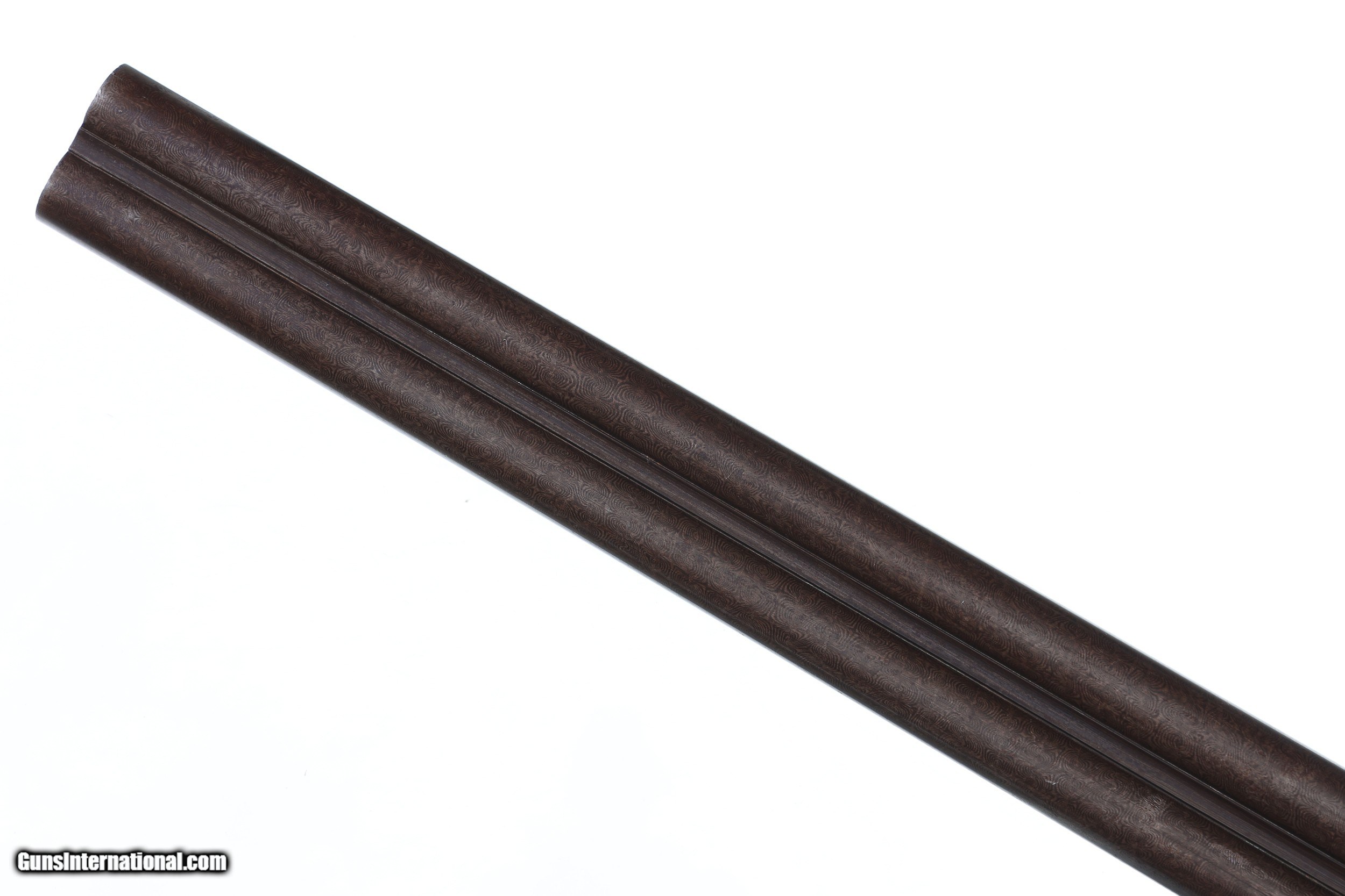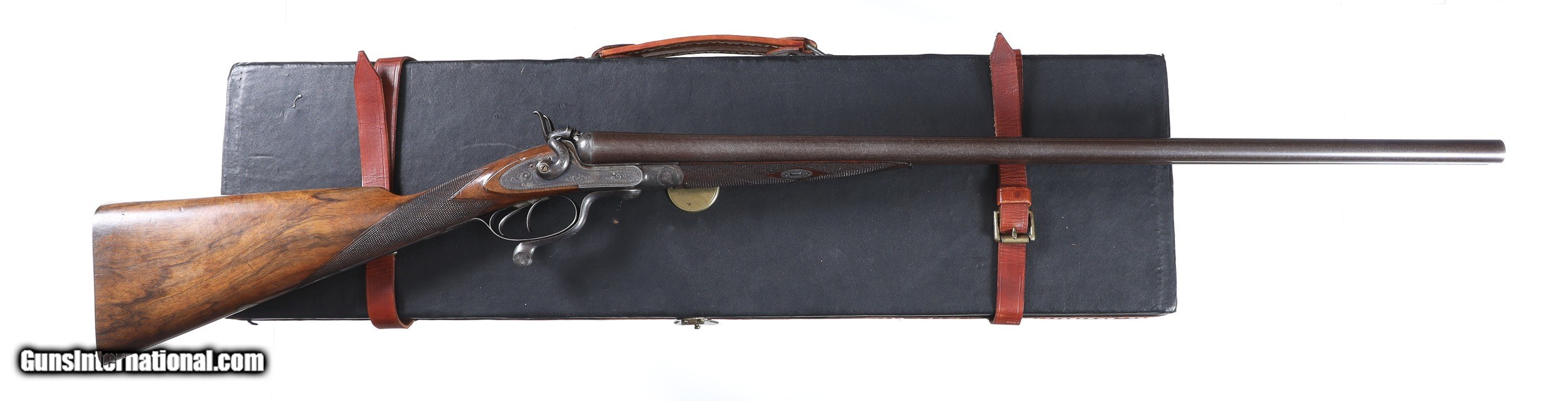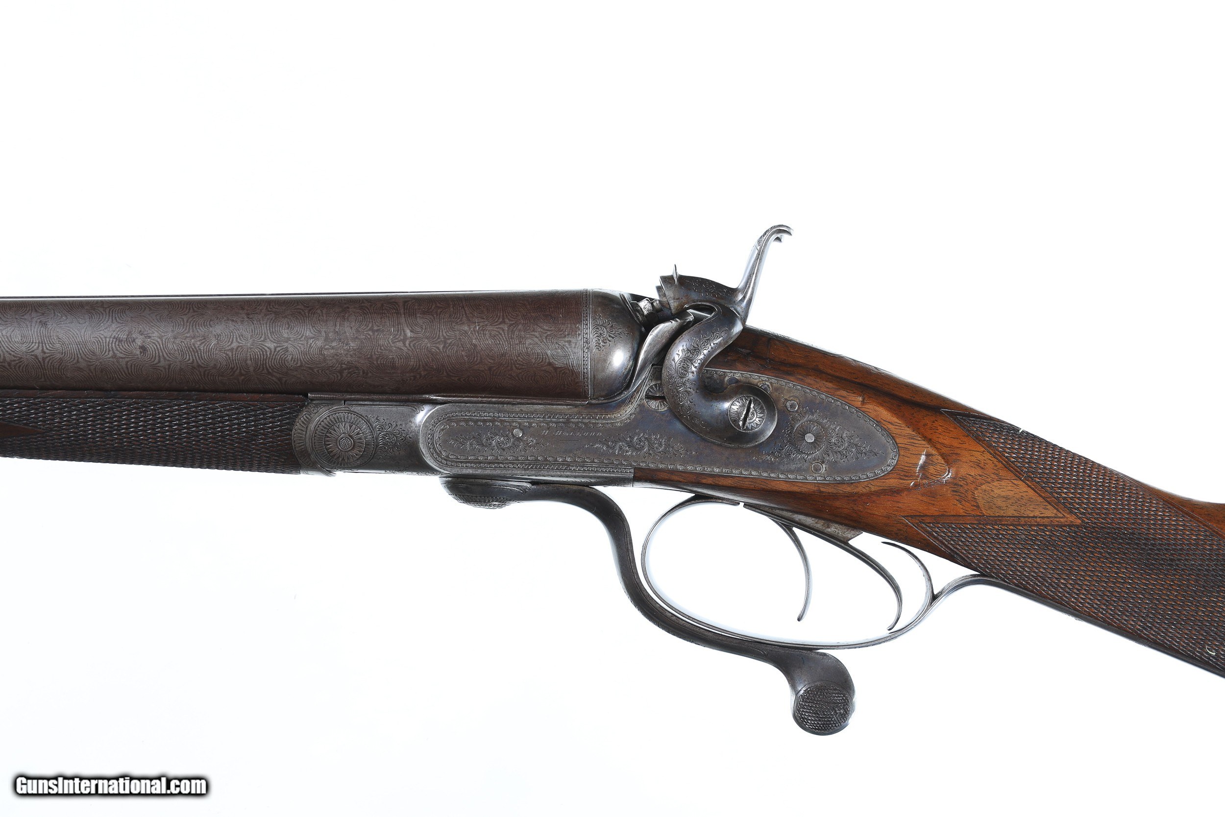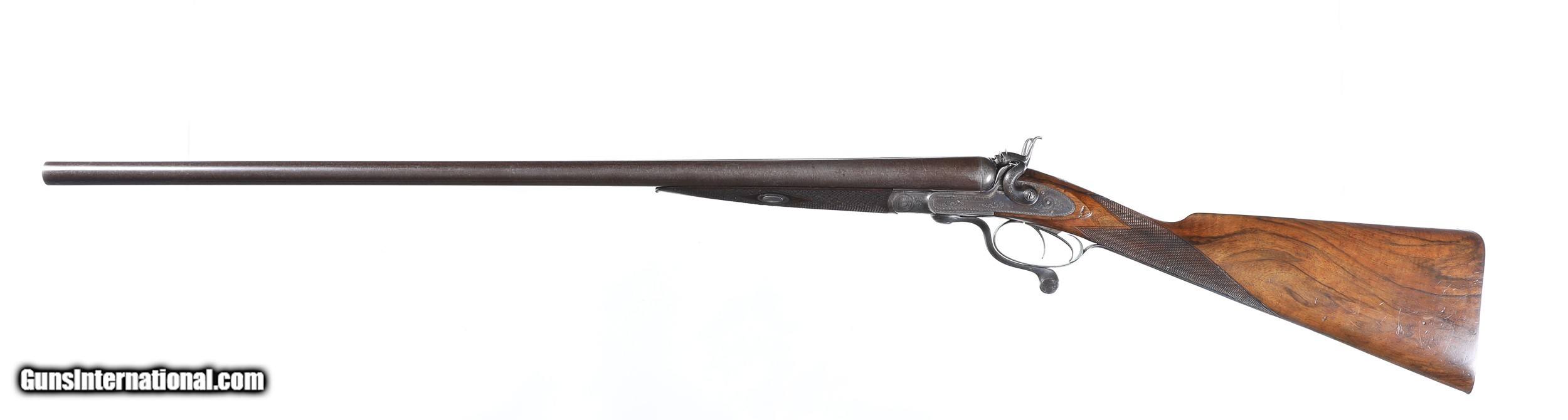 Description: Metal surfaces rate very good plus sporting original finish. Wood displays marring from field use. Single bead sight on the smooth concave rib marked "H. HOLLAND 98. NEW BOND St. LONDON" with 2 3/4 inch chambers, single extractor, and cylinder/cylinder chokes. The receiver, lock plates, and hammers feature fine splashes of English scroll engraving with sculpted fences, "H. HOLLAND" marked on each lock plate, sculpted hammers, checkered under lever, and dual triggers. Checkered wedge fastened splinter forearm and straight grip buttstock with a blank silver initial oval and smooth steel buttplate. With a custom leather takedown case with green felt interior, "H. HOLLAND" retail label on the inside of the lid, The barrel and stock measurements are: drop at comb 2 inches; drop at heel 2 1/2 inches; length of pull 14 inches. • Free Shipping, No Credit Card Fees. • Lay-a-way available for this firearm. • 1/3 Down, a 1/3 in 30 Days 1/3 in 60 Days. SOLD Curio/Relic: Yes Antique: Yes Manufacturer: Holland & Holland Model: Under Lever Serial Number: 2645 Barrel Length: 29-5/8 |