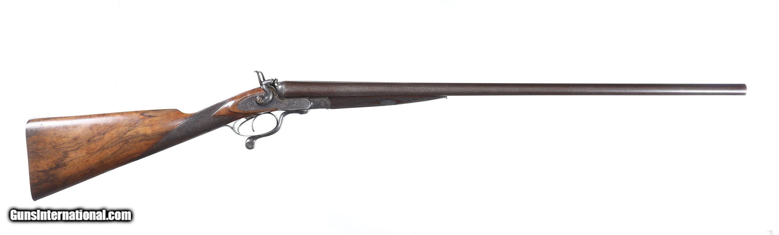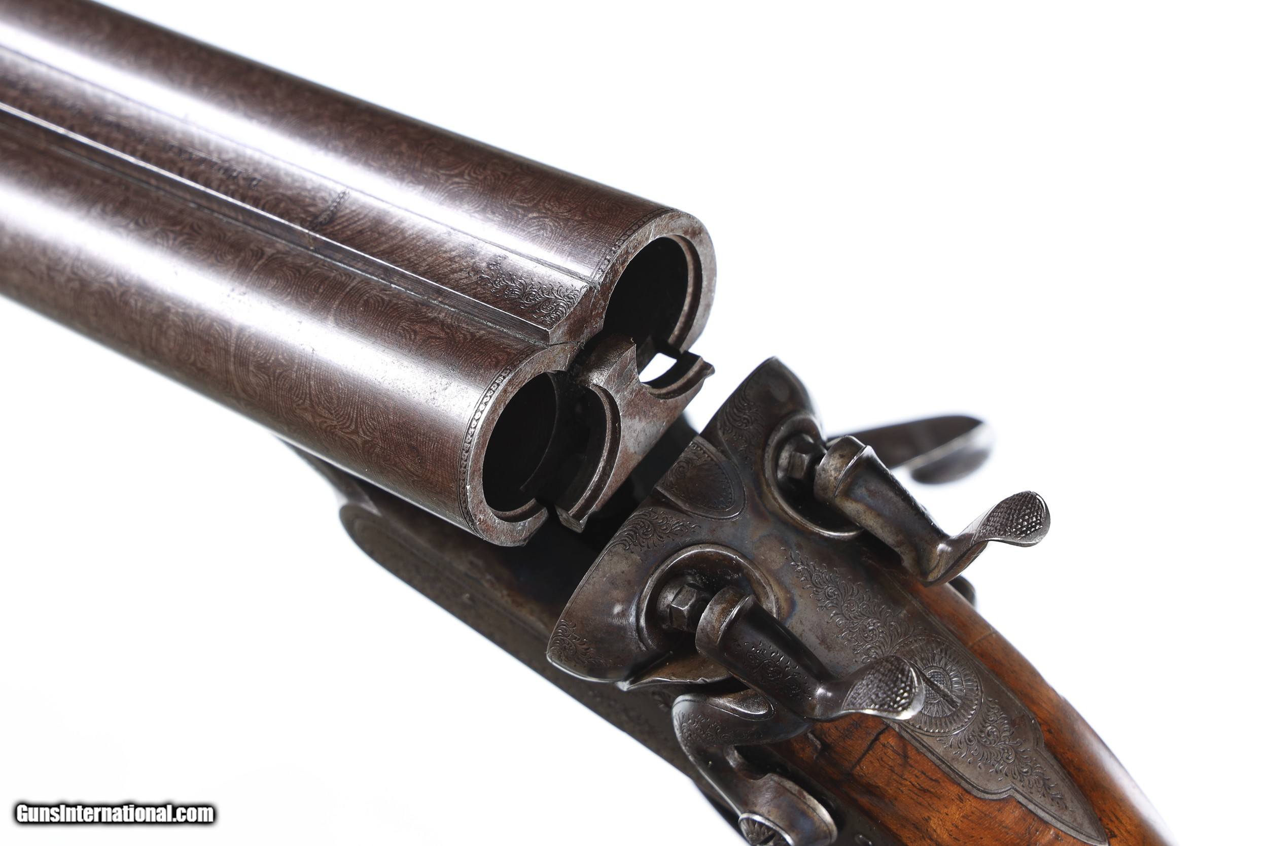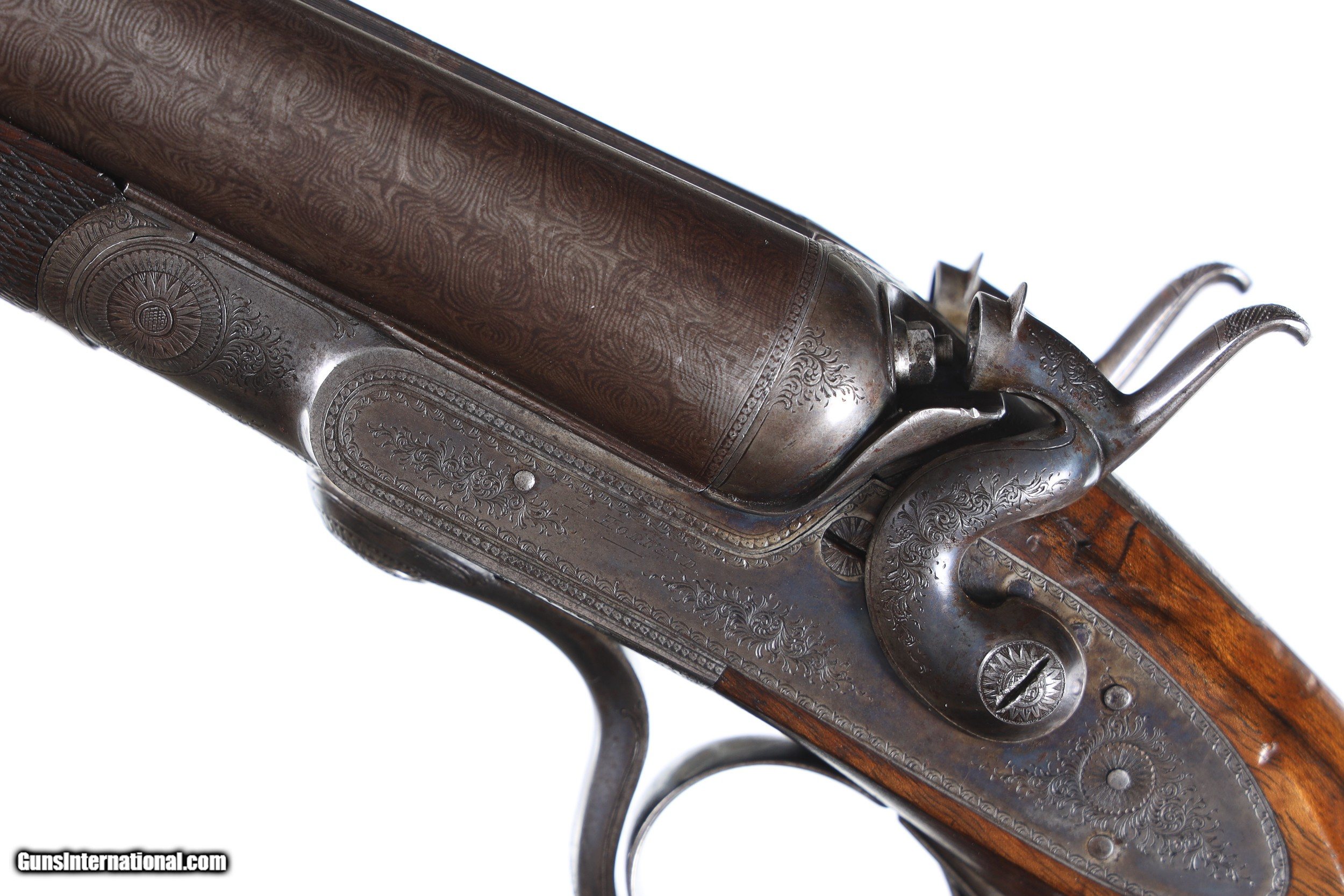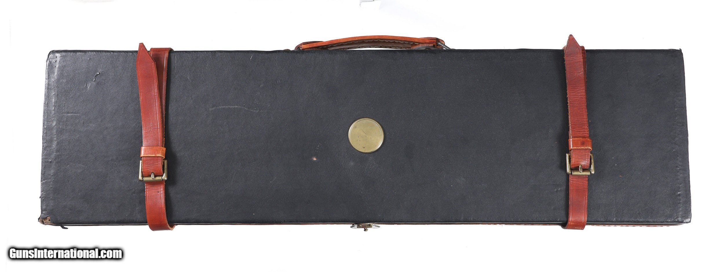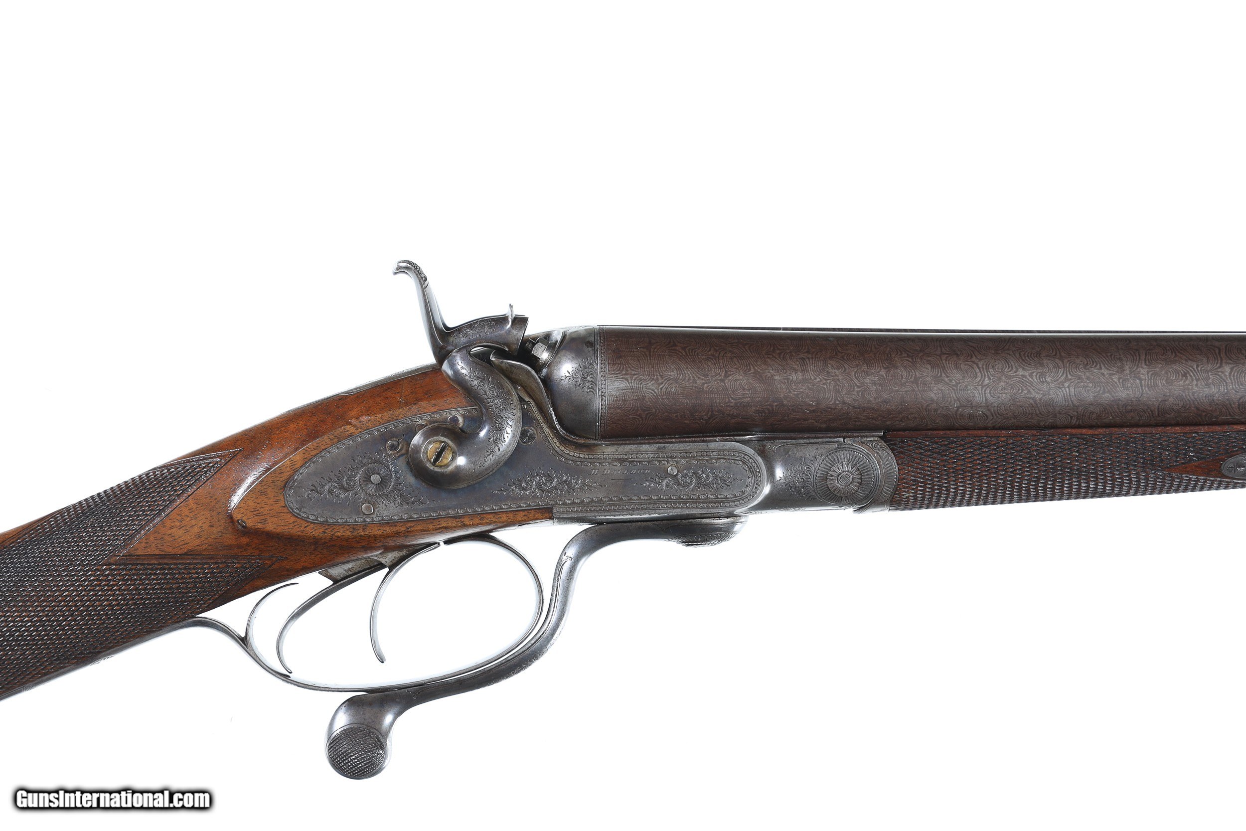 Description: Metal surfaces rate very good plus sporting original finish. Wood displays marring from field use. Single bead sight on the smooth concave rib marked "H. HOLLAND 98. NEW BOND St. LONDON" with 2 3/4 inch chambers, single extractor, and cylinder/cylinder chokes. The receiver, lock plates, and hammers feature fine splashes of English scroll engraving with sculpted fences, "H. HOLLAND" marked on each lock plate, sculpted hammers, checkered under lever, and dual triggers. Checkered wedge fastened splinter forearm and straight grip buttstock with a blank silver initial oval and smooth steel buttplate. With a custom leather takedown case with green felt interior, "H. HOLLAND" retail label on the inside of the lid, The barrel and stock measurements are: drop at comb 2 inches; drop at heel 2 1/2 inches; length of pull 14 inches. • Free Shipping, No Credit Card Fees. • Lay-a-way available for this firearm. • 1/3 Down, a 1/3 in 30 Days 1/3 in 60 Days. SOLD Curio/Relic: Yes Antique: Yes Manufacturer: Holland & Holland Model: Under Lever Serial Number: 2645 Barrel Length: 29-5/8 |