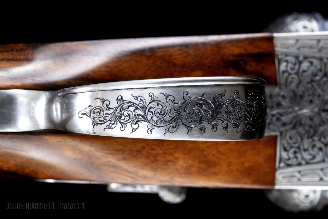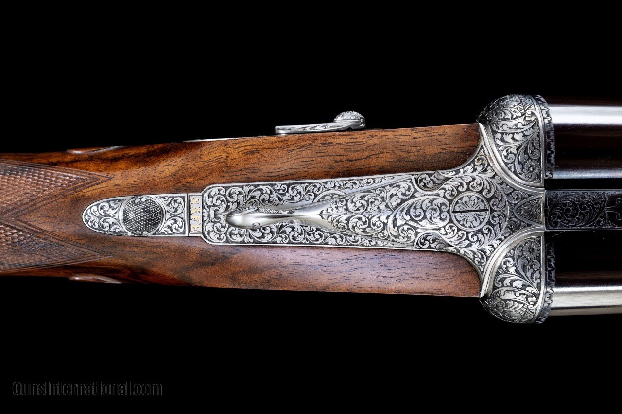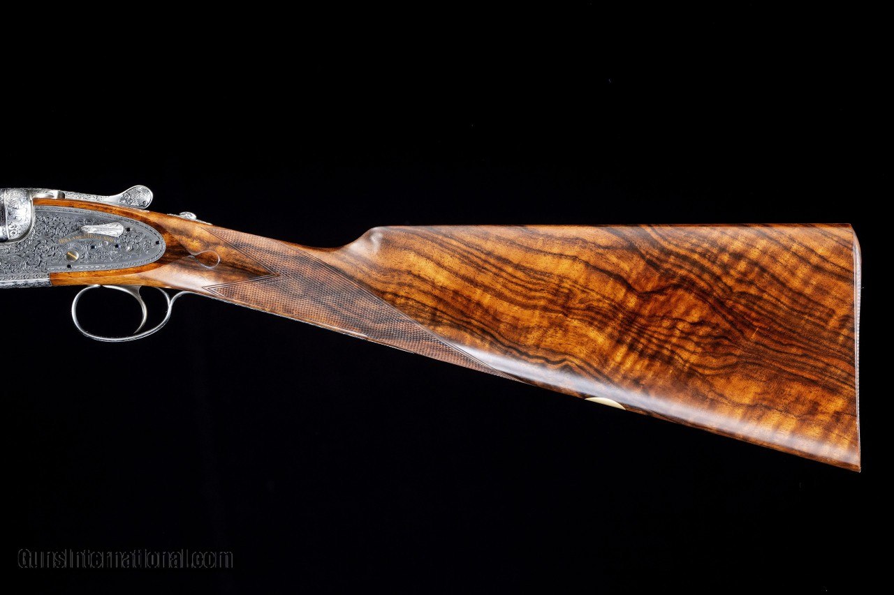 Description: A new Holland & Holland Royal side by side 12 bore assisted-opening ejector gun with 28” plain game rib barrels. The gun is choked improved cylinder and modified. 15 1/8” length of pull over a checkered butt. Straight English stock, single mechanical non-selective trigger on a square bar action, auto-safety, hand detachable locks, single front bead, drop points, rolled edge trigger guard, gold inlaid “SAFE” ahead of a small button style safety catch, gold inlaid serial number on the bottom strap, gold inlaid maker’s name on ribbons on both sides, gold-lined cocking indicators, vacant gold oval, and an Anson push button forend release. The gun was proofed in London in 2010 with 2 3/4" chambers. Engraved and signed by Dave Hudson with Holland’s Royal scroll. Silver finish action and furniture. Exhibition grade walnut stock. Top lever right of center, on face, and ejectors in time. Serial #41,562 Barrel length: 28” Weight: 7 lbs 3 oz LOP: 15 1/8” LOP Heel: 15 ¼” LOP Toe: 15 ½” DAC: 1 7/16” DAH: 2 1/8” Drop at Face: 1 ¾” Cast at Heel: 0” – neutral Cast at Toe: 0” – neutral Bore diameter, right/left: .727”, .727” Choke, right/left: .008”, .018” (IC, M) Minimum wall thickness, right/left: .035”, .035” Manufacturer: Holland & Holland Caliber Info: 12 Gauge Barrels: 28 Action: Side by Side Gauge: 12 Gauge Price: $129,000.00 Contact Seller |
