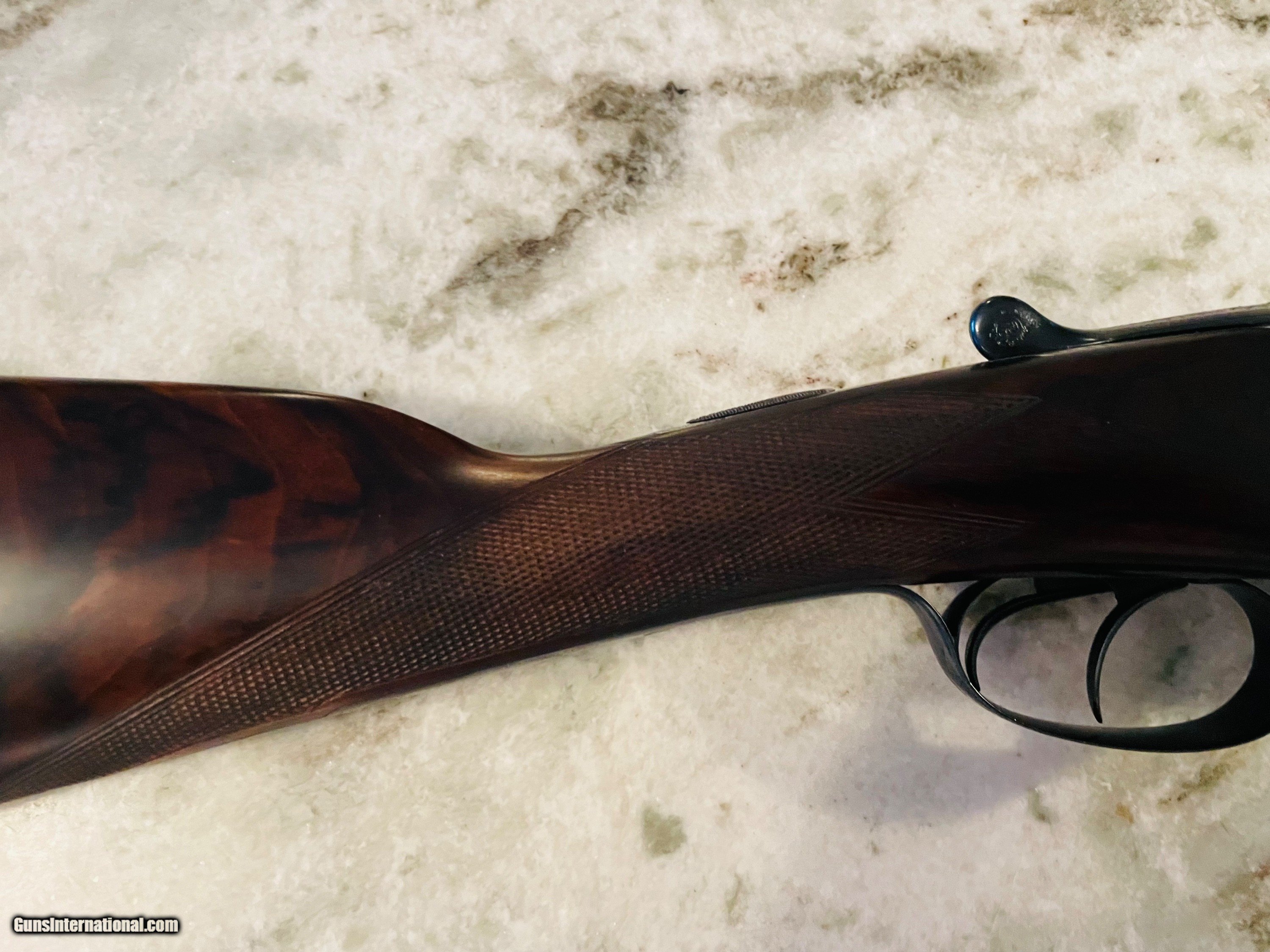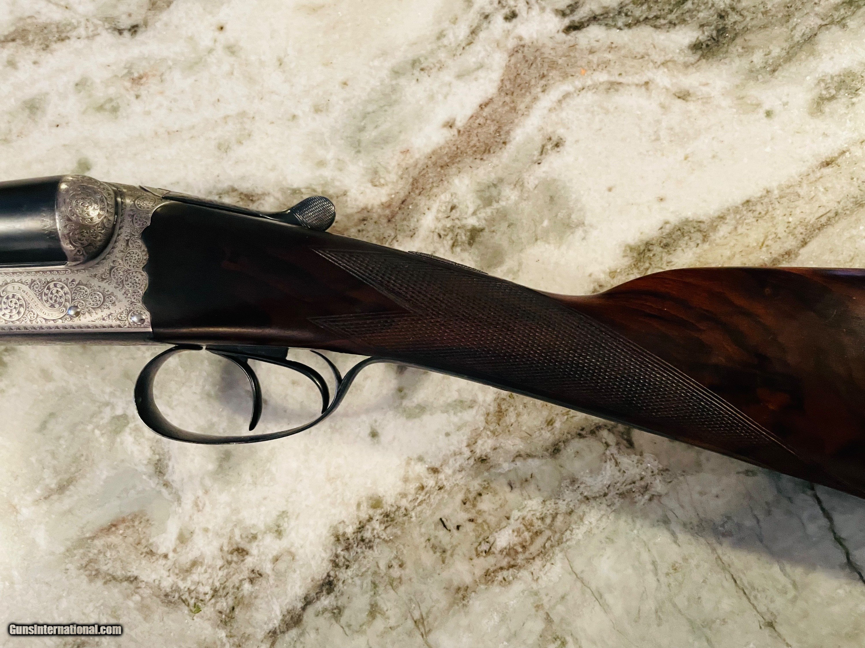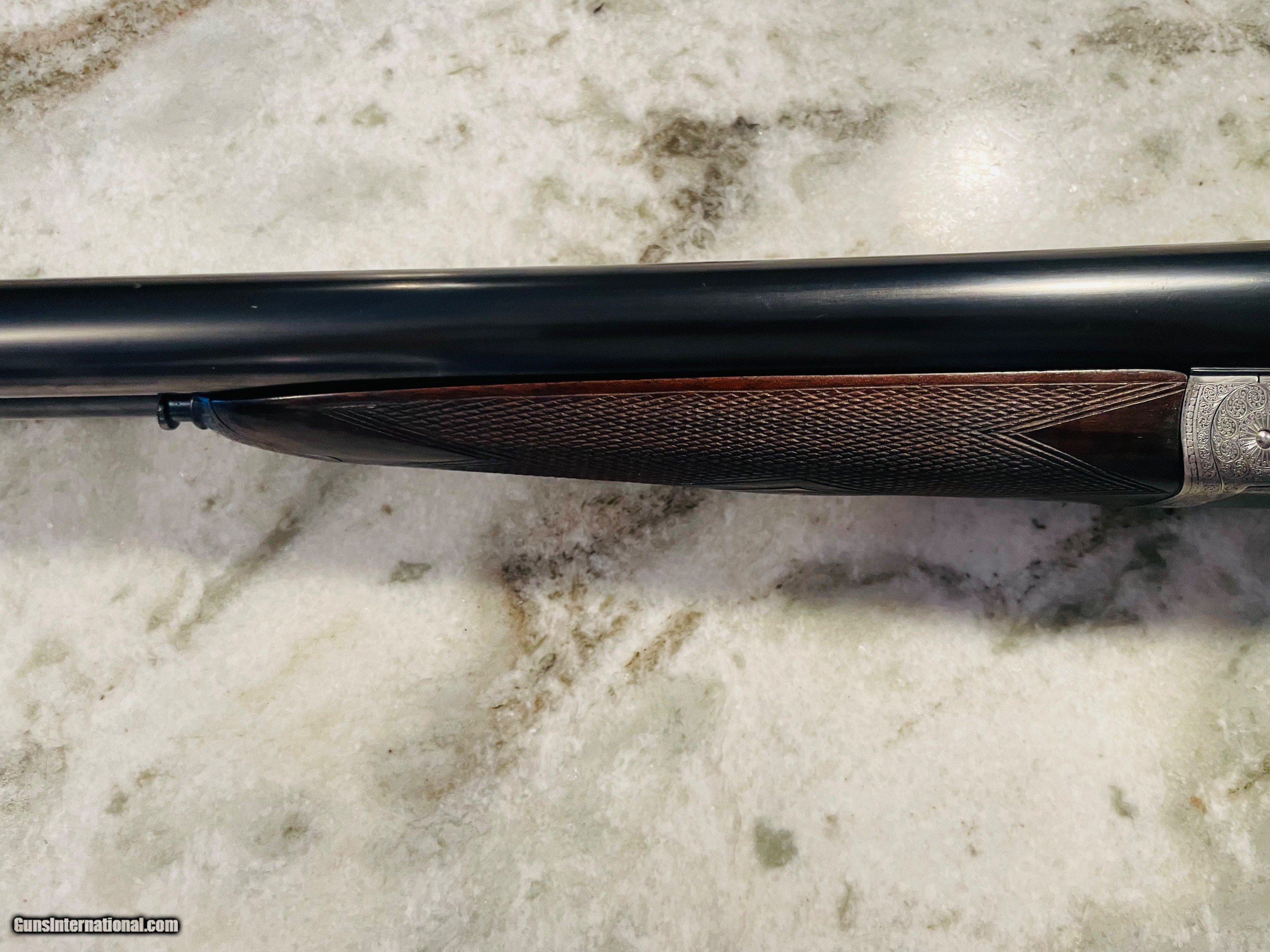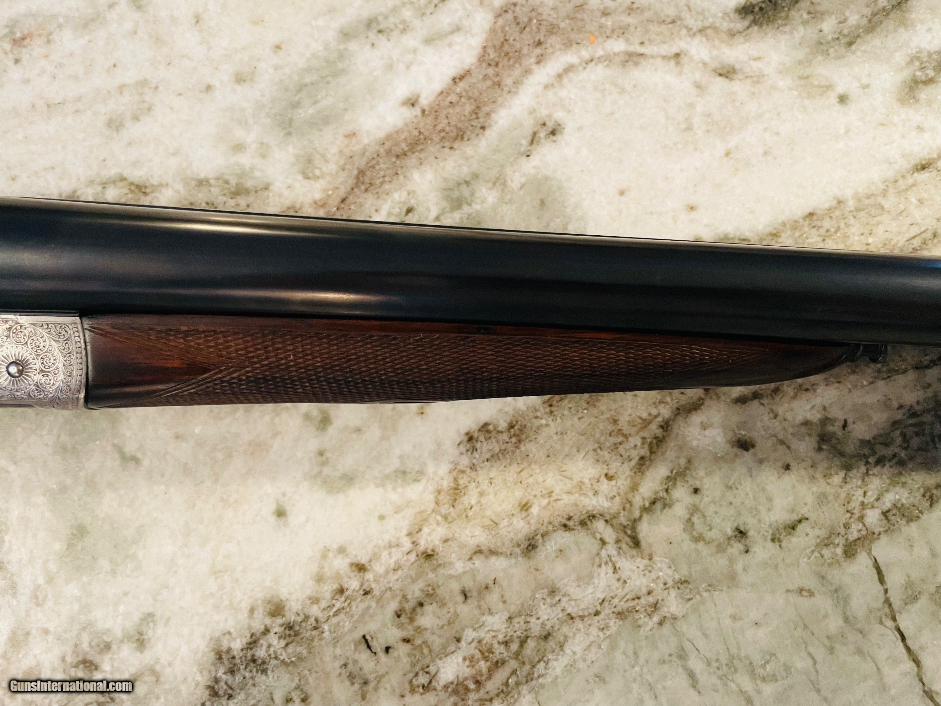 Description: Excellent condition Hollis 12 gauge. A true English "Best" grade boxlock. Wesley Richards style scalloped action and top lever. 100% engraved. The gun would easily cost $100K to produce today. Tied to action, sharp checkering, excellent bluiing and wood. Barrels measure .028 right and .029 left with plenty of thickness to last a century or more of regular shooting. Specifications are below. Email or call 786-375-1709 for any additional information. *Free UPS 2 Day shipping* 28" barrels 14 5/8” LOP 1 1/2" DAC 2 1/4” DAH 1/8" right hand cast “off” 2 1/2" chambers 6lbs 4ozs Ejectors Choked IC/M SOLD |