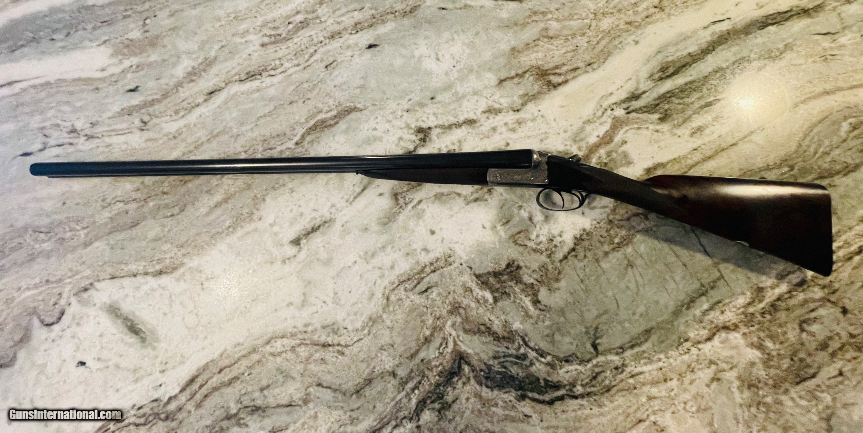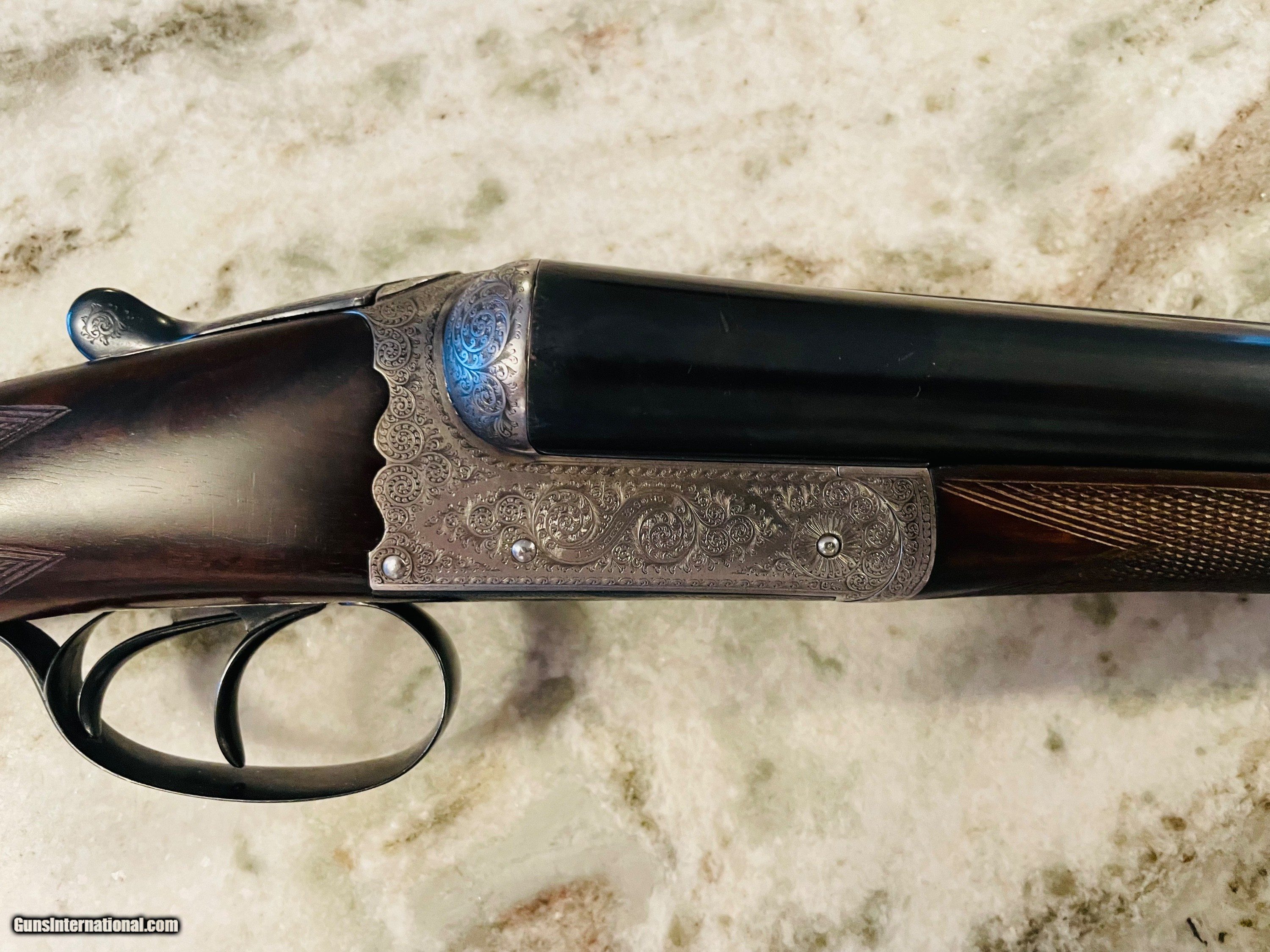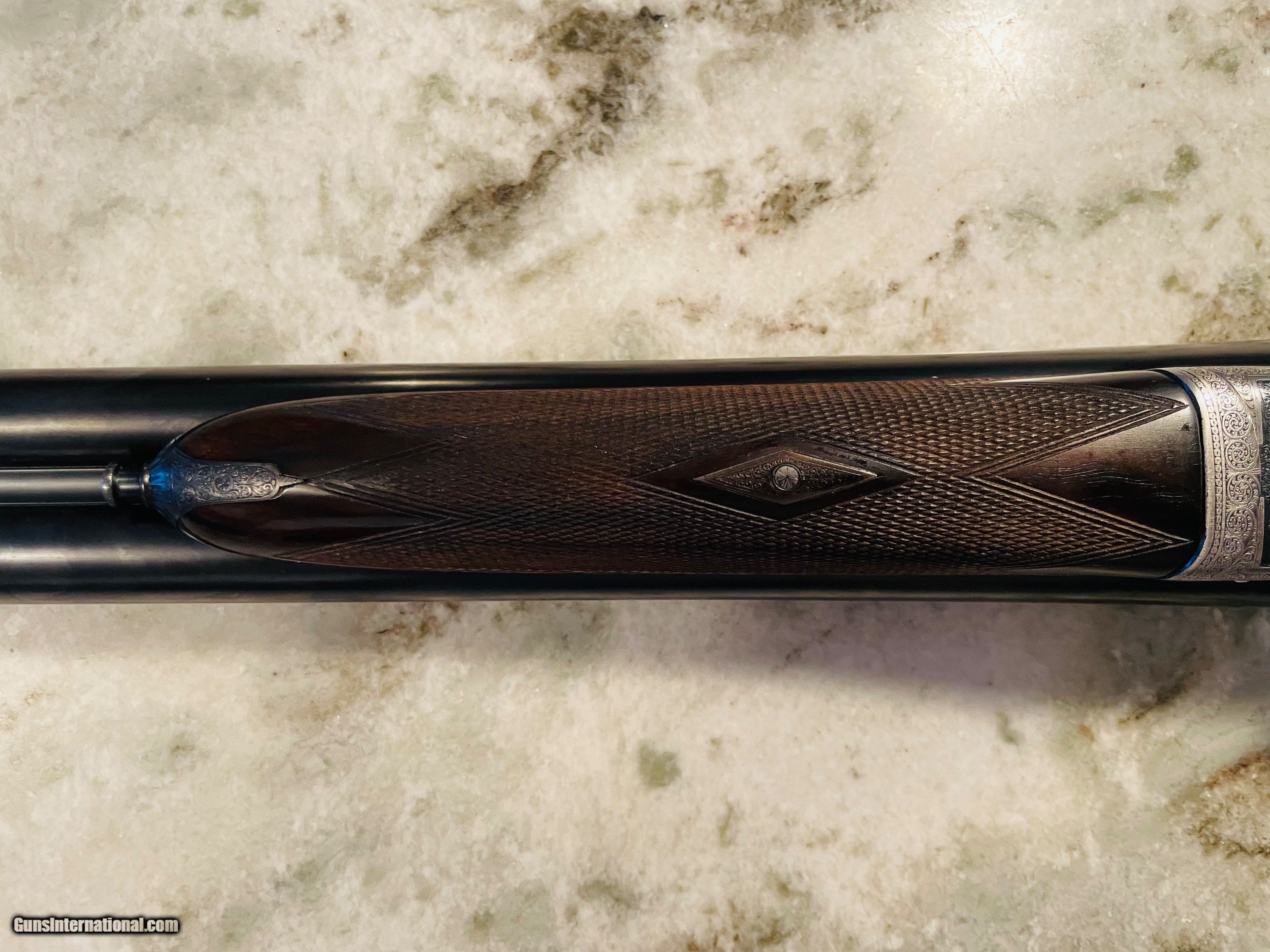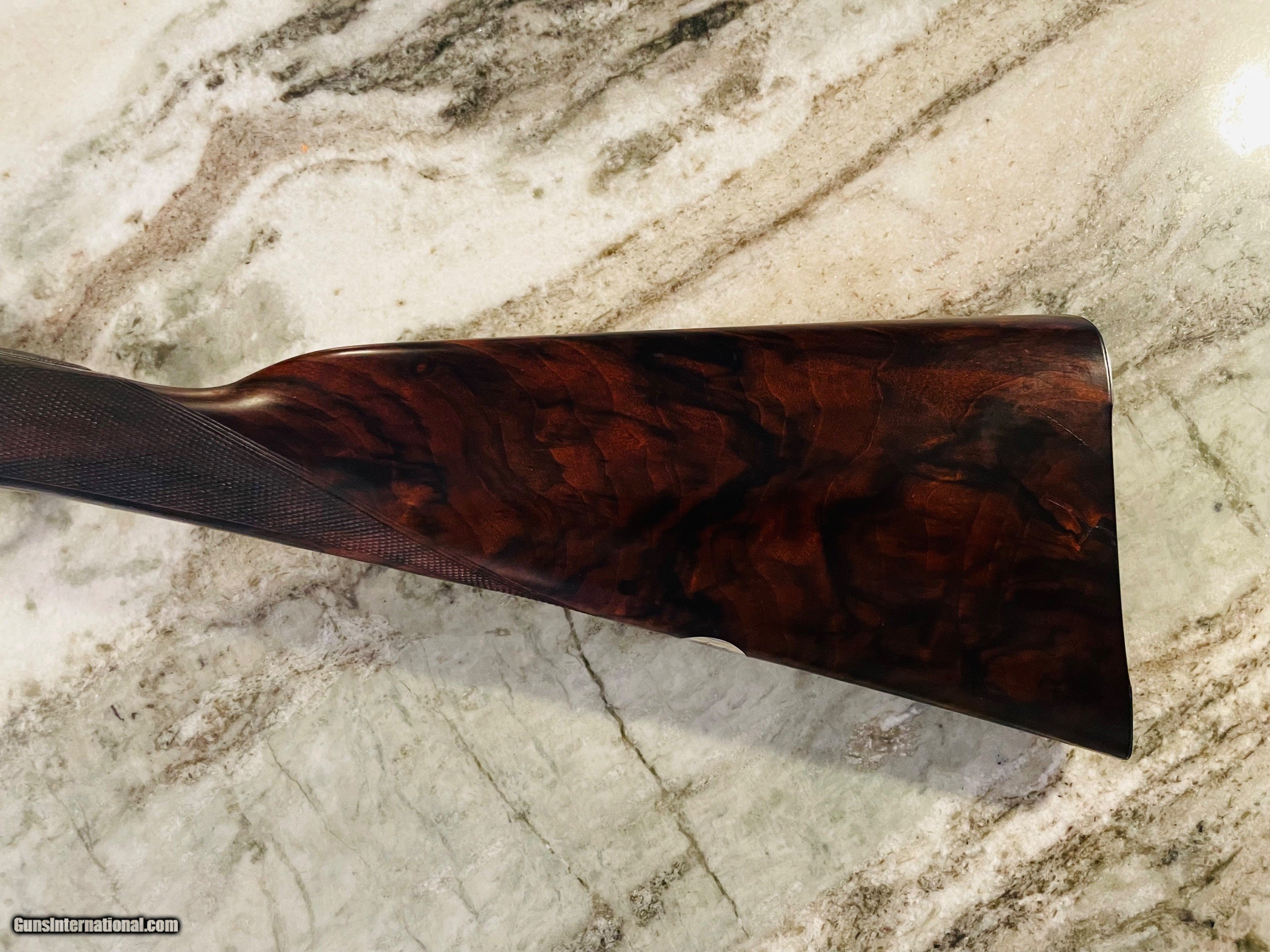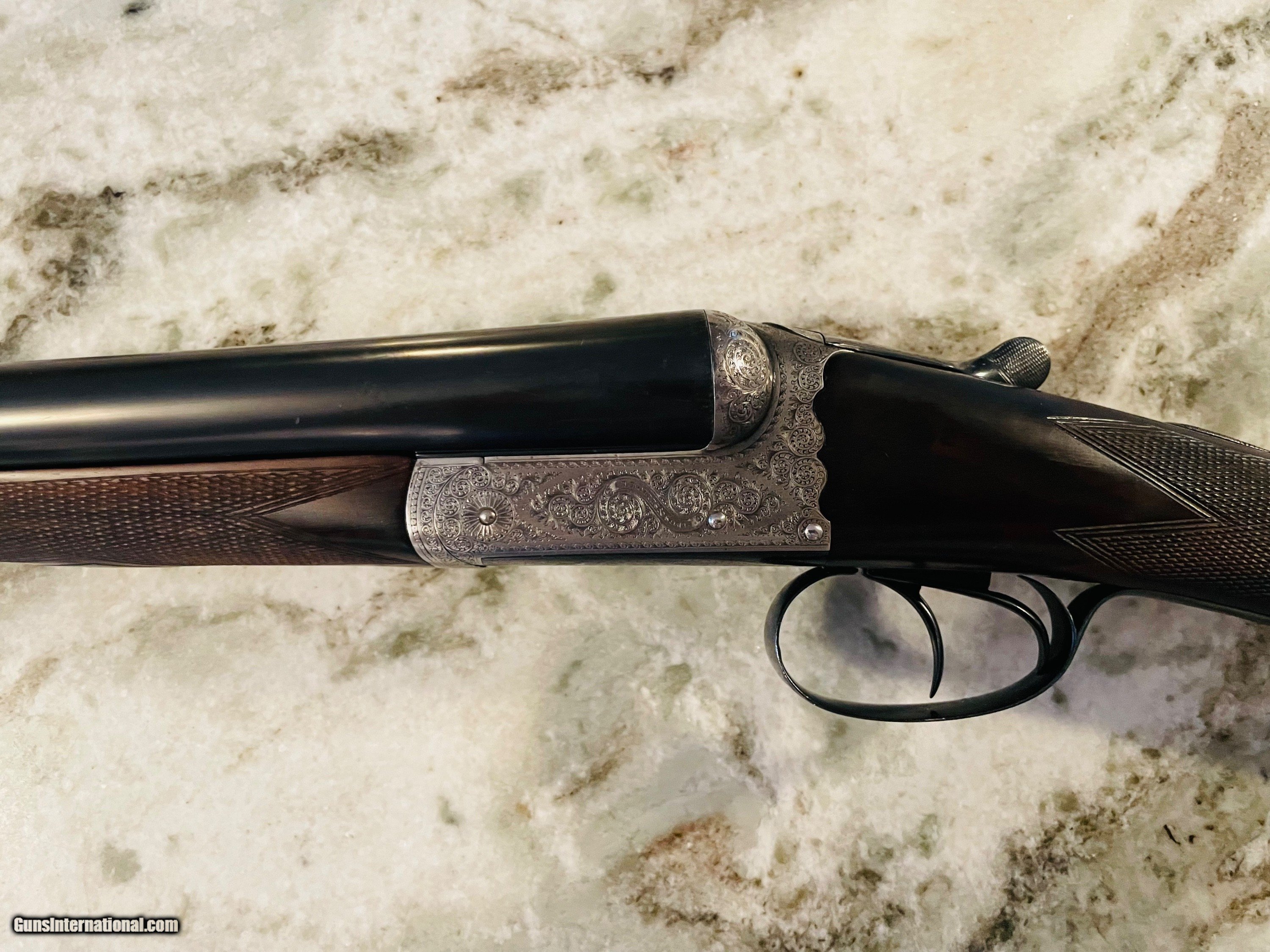 Description: Excellent condition Hollis 12 gauge. A true English "Best" grade boxlock. Wesley Richards style scalloped action and top lever. 100% engraved. The gun would easily cost $100K to produce today. Tied to action, sharp checkering, excellent bluiing and wood. Barrels measure .028 right and .029 left with plenty of thickness to last a century or more of regular shooting. Specifications are below. Email or call 786-375-1709 for any additional information. *Free UPS 2 Day shipping* 28" barrels 14 5/8” LOP 1 1/2" DAC 2 1/4” DAH 1/8" right hand cast “off” 2 1/2" chambers 6lbs 4ozs Ejectors Choked IC/M SOLD |