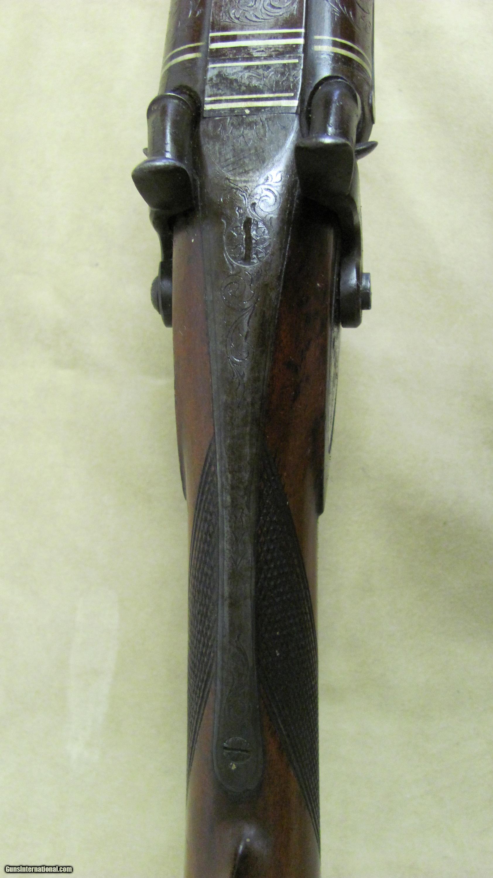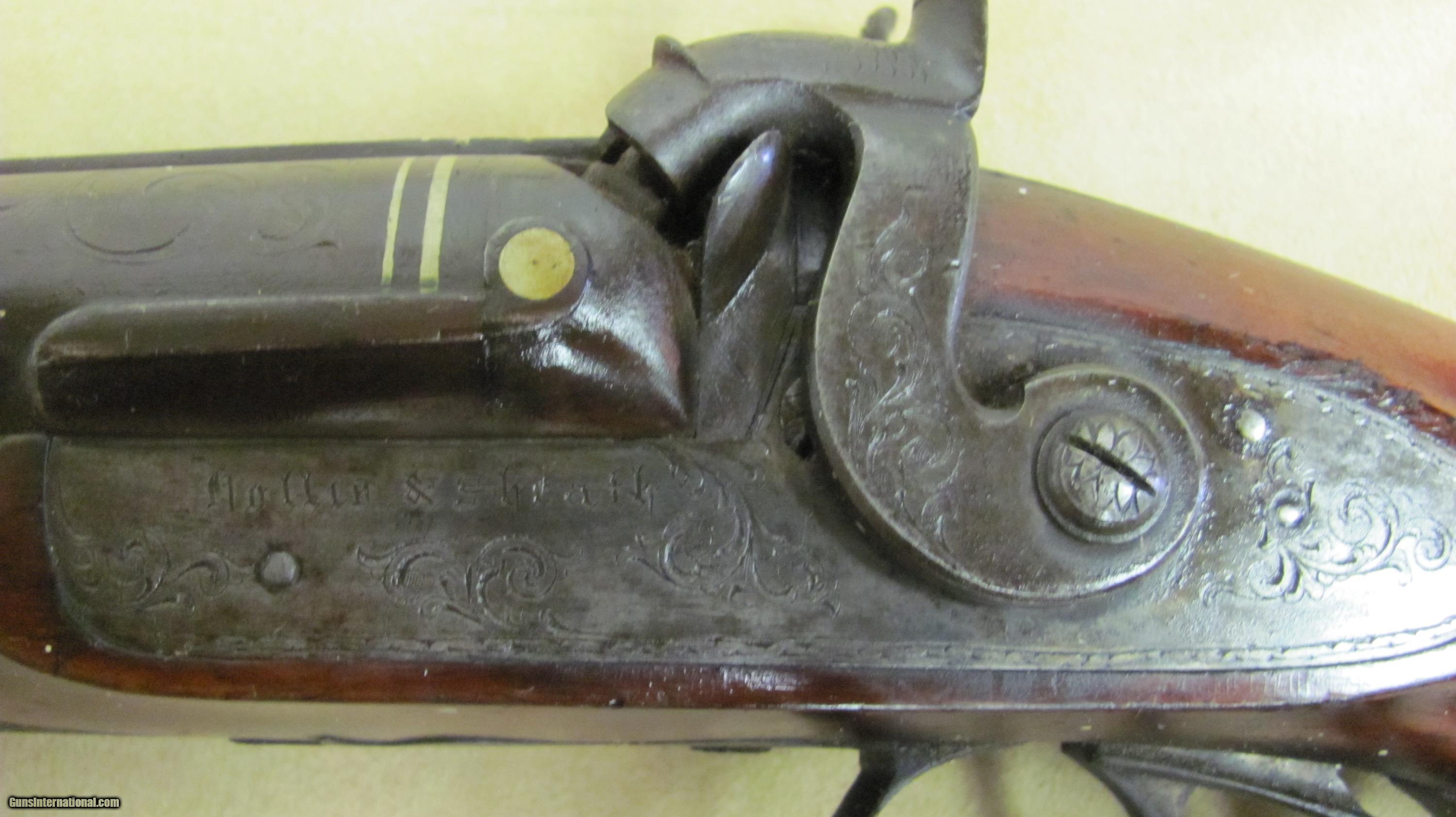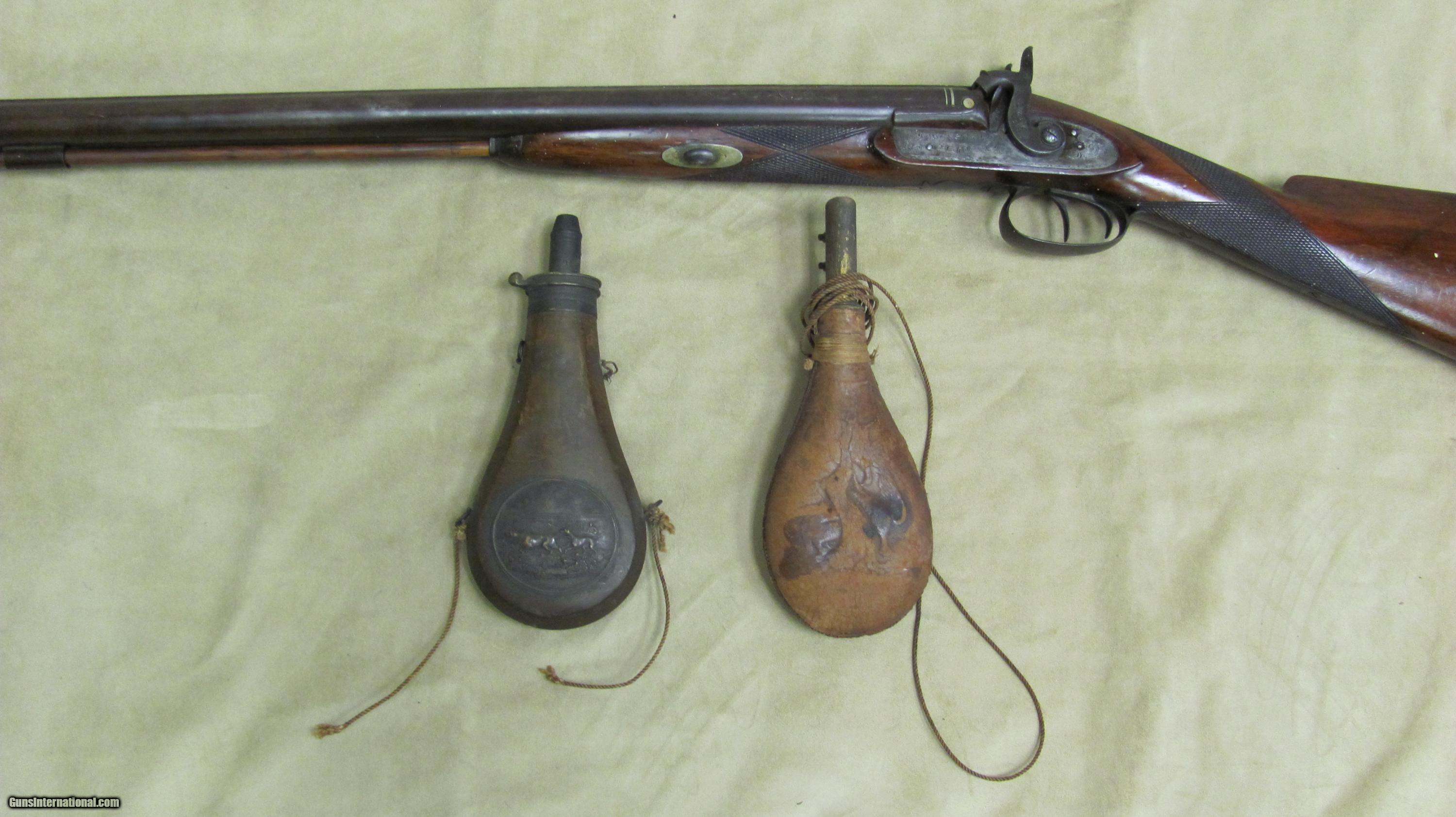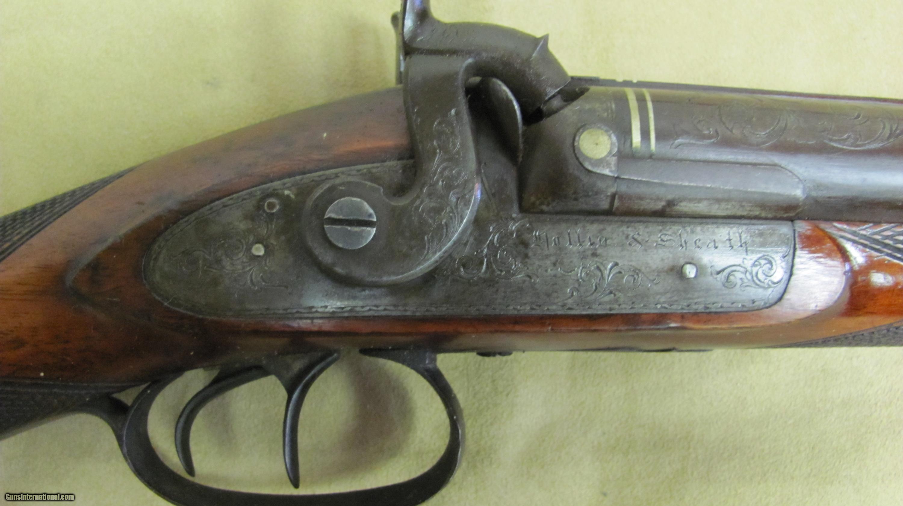 Description: Hollis & Sheath 10 Ga Double Hammer Gun with 35 1/2 Fine Twist steel barrels. This shotgun is engraved and has silver enlays. LOP is 14 3/8", DAC is 1 5/8", DAH 2 1/2 and weight is 9.0 lbs. This gun was manufactured in the 1850's - 1860's. Encluded with this shotgun is a Dixon & Son powder flask and a leather shot flask. This is a very nice antique shotgun. SOLD Antique: Yes Manufacturer: Hollis & Sheath Gauge Info: 10 Ga. Engraving: Yes |