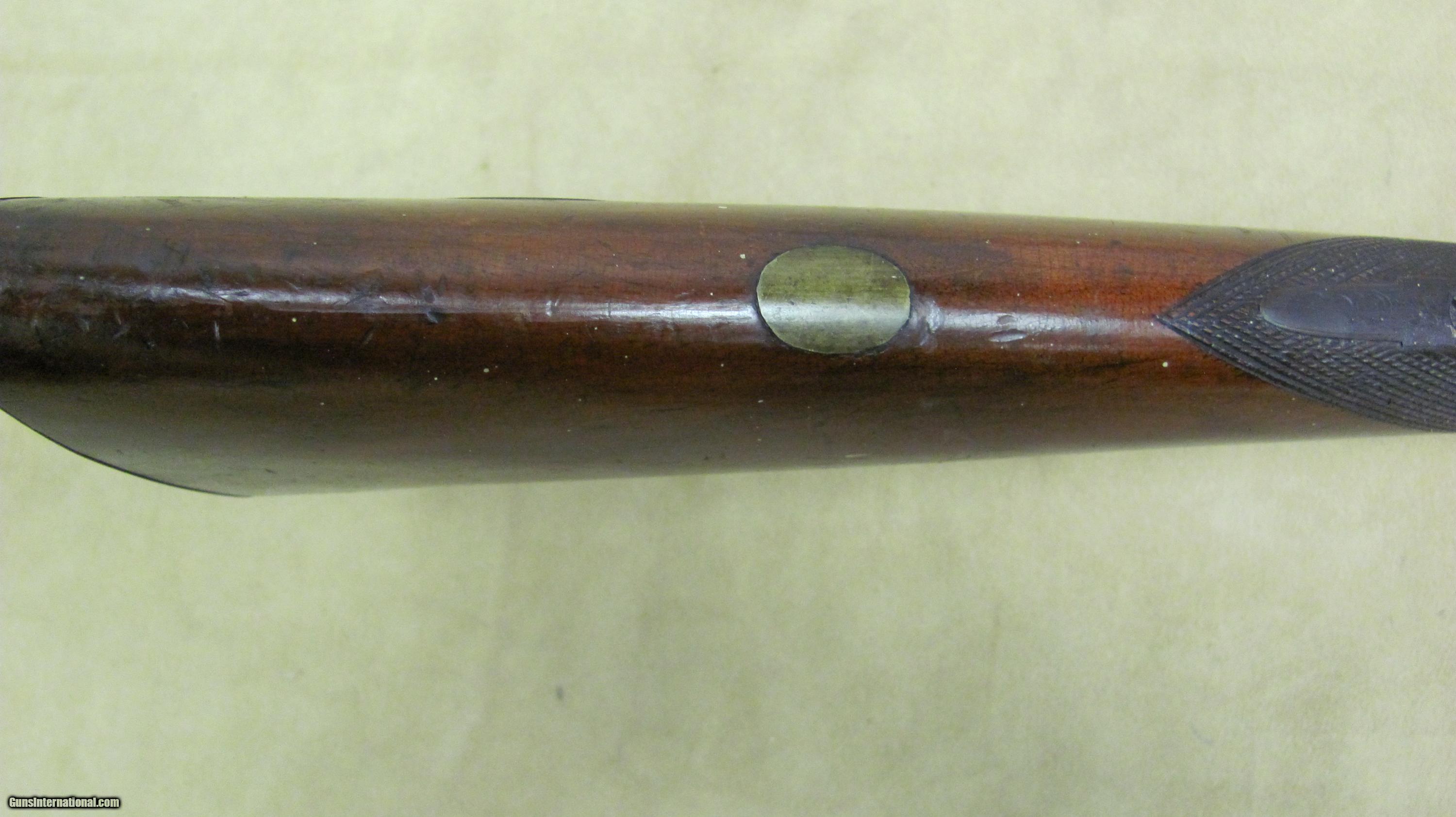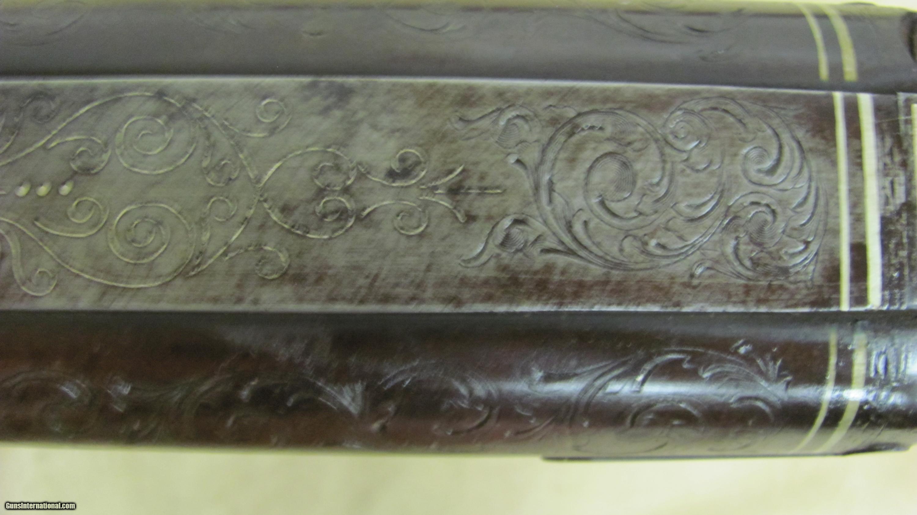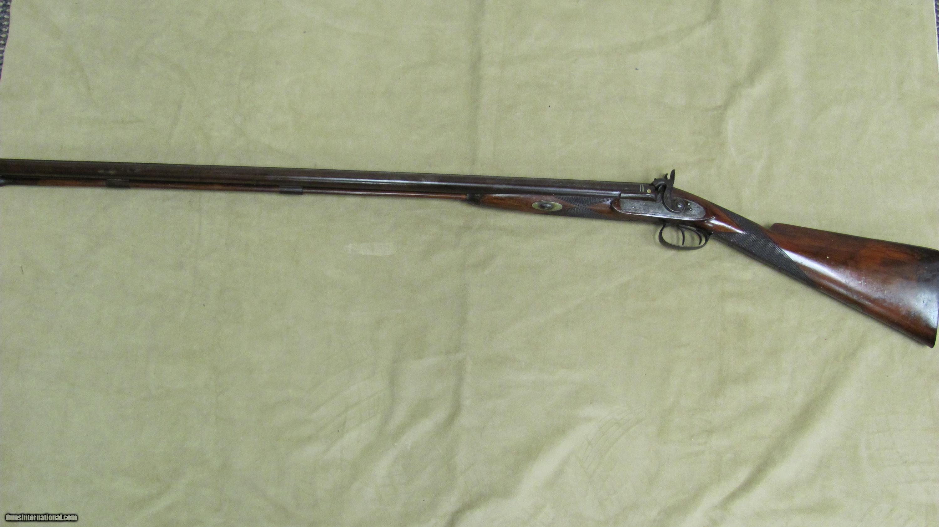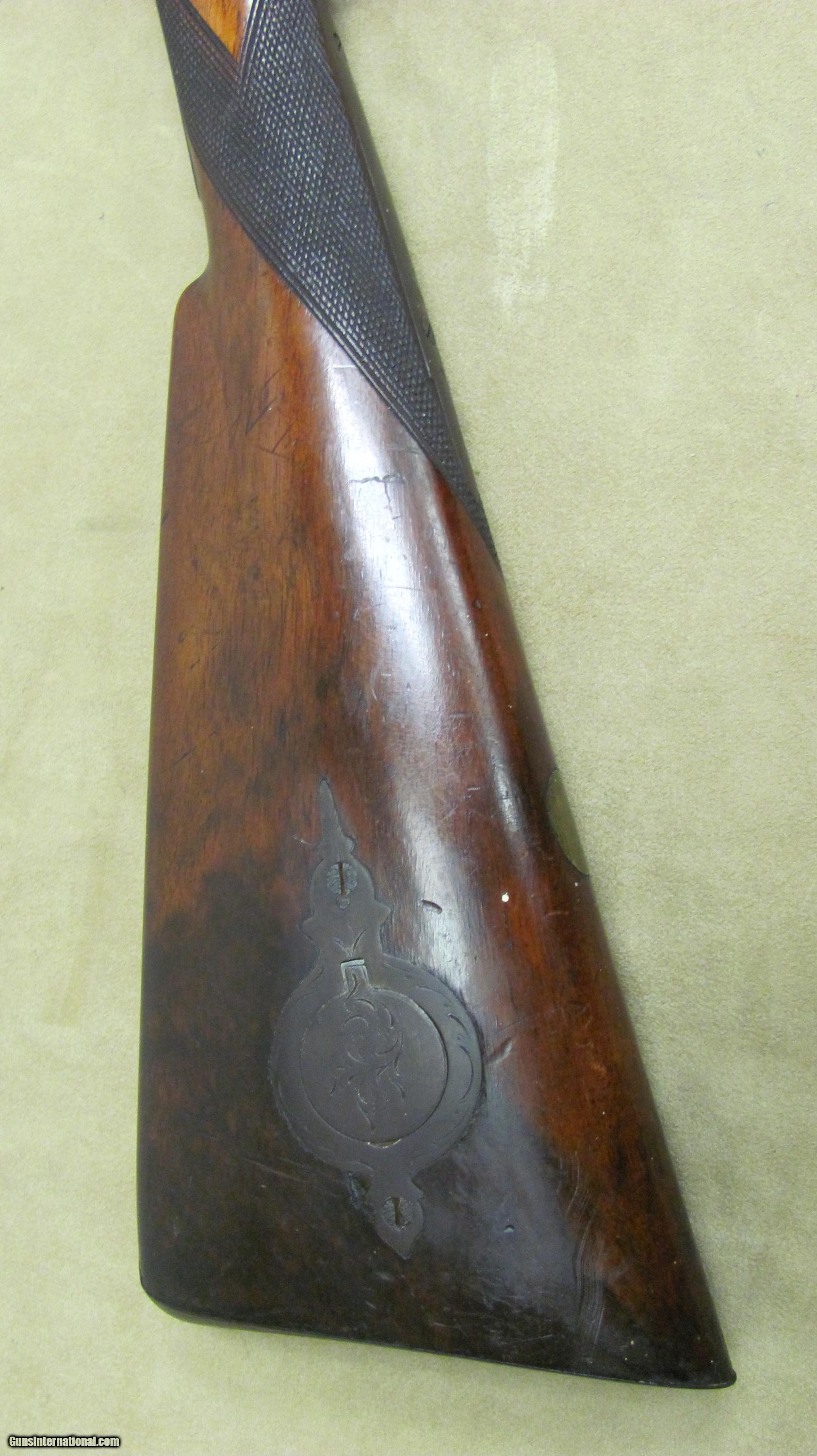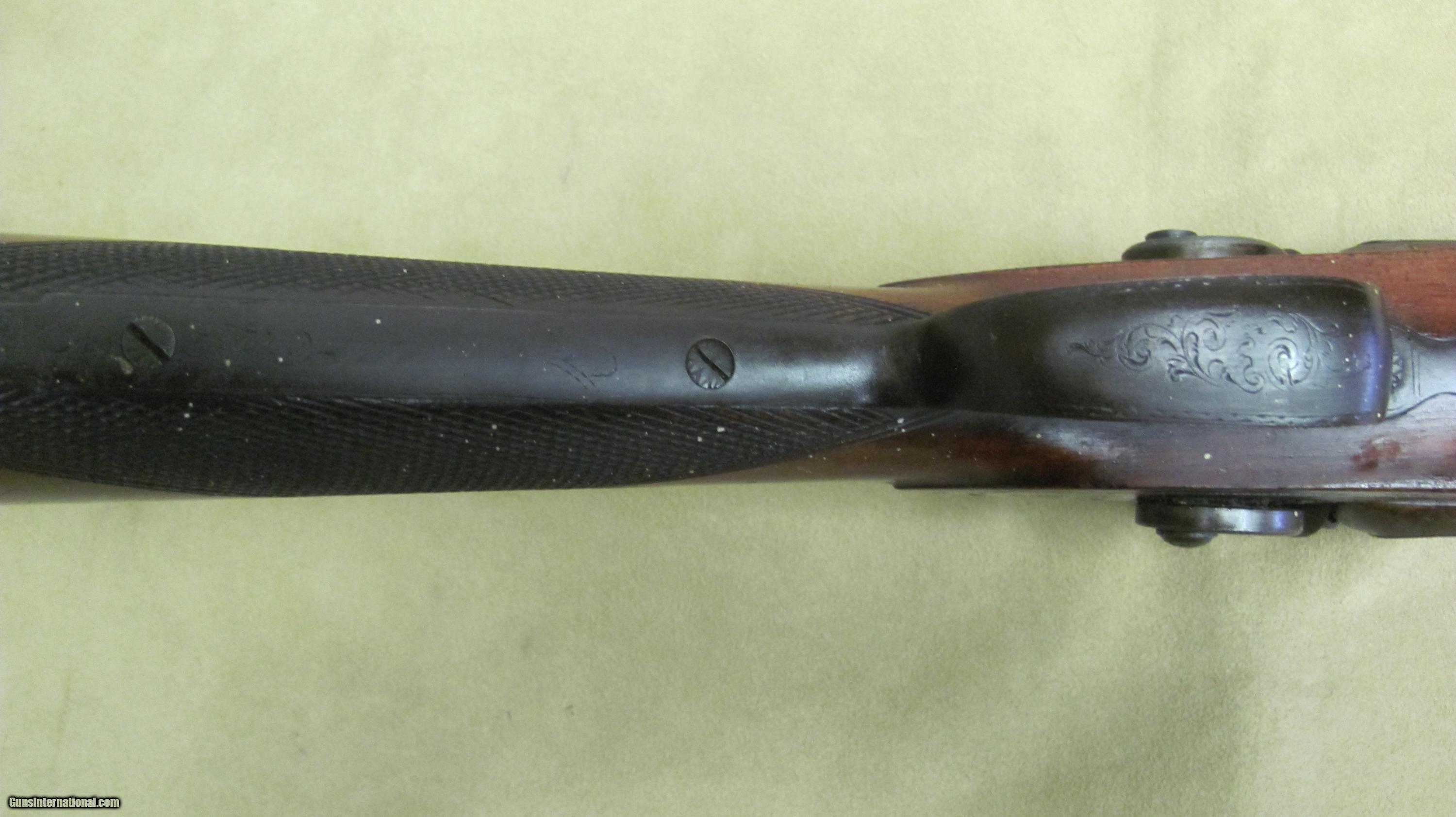 Description: Hollis & Sheath 10 Ga Double Hammer Gun with 35 1/2 Fine Twist steel barrels. This shotgun is engraved and has silver enlays. LOP is 14 3/8", DAC is 1 5/8", DAH 2 1/2 and weight is 9.0 lbs. This gun was manufactured in the 1850's - 1860's. Encluded with this shotgun is a Dixon & Son powder flask and a leather shot flask. This is a very nice antique shotgun. SOLD Antique: Yes Manufacturer: Hollis & Sheath Gauge Info: 10 Ga. Engraving: Yes |