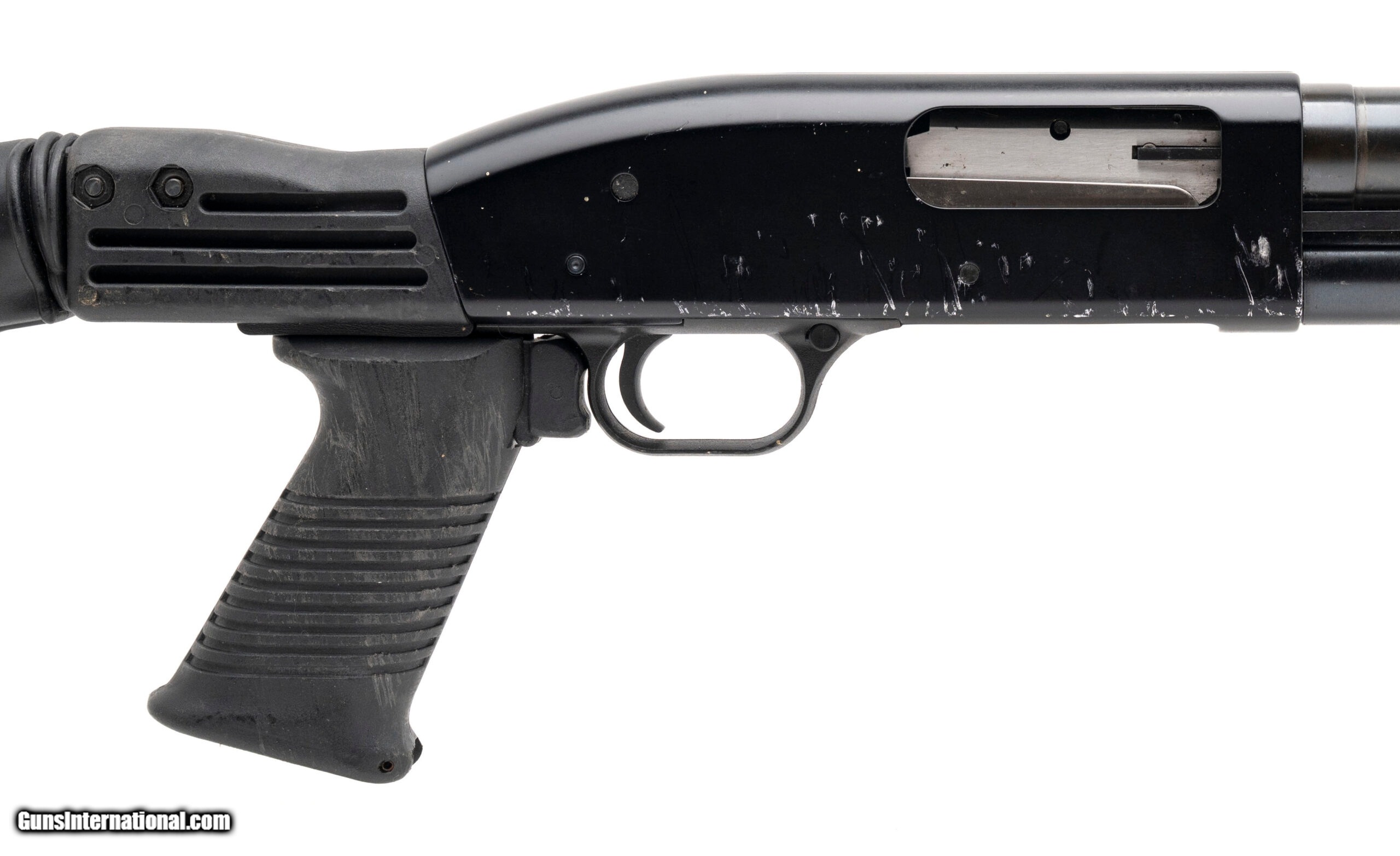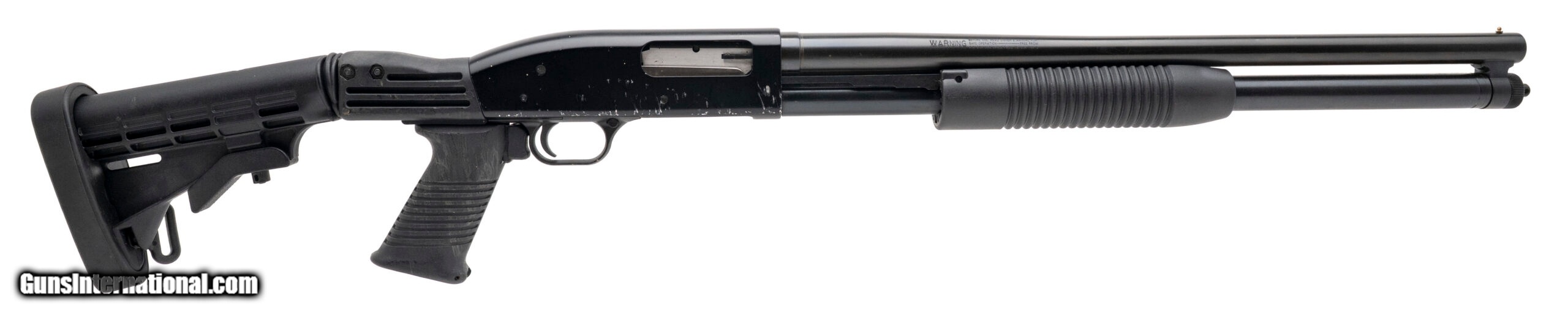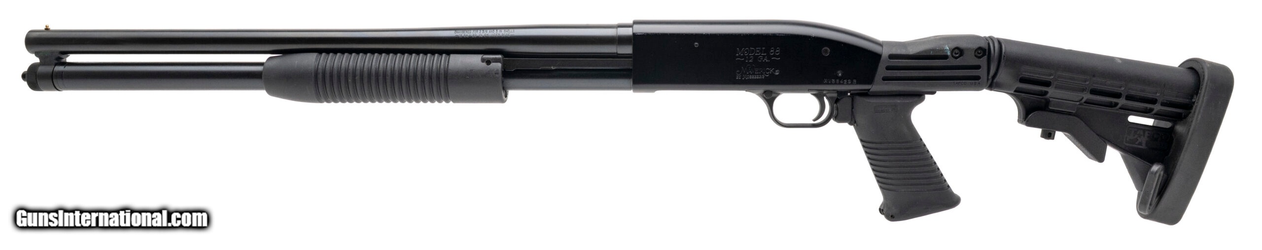 Description: "SN: MV38423R. Modern production, 12 gauge with a 20"" cylinder bore barrel chambered for 2 3/4"" & 3"" shells. Bore is very good. Pump-action defense shotgun with a Tapco collapsible stock & pistol grip, and blued finish. Finish and stock are heavily marked, most notably to the right side of the receiver and stock. Overall condition is good. SOLD |