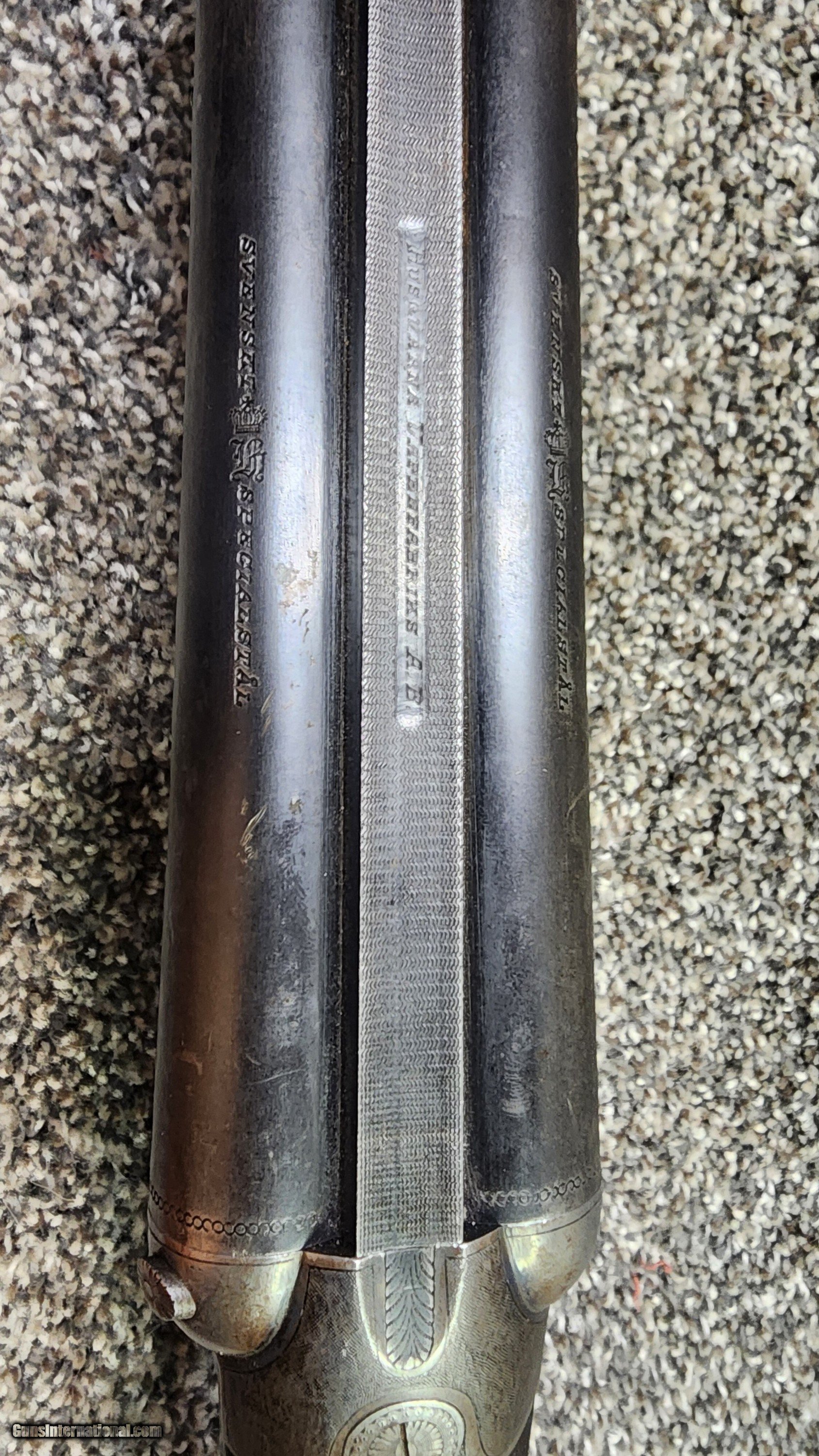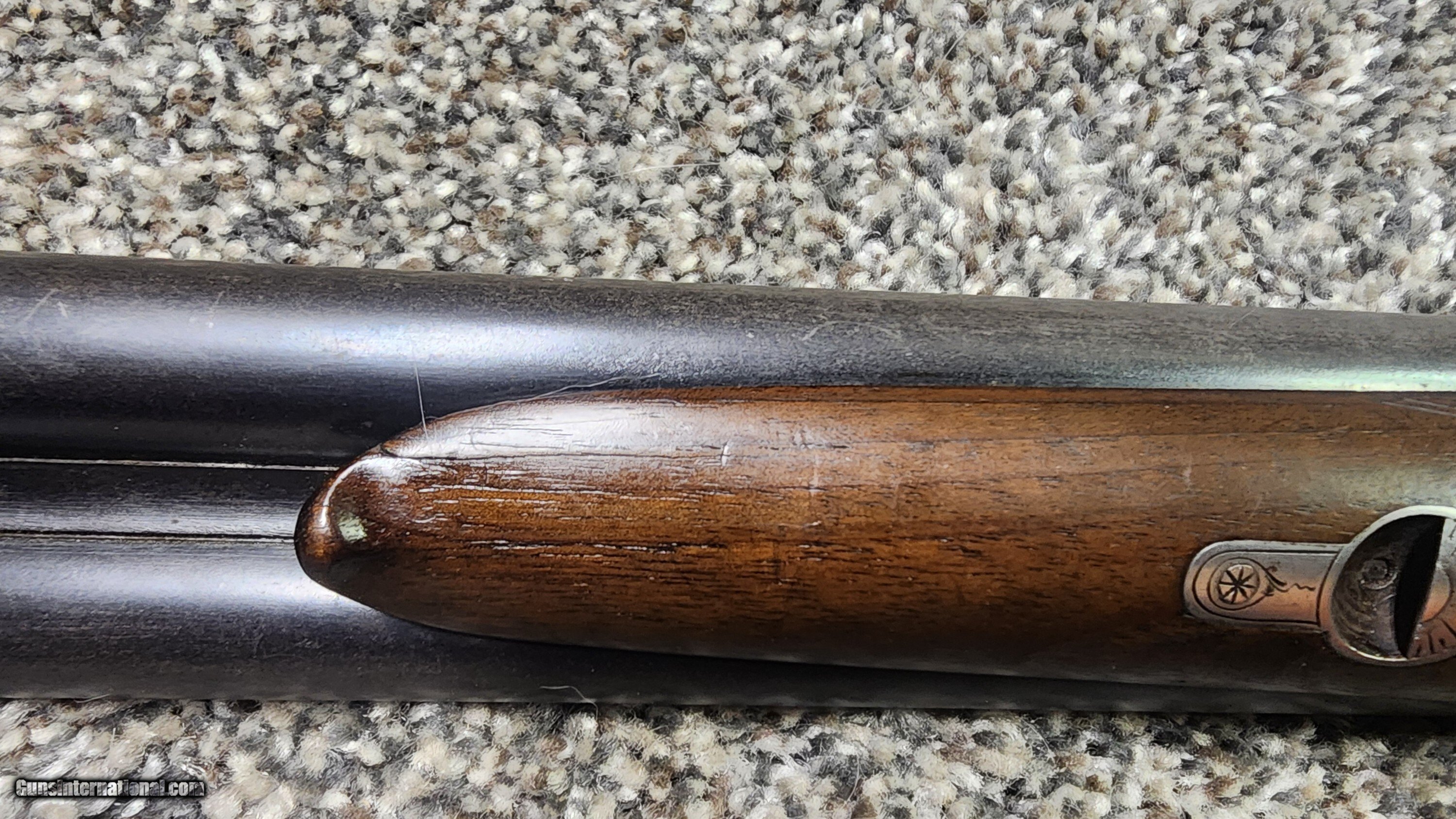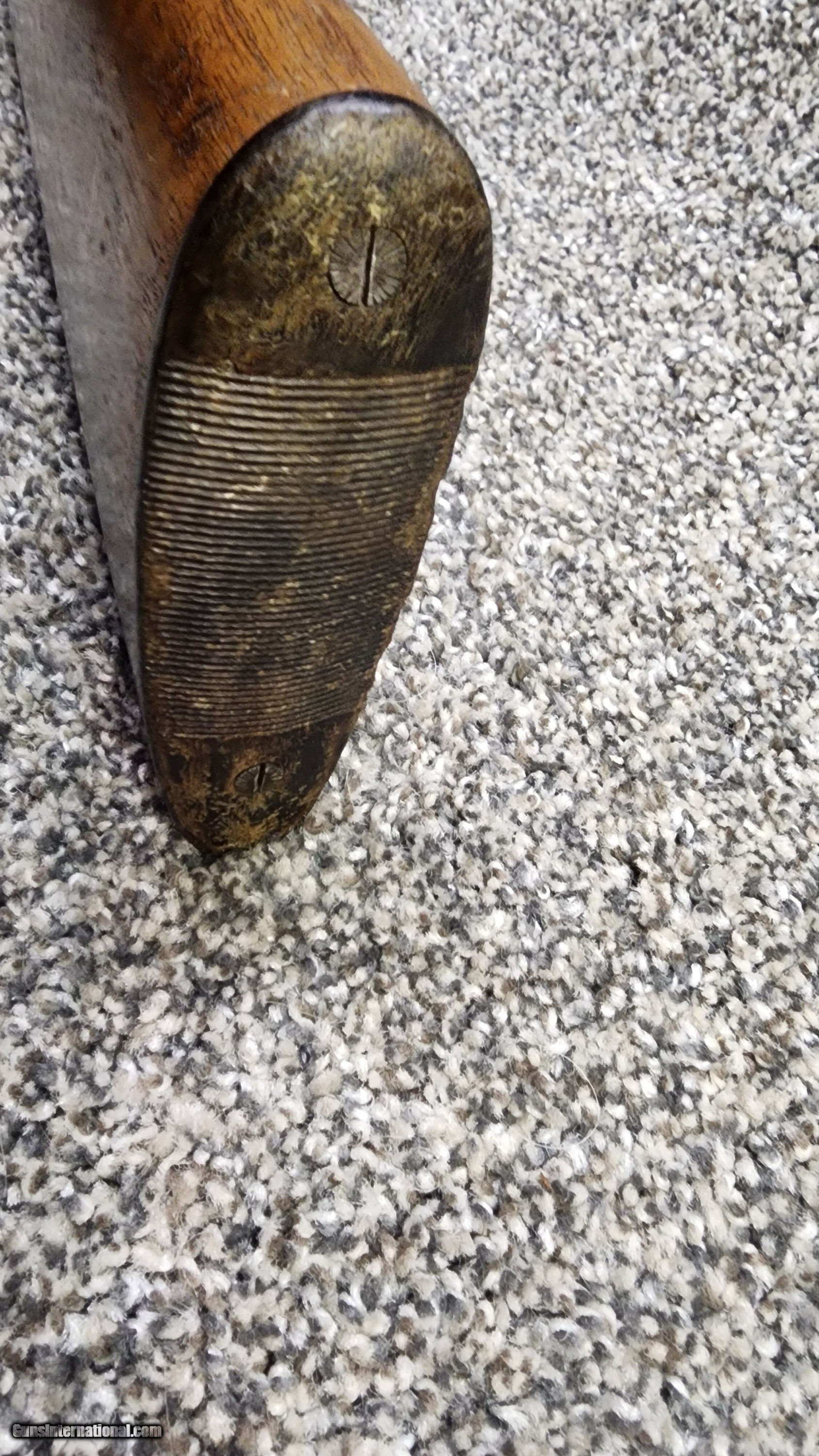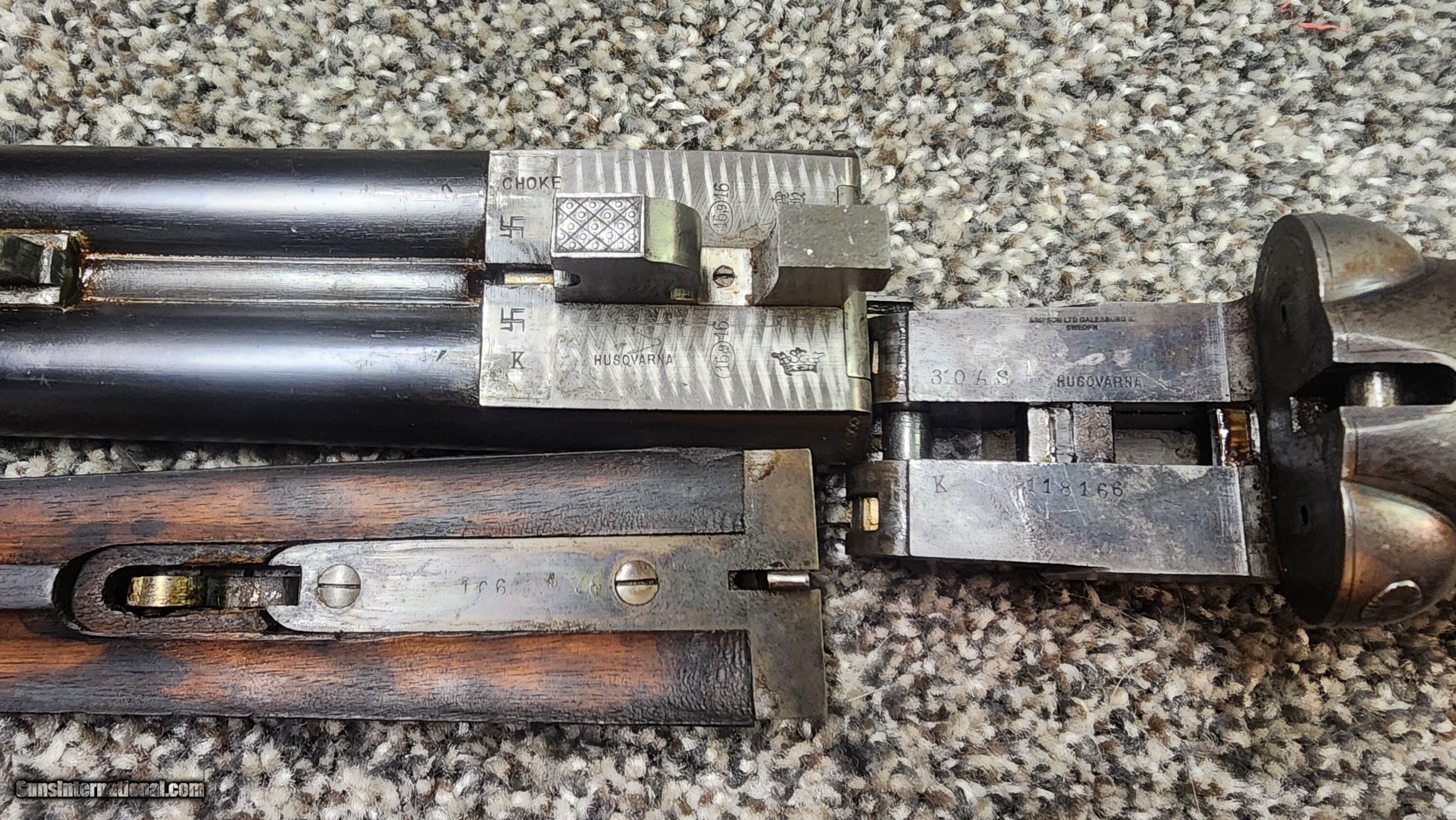 Description: Hard to find Husqvarna 310AS in 16ga, made in 1919. These are hiqh quality boxlocks made on Sauer crossbolt actions, with Swedish Special Steel barrels. This very good original condition example has 29.5" barrels choked im/xf, with 2 5/8" chambers and very good bores, would polish to excellent. Barrels ring. One light ding 5" from the left muzzle. I wouldn't hesitate to shoot off the shelf 2.75" 1oz loads in this gun. I shot a few rounds of trap and skeet with it and scored in the 20's. I also patterned it, and both barrels shoot exactly to point of aim. Strong action with tight lever right lockup with forend on or off. Barrel flats have rhunes that look like swastikas, but actually signify hammer forged barrels. Husqvarna discontinued using this during WWII. Solid wood, no cracks on buttstock, although forend does have a crack near the tip. Stock has a chip down by the tang. Both easy fixes. . Great shooting gun that weighs 6 lbs 8oz. This gun has it all, no issues, and would make an excellent restoration candidate and wonderful all around bird or clays gun. I can do the restoration work at extra cost. Feel free to inquire. 3 day inspection. You will love this gun! FFL/C&R required, $50 UPS ground shipping to lower 48, AK and HI extra. To pay by card, please call me directly at 253.241.8190. Thanks. SOLD Curio/Relic: Yes Shotgun Gauge: 16 Gauge Manufacturer: Husqvarna Model: 310AS Barrel Length: 29.5 Chambers: 2 5/8 Ejectors: extractor Condition: Very Good Bore Condition: Very Good Barrels: Swedish Special Steel Action: Boxlock non ejector Stock Dimensions: 1 9/16 x 2 5/8 x 14 7/8 Stock Cast: Cast off Butt Pad: Original bone plate Weight: 6lbs 8 oz Manufacture Date: 1919 Choke Left: xf Choke Right: im Proof:Nitro: Yes |
