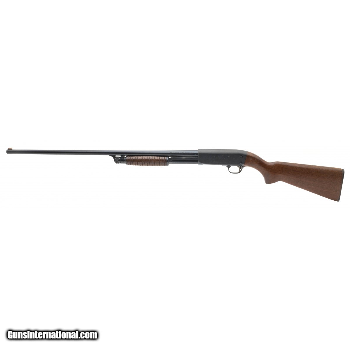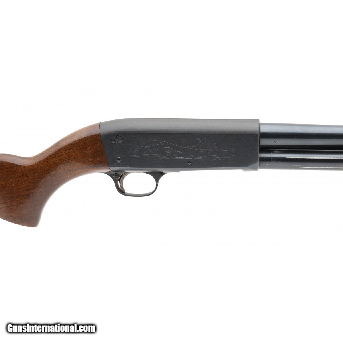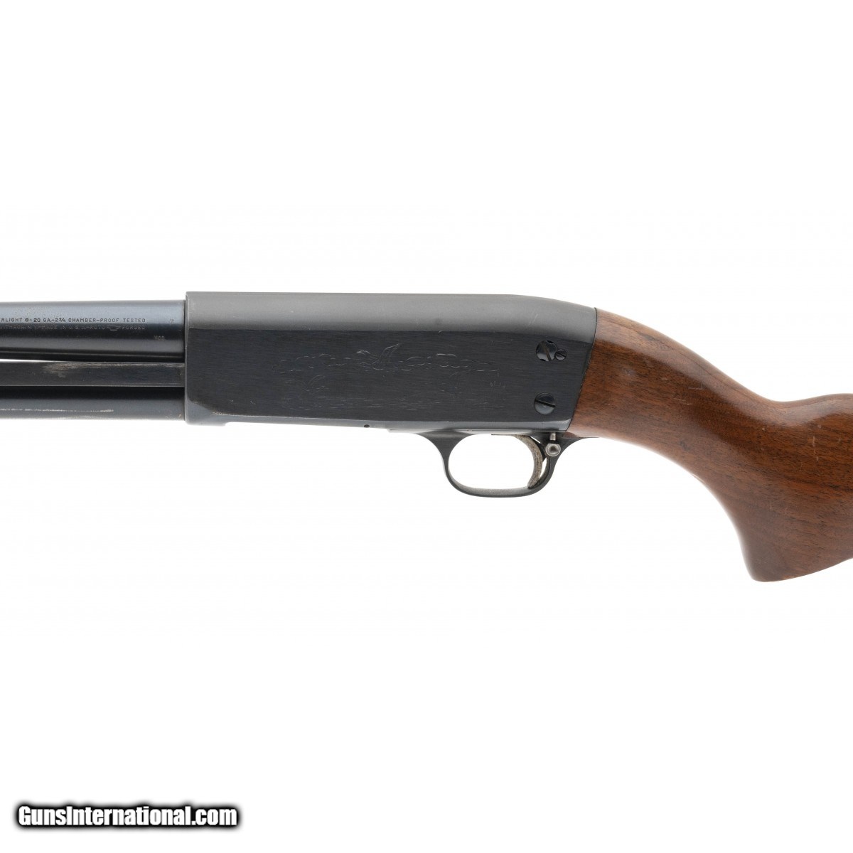 Description: " SN:901262. Manufactured circa 1965, 20 gauge with a 27.5"" barrel. Bore is in excellent condition. Pump action shotgun with fiber optic front sight, wooden stock, 14"" LOP and engraved receiver. Overall condition is very good. (Consignment) SOLD |