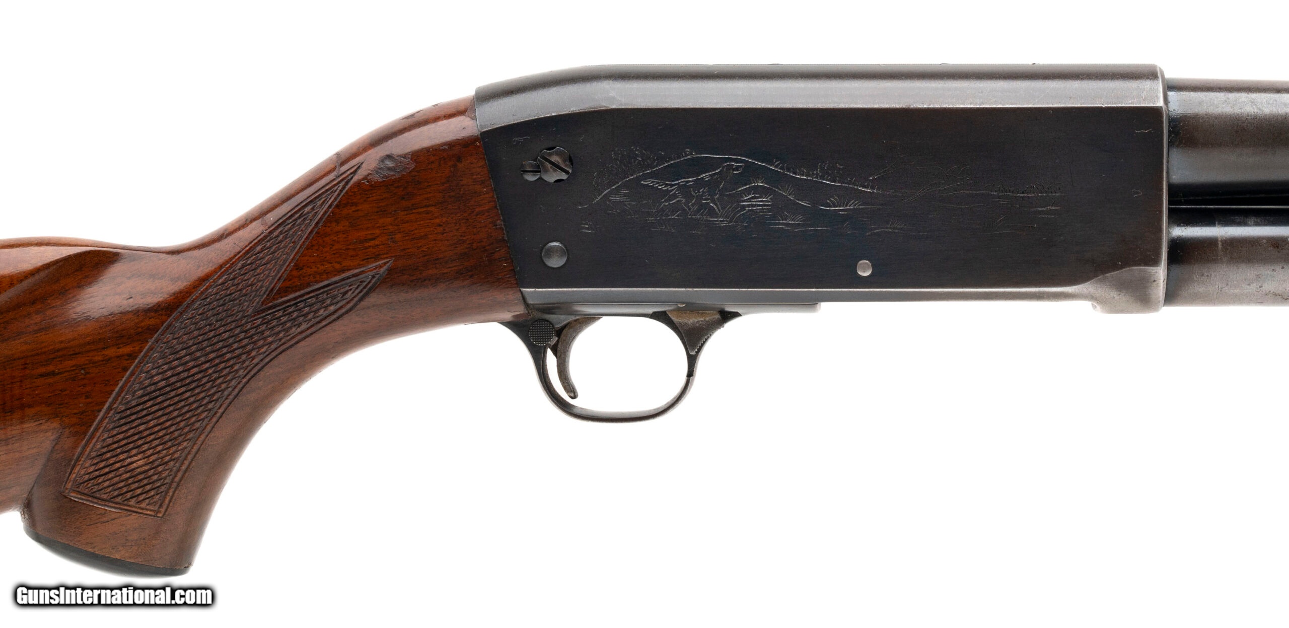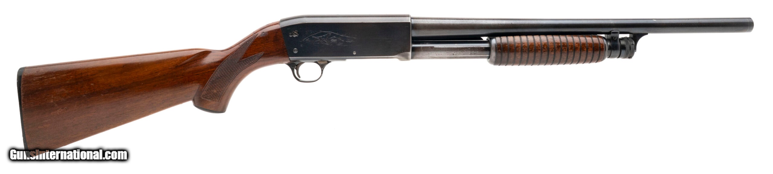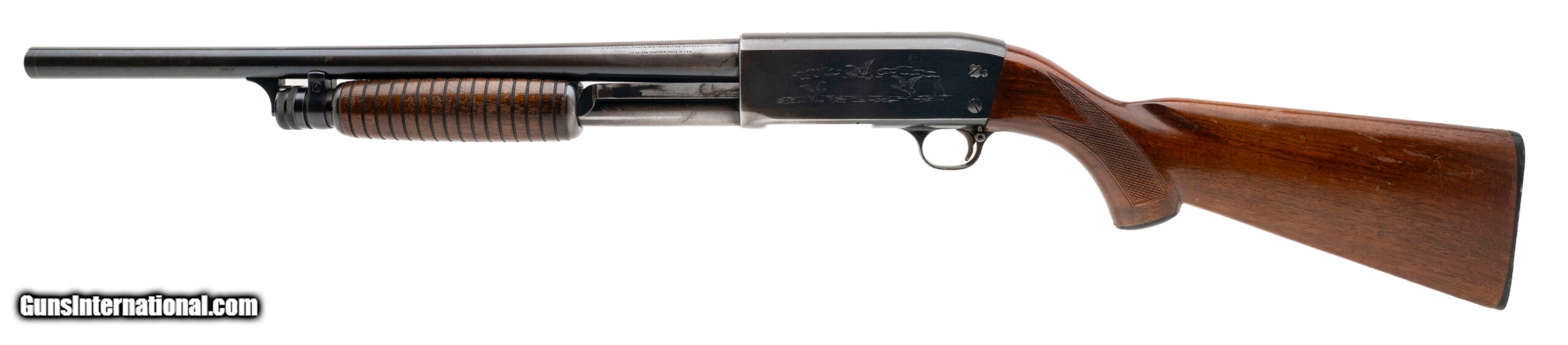 Description: "SN: 219386. Made in 1949, 12 gauge with a 18"" barrel chambered for 2 3/4"" shells w/modified choke. Bore is excellent. Slam-fire pump-action field shotgun with blued finish, and checkered wood stock & forend with a 13.75"" LOP. Finish is heavily worn with about 65%+ of original bluing still present. Wood stock & forend show moderate handling wear. Overall condition is good. SOLD |