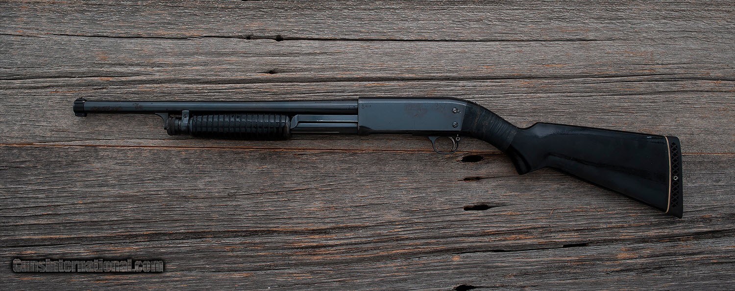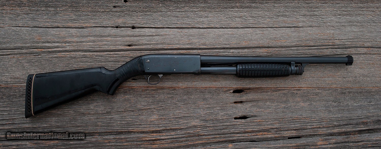 Description: Ithaca - 37 - 12 ga - Item Number: ITH57945 Shotgun type: Pump Action Action: Pump Ejectors: Yes Trigger: Single Grip: Pistol Grip Forend: Ribbed Lop: 13 7/8 " Pad thickness: 1 " Type of butt: Rubber Pad Drop comb: 1 5/8 " Drop heel: 2 1/2 " Cast amount: 0 " Weight: 6 lbs, 8 oz Manufactured in: USA Finish: Blue Overall condition: Fair Stock condition: Fair Metal condition: Fair Stock: Original finish Metal: Original finish Type of Case: none Extra barrels: 0 Barrel info: Gauge: 12 ga Chamber: 2 3/4 " Length: 18 " Chokes: Cyl Comments : Stock is cracked at the wrist, some heavy pitting on the barrel. SG-107 SOLD |