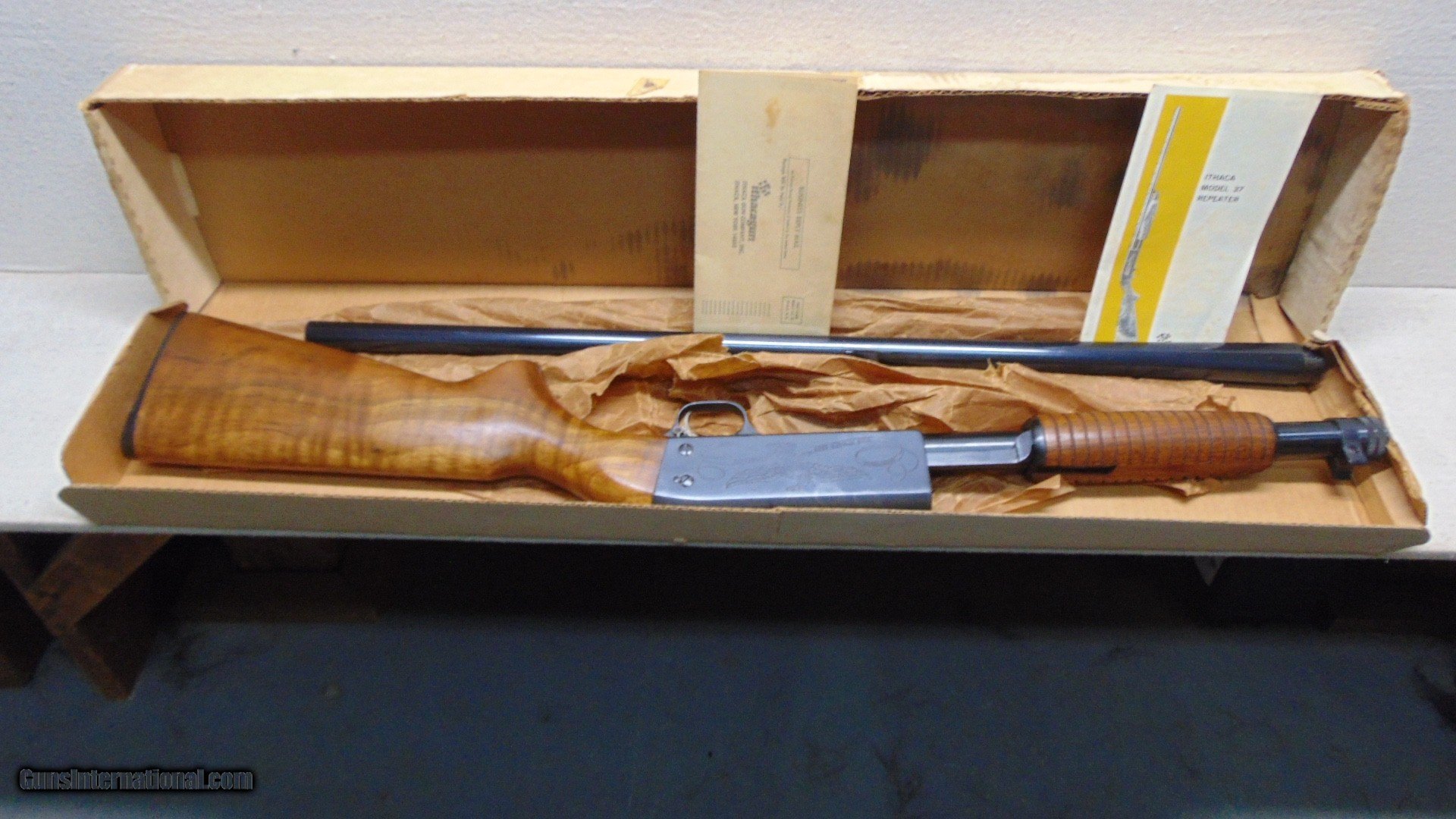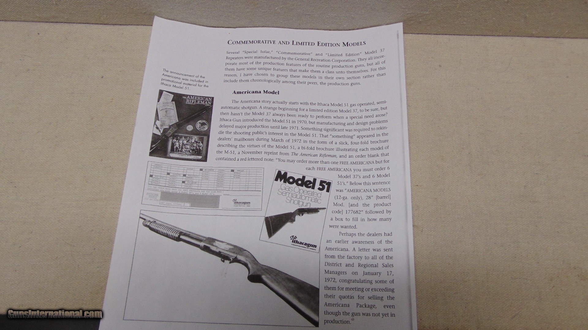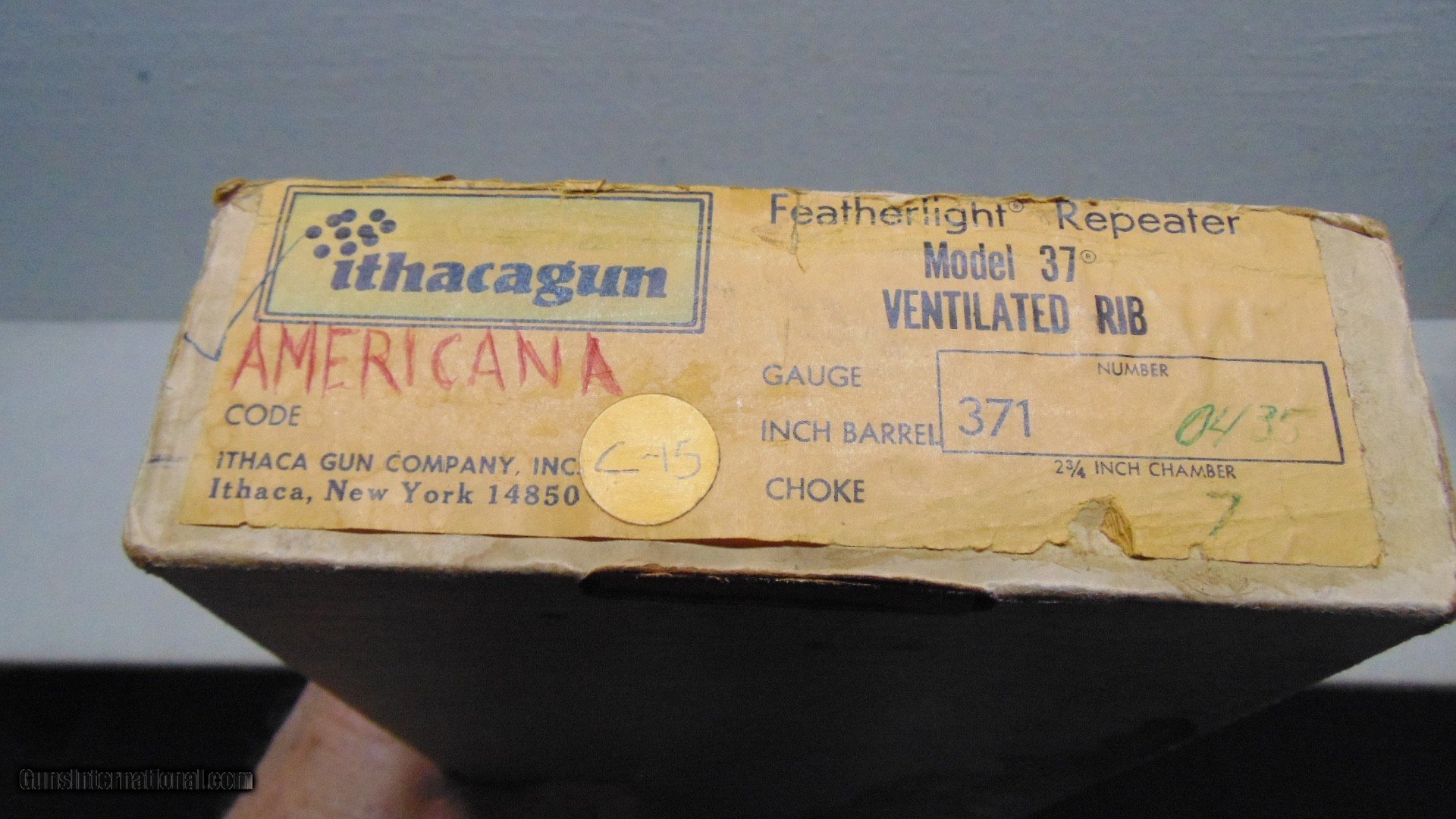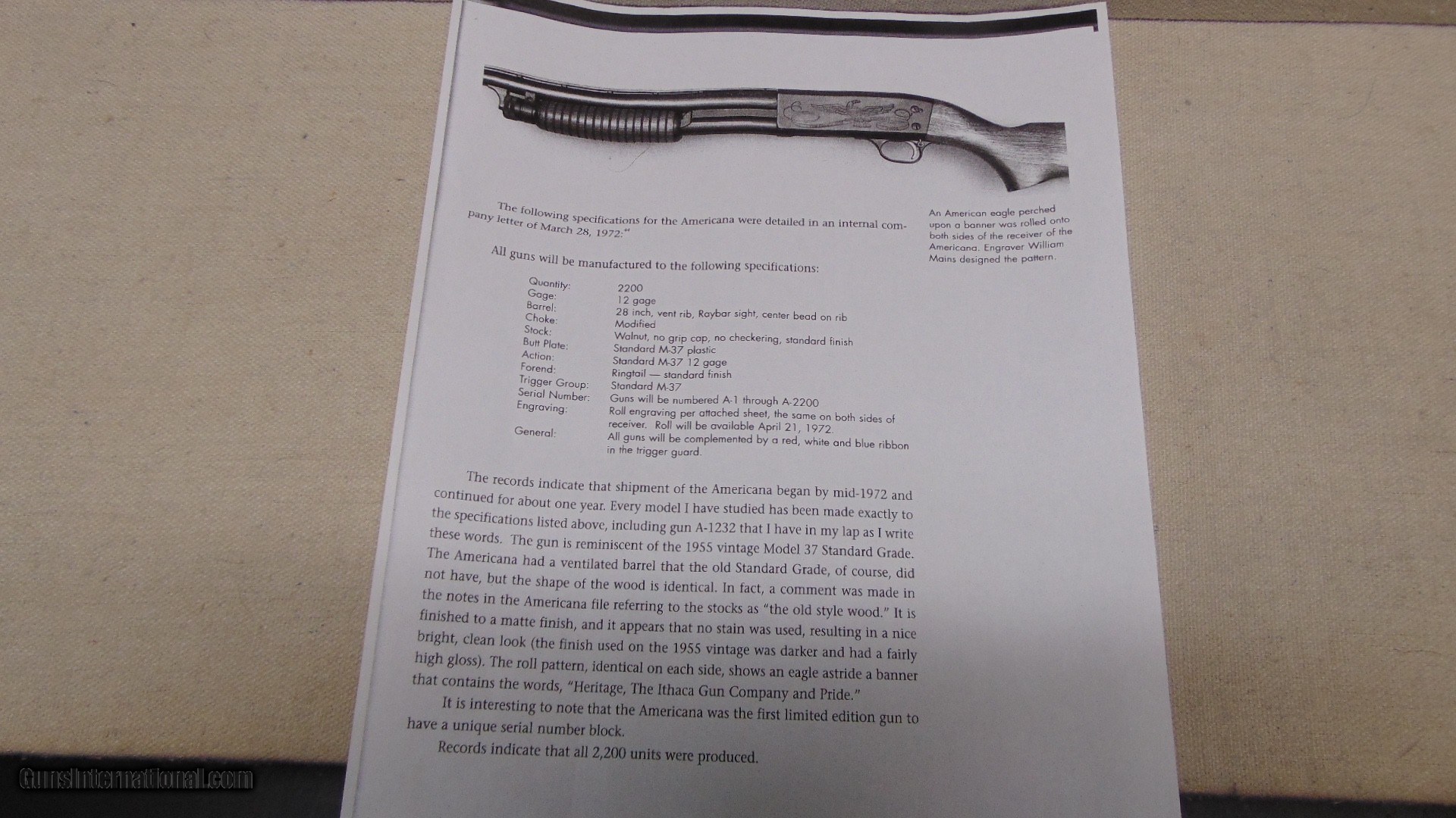 Description: !!! SOLD !!! Ithica 37 Americana ,12 Ga ,2 3/4" Chamber ,28" VR Barrel with Rabar Sight ,Fixed Modified Choke ,Promotional Gun to Dealers in 1972 ,Only 2200 Produced , Appears Unfired Although there is Minor Magazine Tube Wear ,With Tattered Correct Numbered Box ,Manual and Warranty Card Store Hours-Thurs-Fri-10AM-8PM Sat-9AM-12PM All Other Times Please Leave a Message, Thank You! No Hawaiian & California Sales 6% Pa Sales Tax Applicable Shipping $35.00 Contact Information Long Shot Gun Shop 299 Hooflander Road Dornsife,Pa.,17823 570-758-2262 longshotgunshopgmail SOLD Shotgun Gauge: 12 Gauge Manufacturer: Ithaca Model: 37 Americana Serial Number: A0435 Barrel Length: 28" VR |
