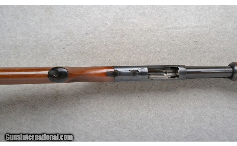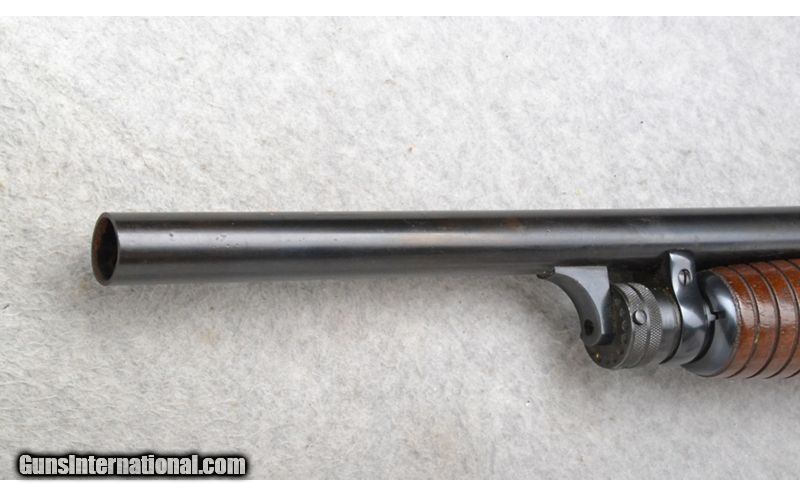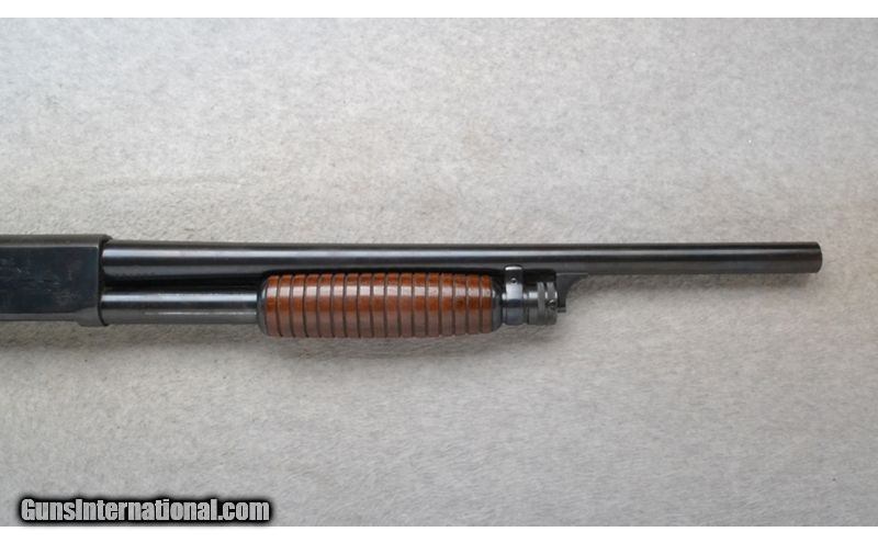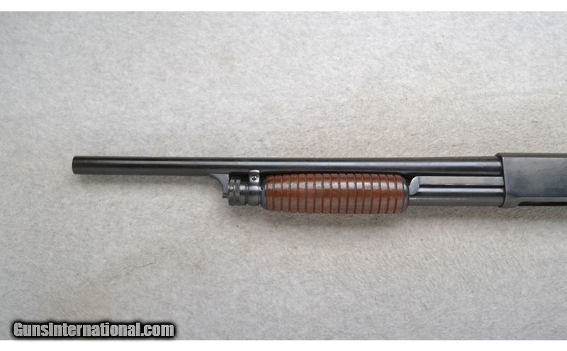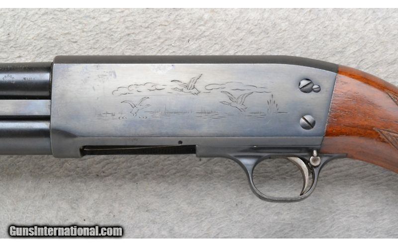 Description: This Ithaca Model 37 is a right hand pump action shotgun in 12 Ga. Its barrel has been cut down to 19 inches. There are no sights. With a 2 3/4 inch chamber the choke now measures to be CYL with a gauge. The butt stock is a checkered grip hardwood pistol grip with a black cap. The forearm is a grooved grip hardwood. The receiver is engraved with ducks and pheasants in flight in an outdoor scene. 12 Gauge SOLD Chambers: 2 3/4 inch. Metal Condition: "Fair. Freckling, light rust and handling marks. A little rust inside the barrel at the bore. Wood Condition: Good. Light handling marks. Bore Condition: Shiny. Barrels: 19 inch barrel. Has been cut down. Stock Dimensions: LOP 13 7/8 inches. Fore End: Grooved grip hardwood. Butt Pad: Ithaca grooved black plate. Weight: 6 lb. 4 oz. Sights: No sights are present. Chokes: Since it was cut down measures CYL with a gauge. Item Location: Richfield, WI |