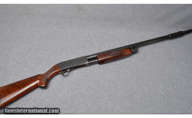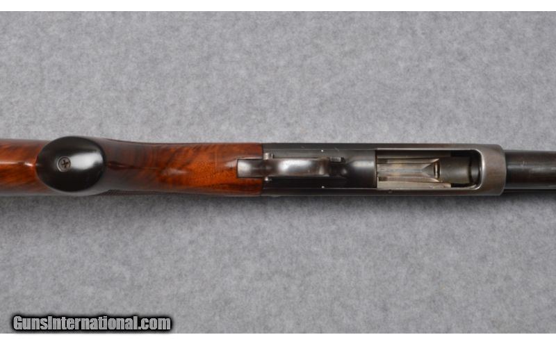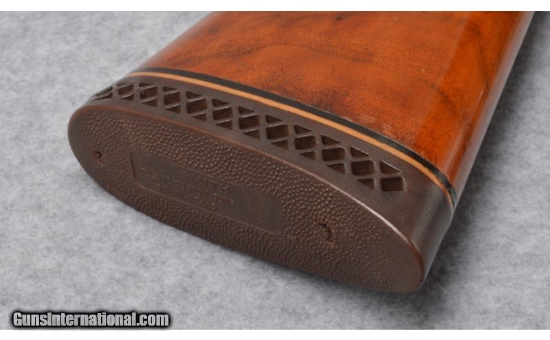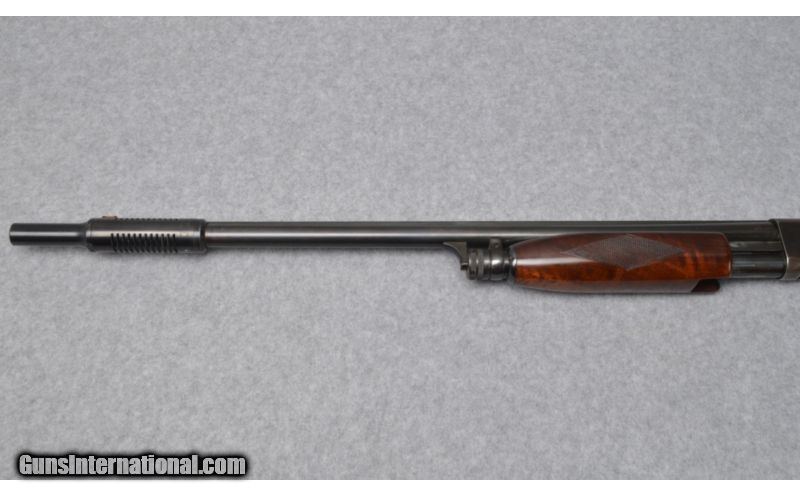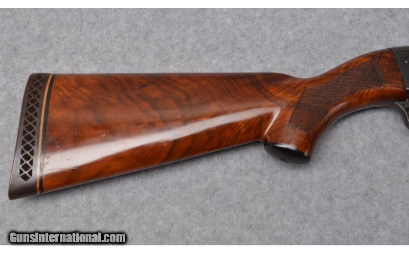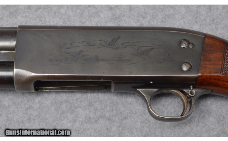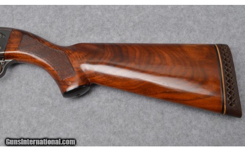Description: This is a nice Ithaca 37R Deluxe Featherweight 12 Ga. pump action shotgun. The barrel is blued 22” which extends to 28” with the Cutts compensator. It is has an improved modified choke installed. The receiver is engraved and features ducks in flight and pheasants in flight with a hunting dog on point in outdoor scenes. The walnut stock and fore end are checkered and highly figured. Overall a very nice shotgun gun with some light wear and handling marks. SOLD Caliber Info: 12 Ga. Chambers: 2-3/4" pump action. Metal Condition: Very good. Wood Condition: Very good. Bore Condition: Bright and shiny. Barrels: 28" blued with Cutts compensator. Triggers: Factory steel trigger. Stock: Highly figured walnut with checkered pistol grip and black grip cap. Stock Dimensions: 14" length of pull. Fore End: Matching checkered walnut fore end, highly figured. Butt Pad: Brown rubber ventilated type. Weight: 7 lb 12 oz. Sights: Mid brass bead, red fiber optic front on the Cutts. Chokes: Poly choke improved modified. Item Location: West Chester, OH |