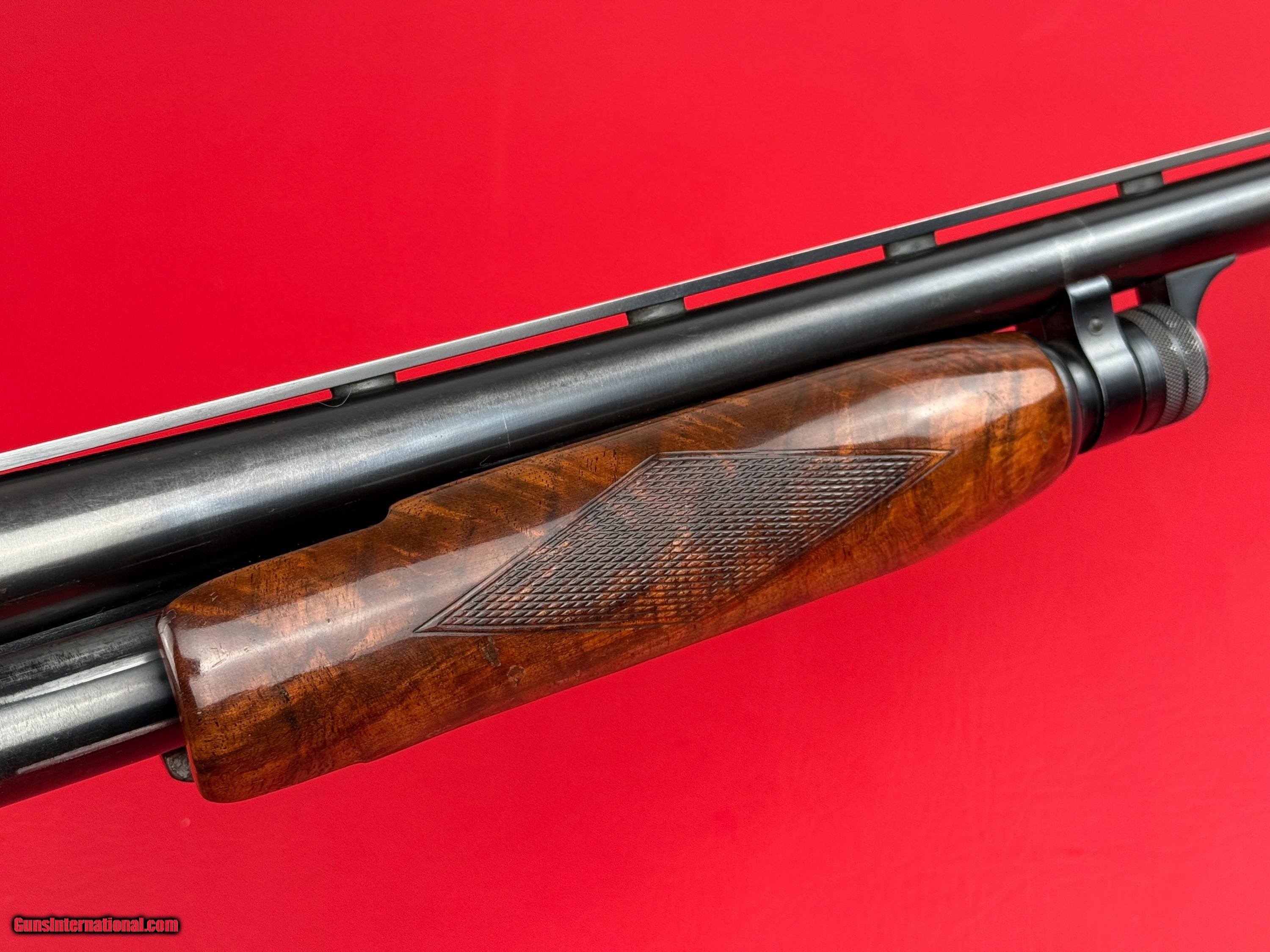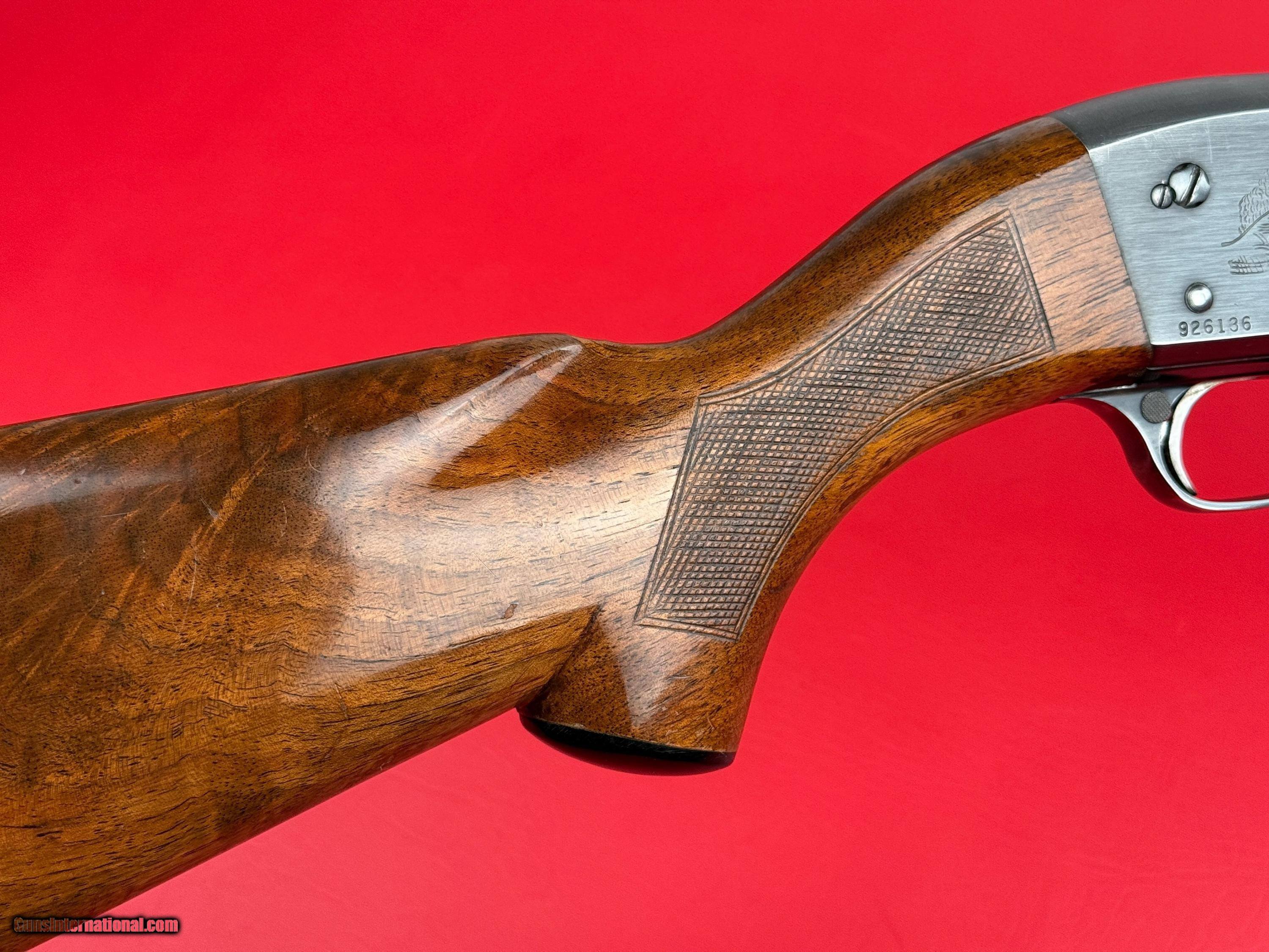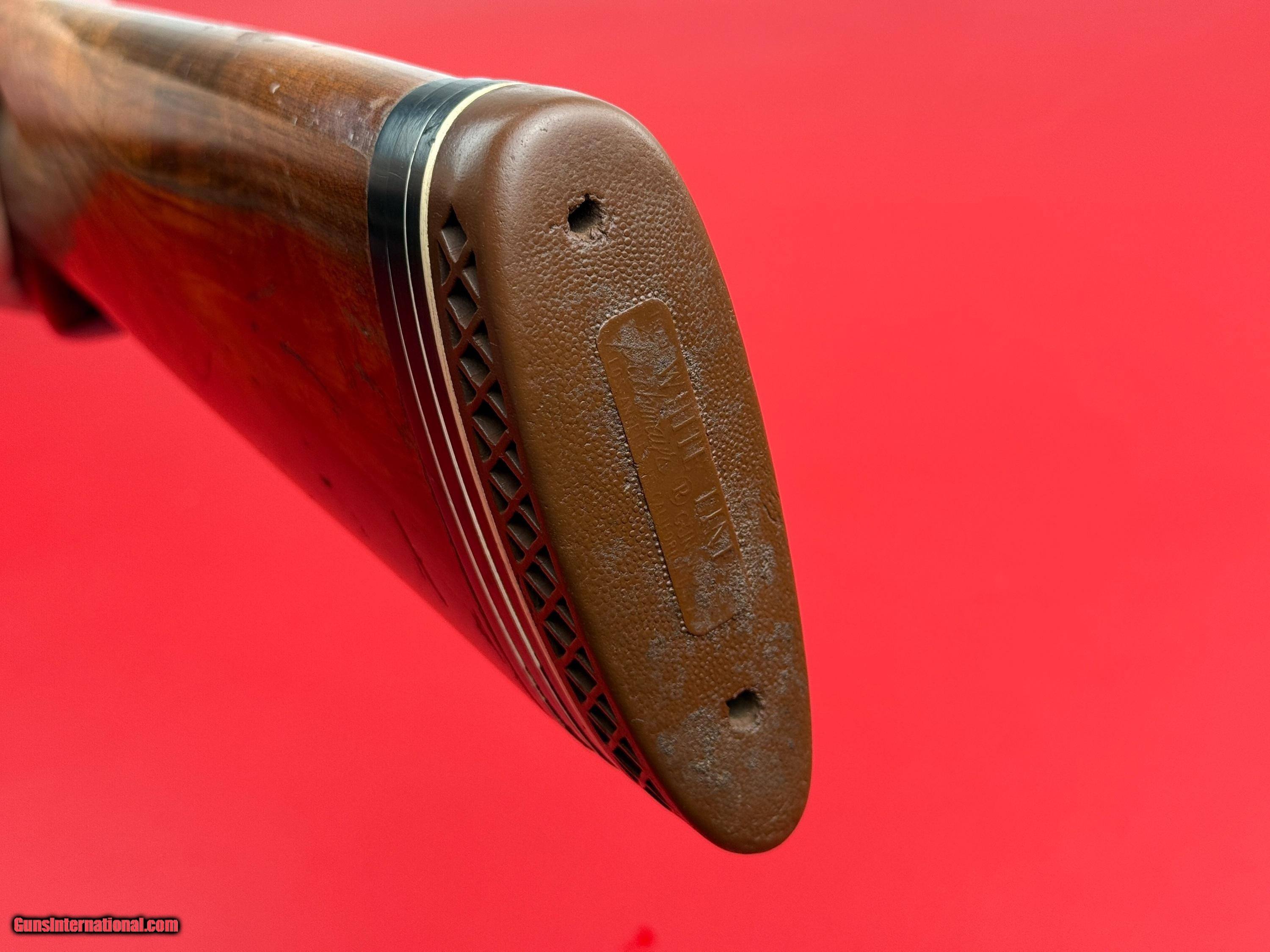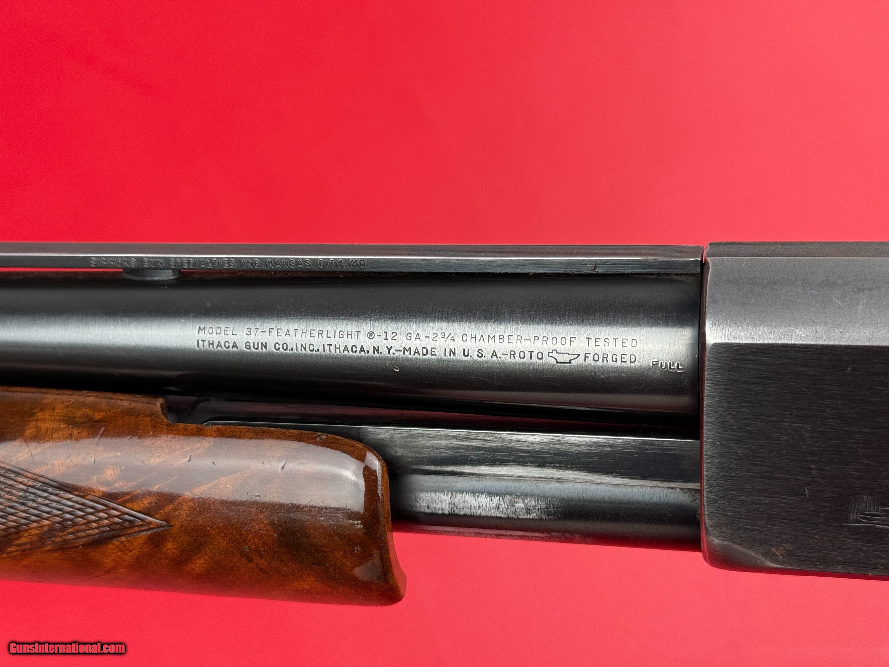 Description: The Ithaca Model 37 Featherlight 12GA is a legendary pump-action shotgun. First introduced in 1937 and still in production today. Based off the serial number this shotgun was manufactured in the early 1960s. The finish overall looks great, only showing some wear on the tube and the edges of the receiver. There are some light scratches throughout but nothing that stands out. The barrel is 30” in length with a Simmons vent rib. It is held by a beautiful walnut stock & forearm free of any cracks or nicks affecting the integrity, however the finish you can see if wore in some spots causing a chipped look and the stock does show some dents on the top. If this wood was refinished with a more natural finish, it would make an all around excellent looking shotgun. For full photo album ask us for the link! SPECS: