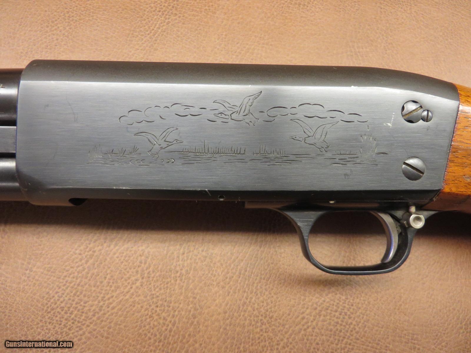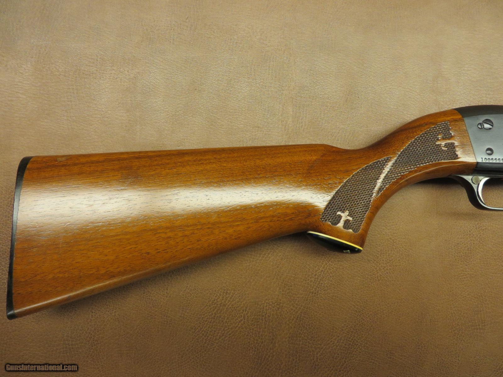 Description: 16 ga. has 26 inch improved cylinder choke plain barrel with original Ray-Bar front sight. Engraved receiver serial number 1005xx. Checkered walnut stock with pistol grip cap and original butt plate. Fluted non checkered walnut forend. Barrel blue and wood finish are 98%. The receiver is 95%. SOLD |