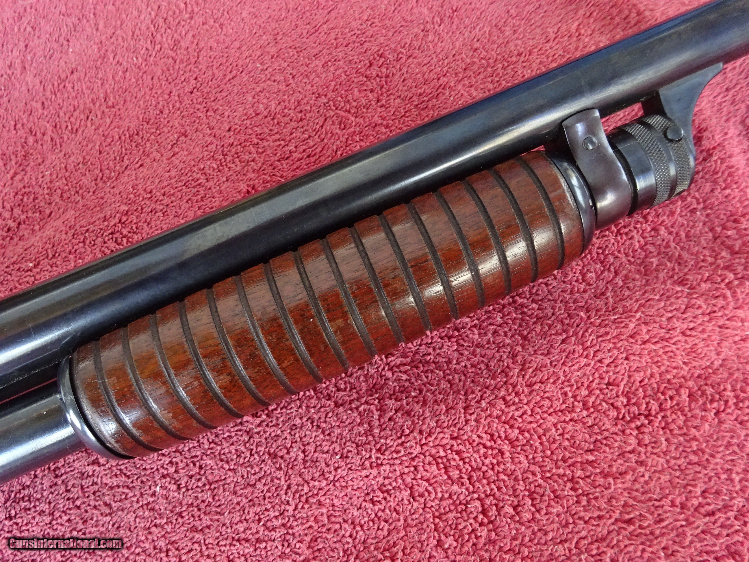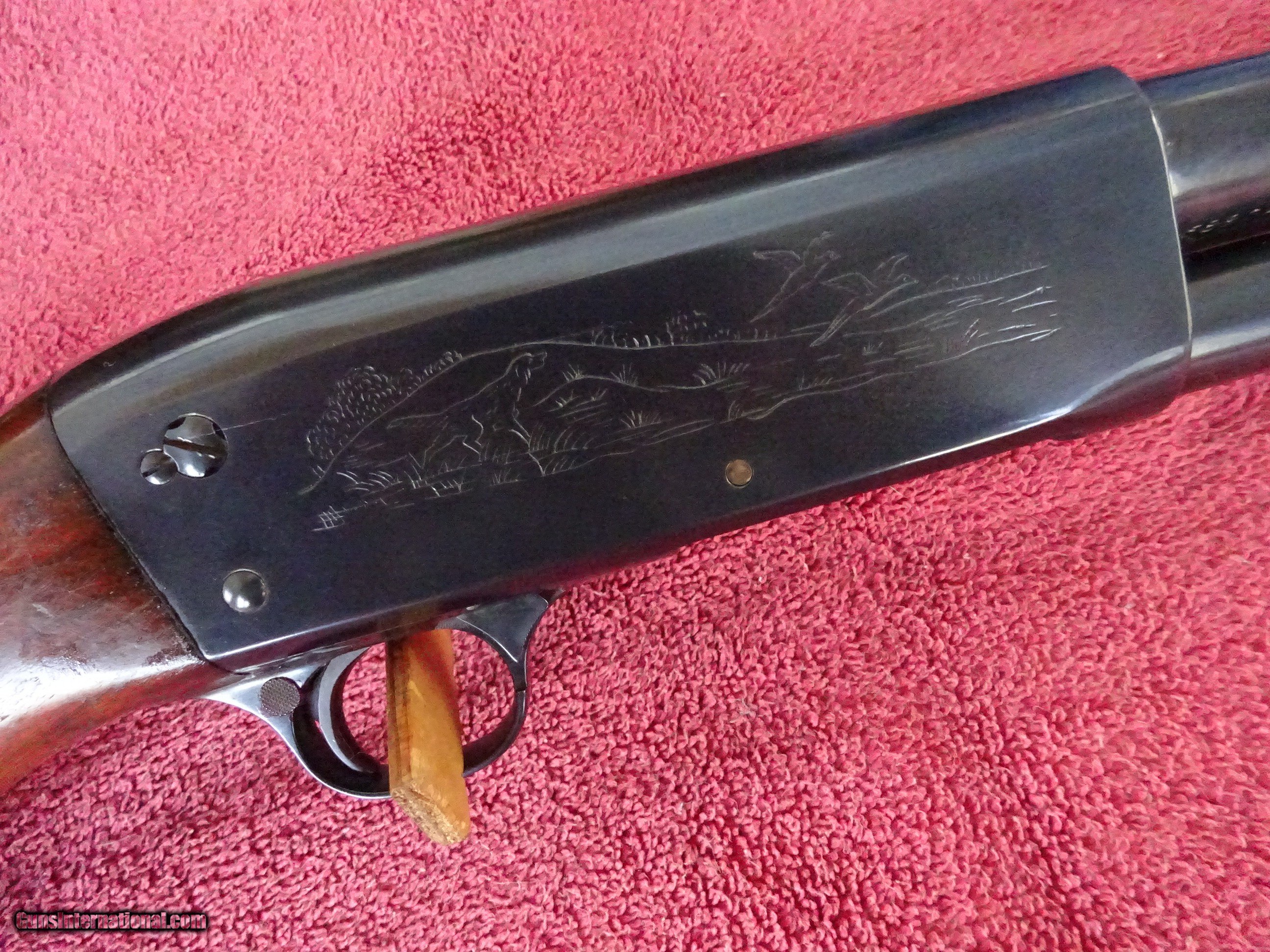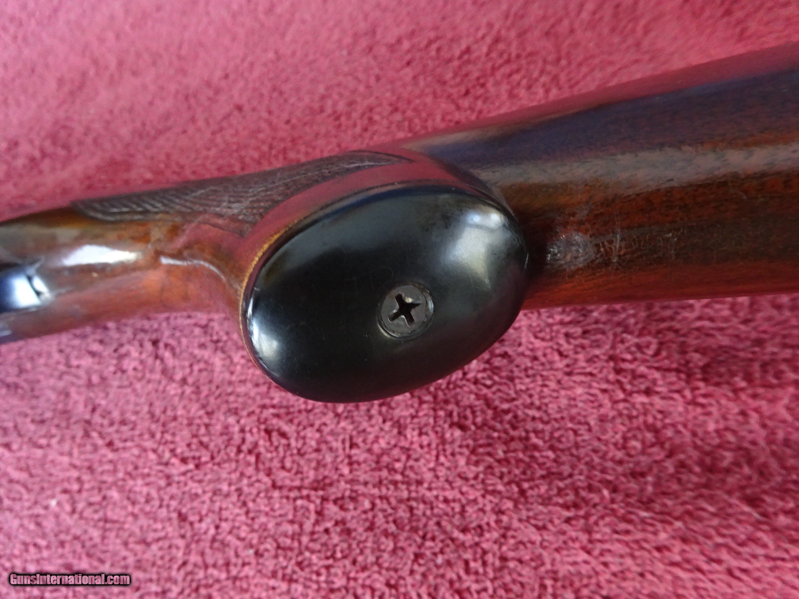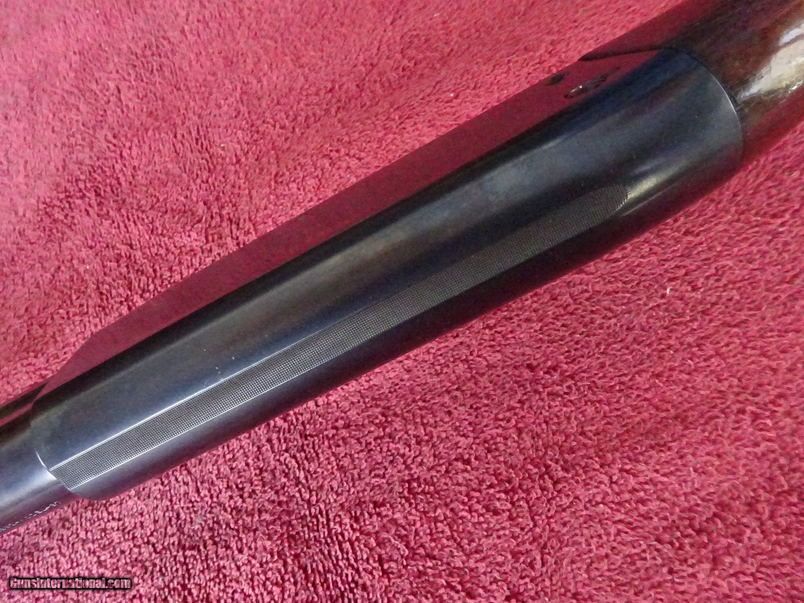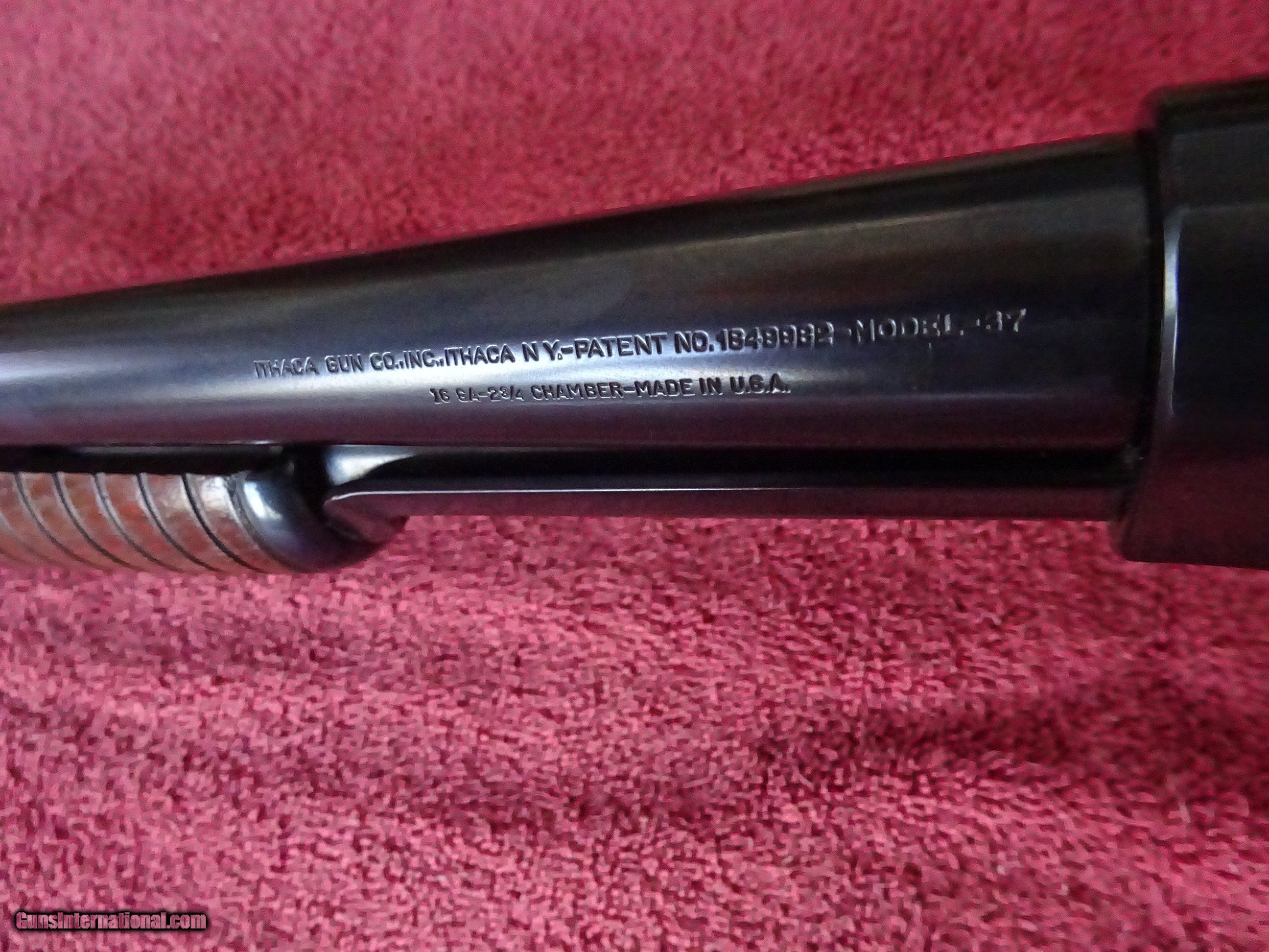 Description: ITHACA MODEL 37 FEATHERWEIGHT 16 GAUGE. MODIFIED 28" BARREL, 2 3/4" CHAMBER, SINGLE BEAD SIGHT, MIRROR PERFECT BORE, EXCELLENT OVERALL BRIGHT ORIGINAL BLUE. STANDARD ENGRAVING PATTERN WITH HUNTING DOG AND PHEASANTS ON RIGHT SIDE AND DUCKS IN FLIGHT ON LEFT SIDE. PISTOL GRIP STOCK, SMALL RIBBED FOREARM, ATTRACTIVE DARK FIGURED SOOD, SHARP CHECKRING. NORMAL HANDLING MARKS IN THE VARNISH. ORIGINAL GRIP CAP AND ITHACA MARKED BAKELITE BUTTPLATE, 14 1/4" LENGTH OF PULL, 6 POUNDS 4 OUNCES. MADE IN 1948, 100% ORIGINAL CONDITION. $775.00 + $70.00 Insured shipping to an FFL address. Layaway is available. See all Pats gun listings on this site! We also have hundreds of ORIGINAL gun company advertising & memorabilia pieces available for sale on our site SPORTINGCOLLECTIBLES. We have no reprints or reproductions. Email for more information. If you need to call, morning or evening is best, and please note the Seller's Inventory number. SOLD Curio/Relic: Yes |